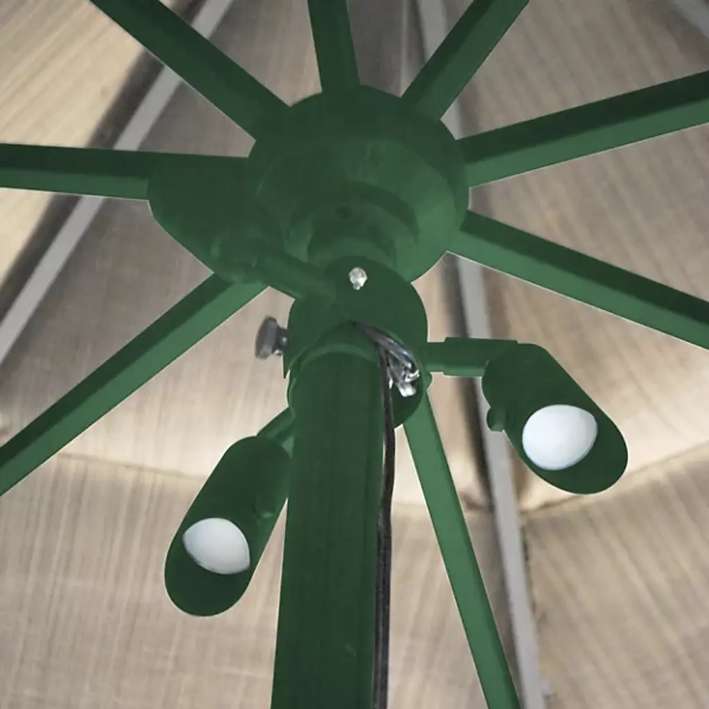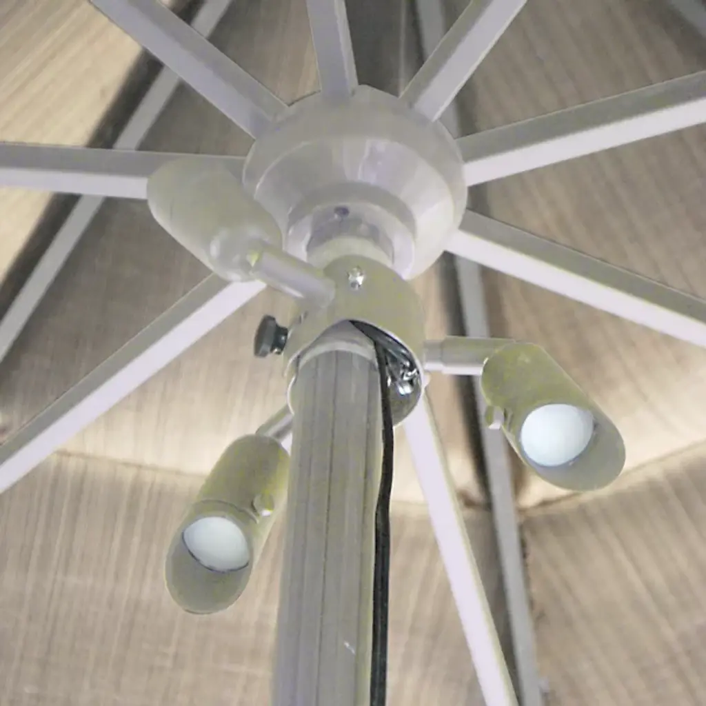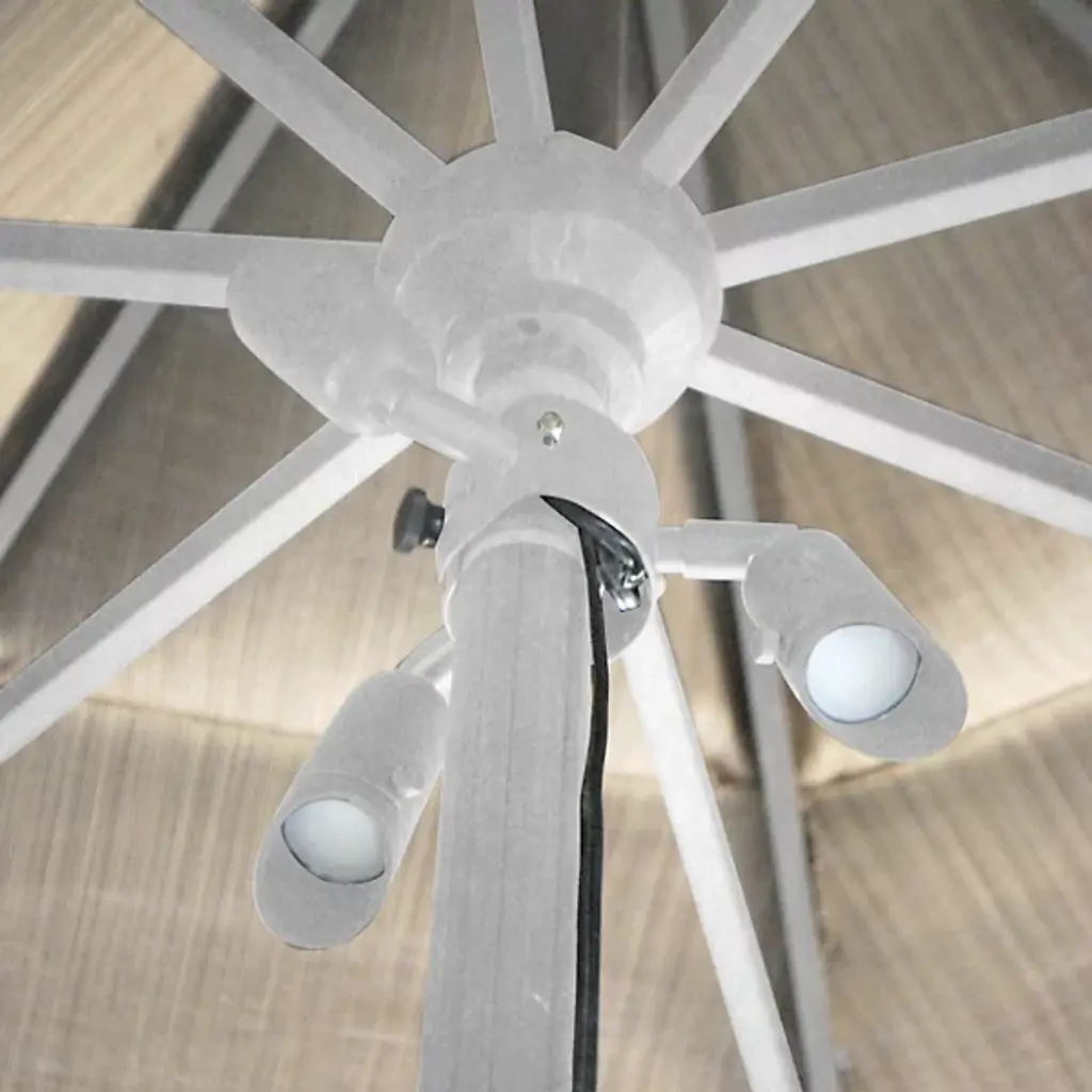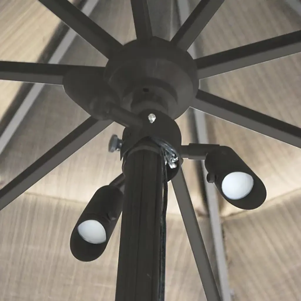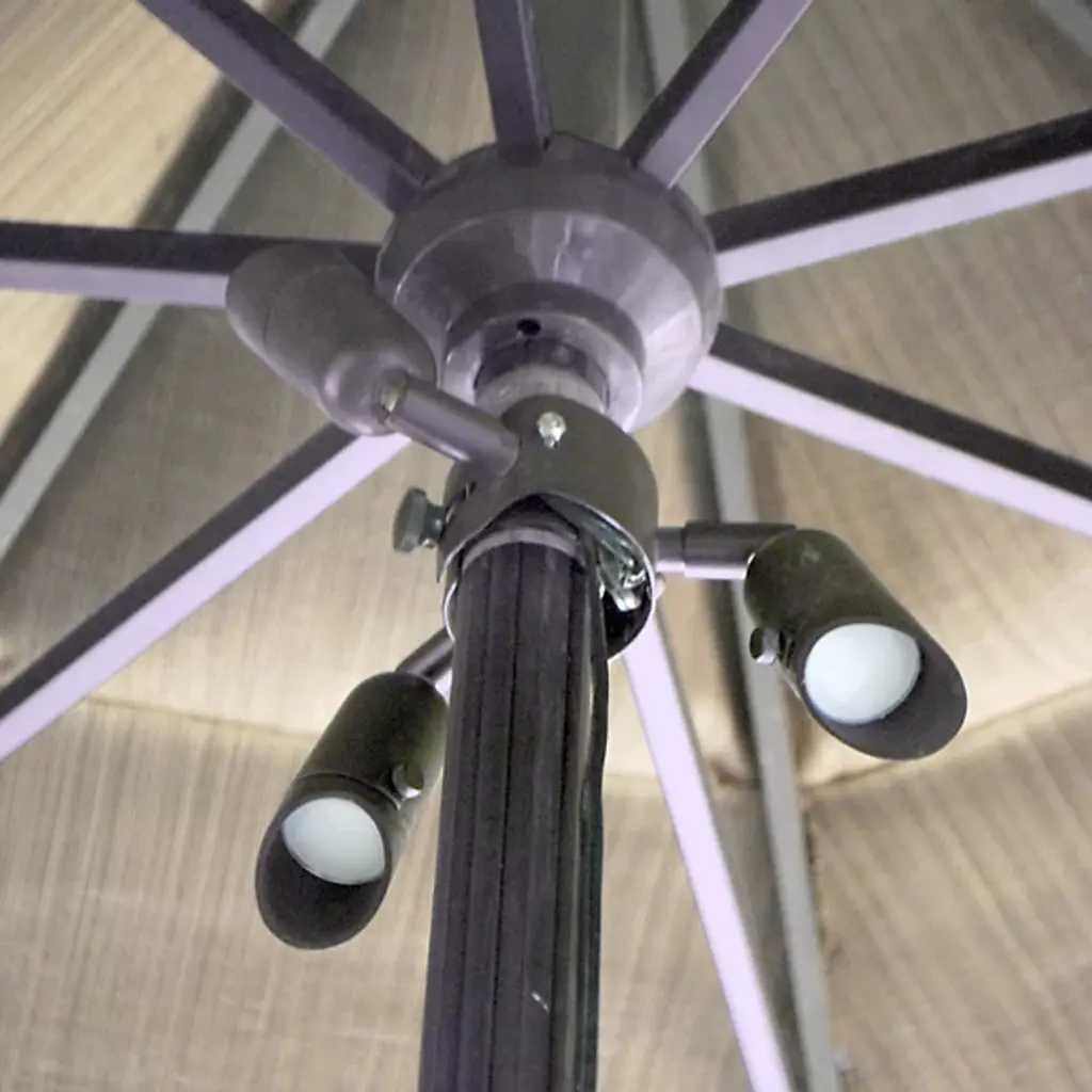 Just because you want a little shade doesn’t mean you have to sit in the dark! The Focus Industries Aluminum LED Umbrella Lights (one complete unit) fits snuggly on your umbrella pole with a heavy duty, adjustable aluminum bracket and has three independently adjustable heads that direct light where you need it most. Connects to a 12v landscaping electrical system via a 10 ft black wire that leads from the fixture. Transformer is necessary but not included.