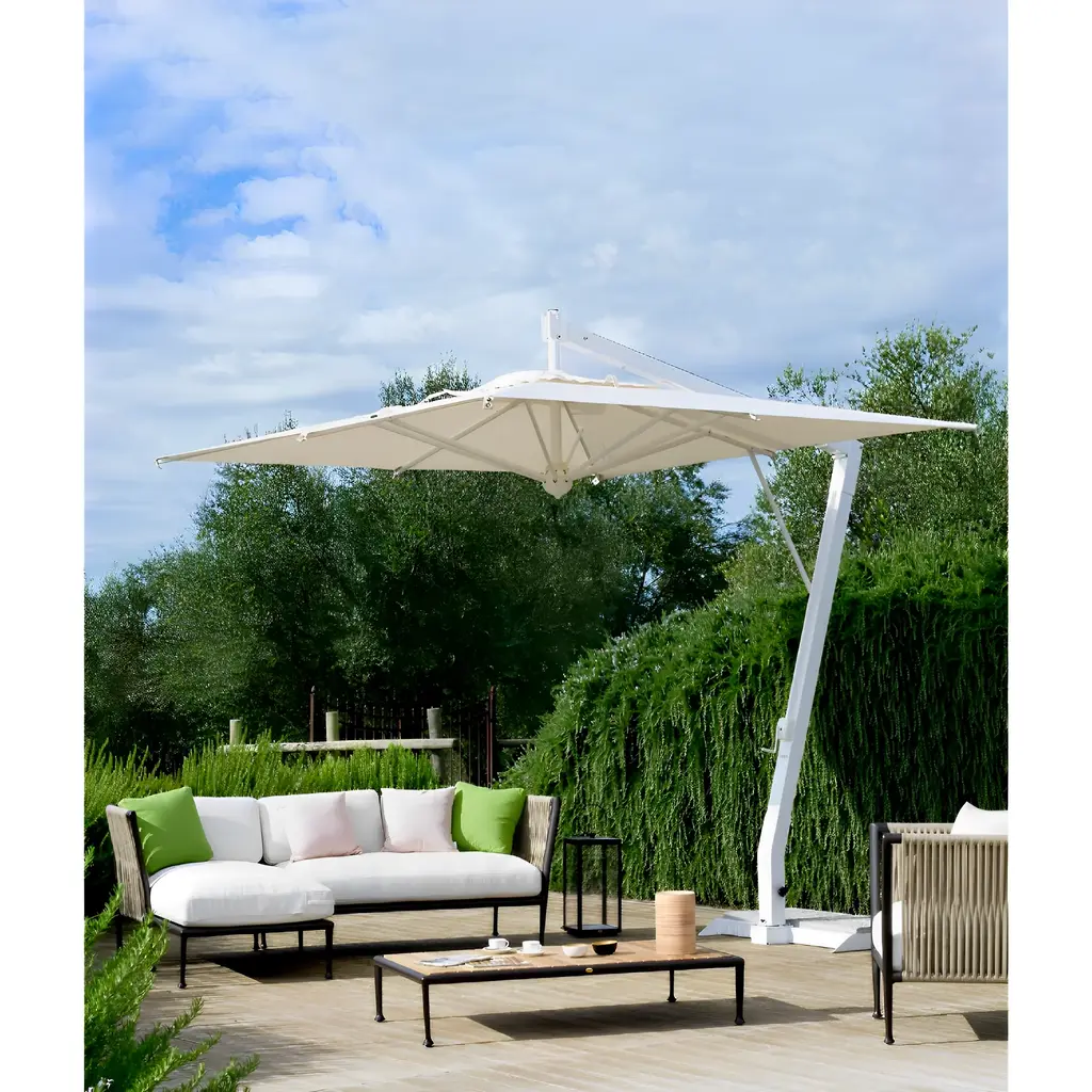 Introducing the luxurious and sophisticated Aluminum Square Garden Umbrella from Unopiu Salento. This elegant and exclusive piece is perfect for creating a shaded oasis in any outdoor setting. With a sturdy graphite or white aluminum side arm and a 100% raw white acrylic fabric cover supported by slats, this umbrella is both stylish and practical. Enjoy the outdoors in comfort and style with Unopiu Salento.