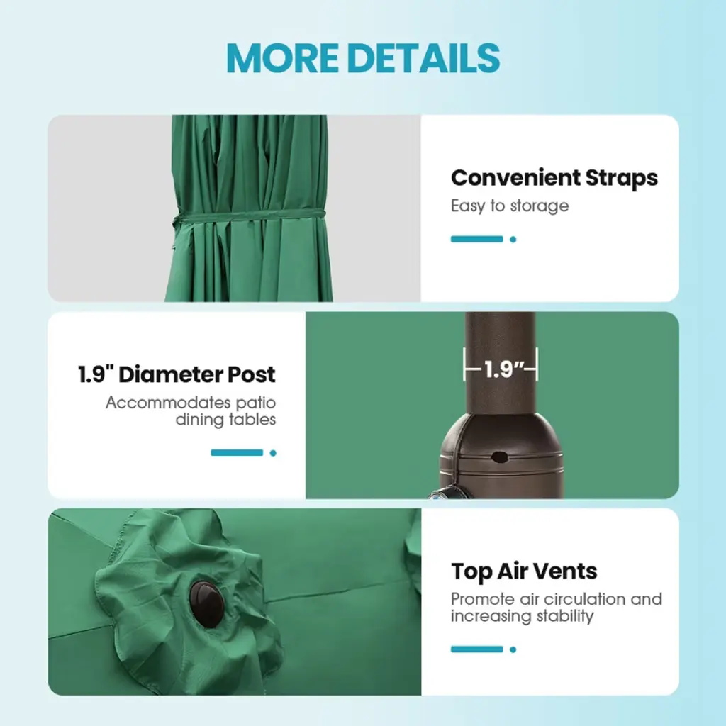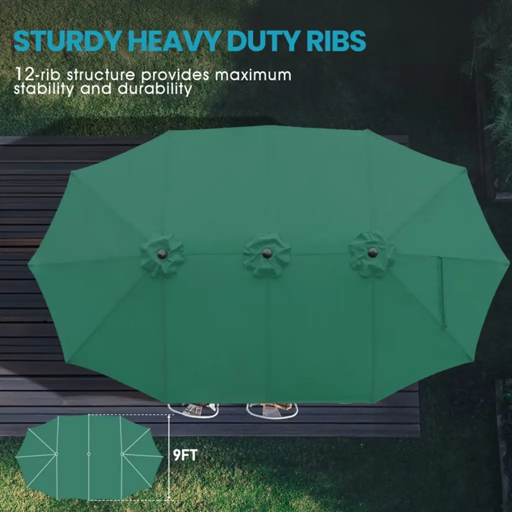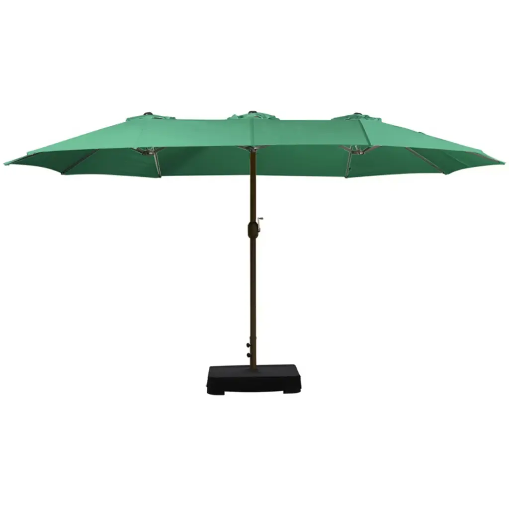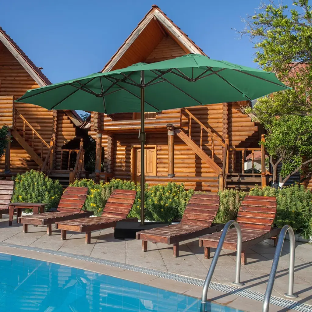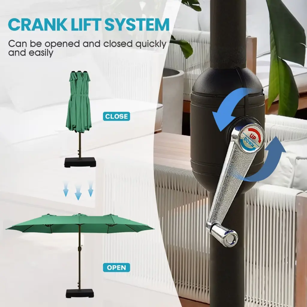 The Aoodor 15 ft Double-Sided Patio Umbrella provides an extra-large shade area for outdoor heat protection. Its reinforced ribs and rust-free steel frame ensure long-term durability. The smooth-operating metal crank – made of durable aluminum alloy – resists damage during operation. Featuring UV-resistant fabric with PU coating, the canopy withstands scorching sun. Designed for easy assembly and robust performance, this umbrella stands the test of time.