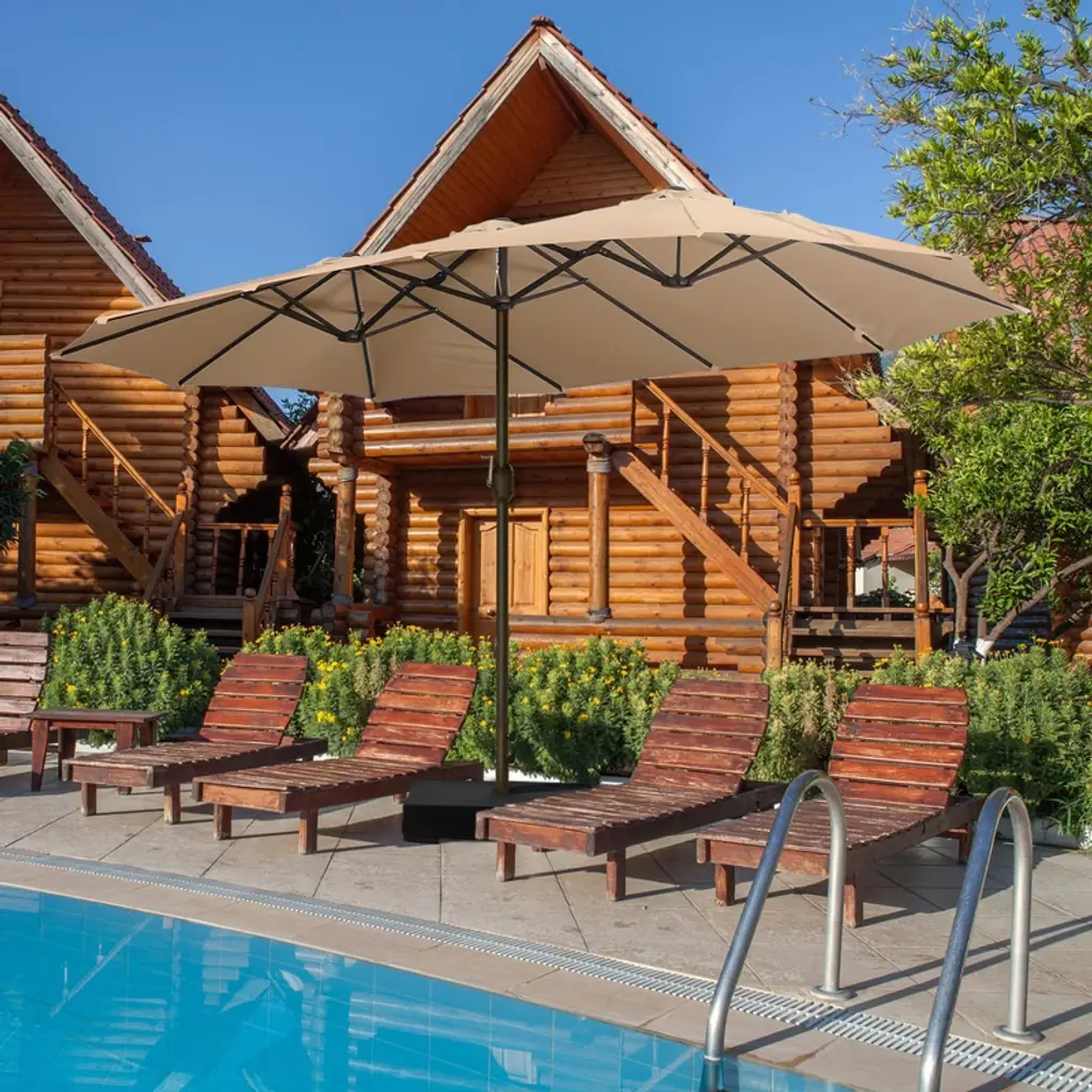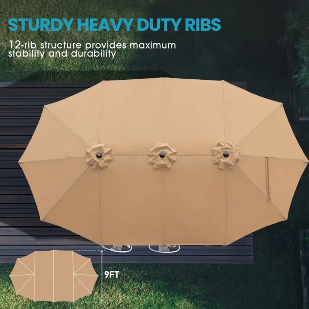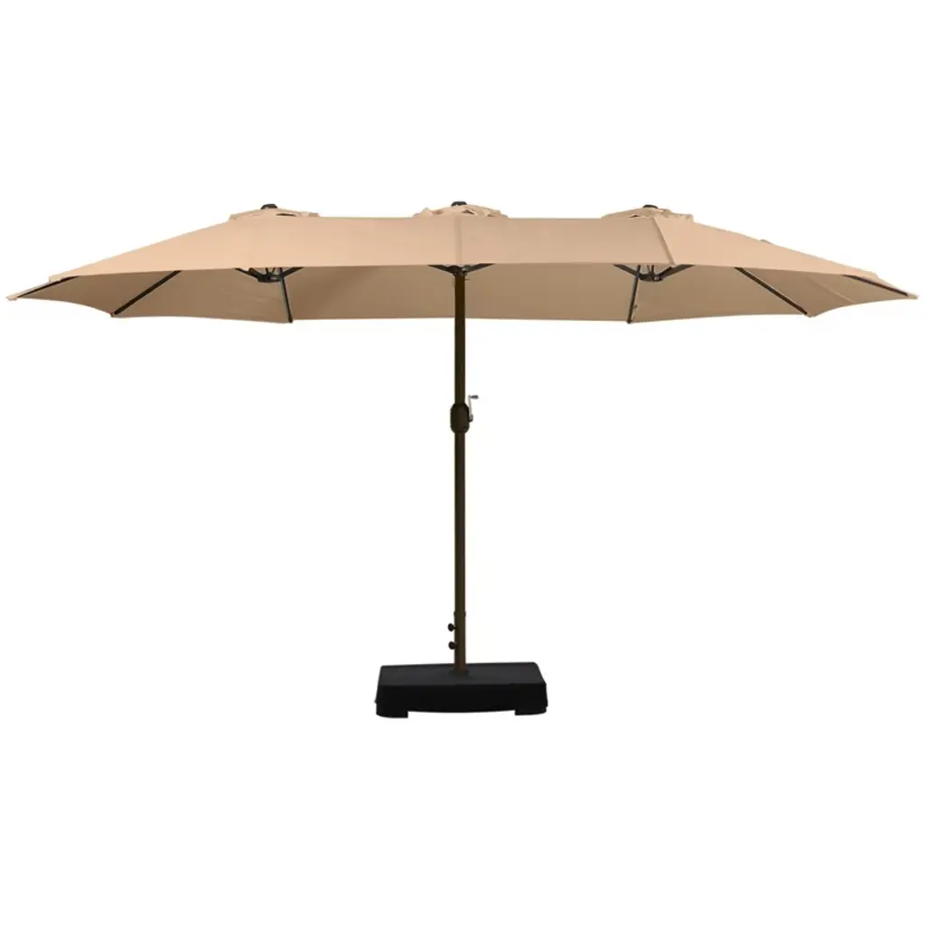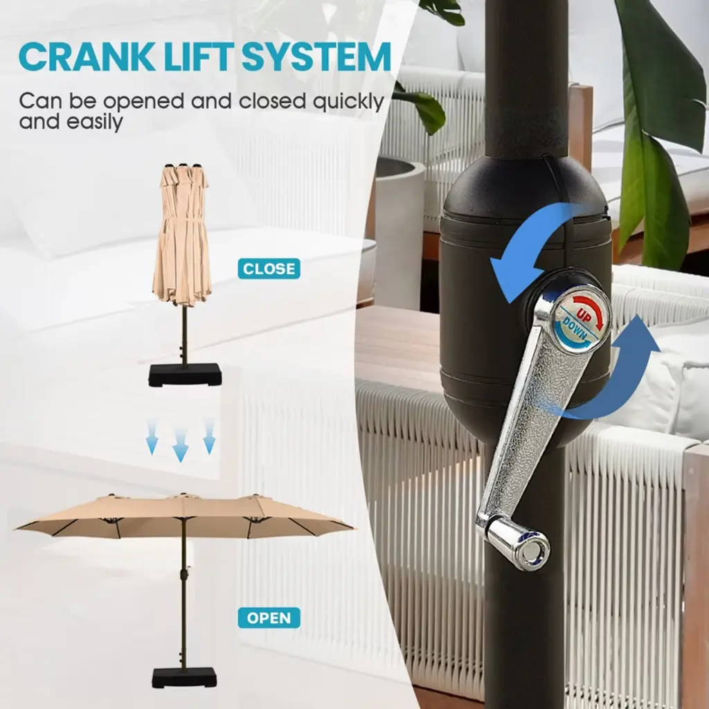 The Aoodor 15 ft Double-Sided Patio Umbrella provides an extra-large shade area for outdoor heat protection. Its reinforced ribs and rust-free steel frame ensure long-term durability. The smooth-operating metal crank – made of durable aluminum alloy – resists damage during operation. Featuring UV-resistant fabric with PU coating, the canopy withstands scorching sun. Designed for easy assembly and robust performance, this umbrella stands the test of time.