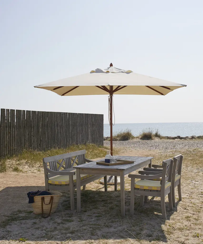 Take shelter from the sun and enjoy a nice outdoor lunch under the Atlantis umbrella. A double-pulley system makes is easy for everyone to fold up the umbrella. The round pole is a perfect match for most outdoor tables with an umbrella hole, or the umbrella can be purchased with a custom-designed foot, made from concrete and stainless steel The Teflon-treated fabric has been leather-reinforced to enhance its strength. The Teflon-treatment makes it water and dirt repellent; however, please note that the fabric is not 100% waterproof.From Skagerak, a family-owned Scandinavian company with over four decades of experience creating sustainable furniture and home goods.
