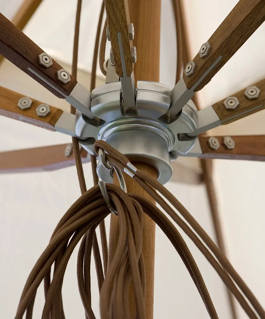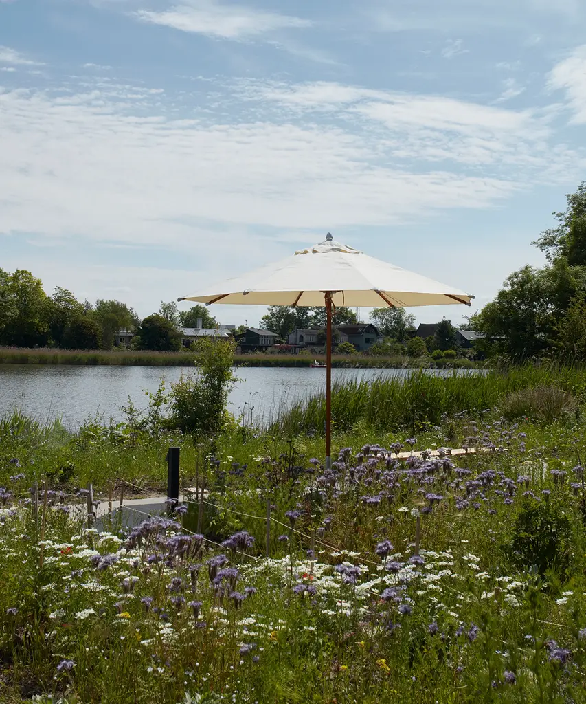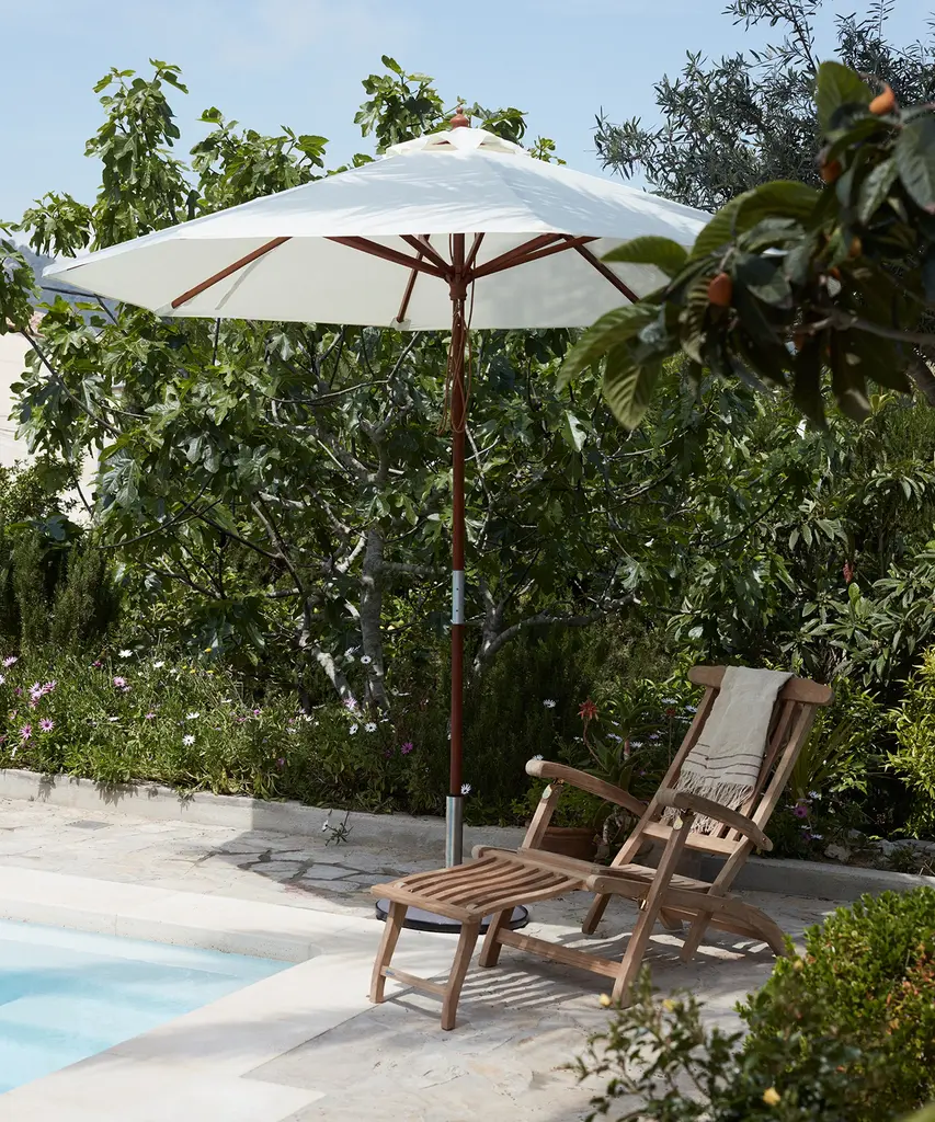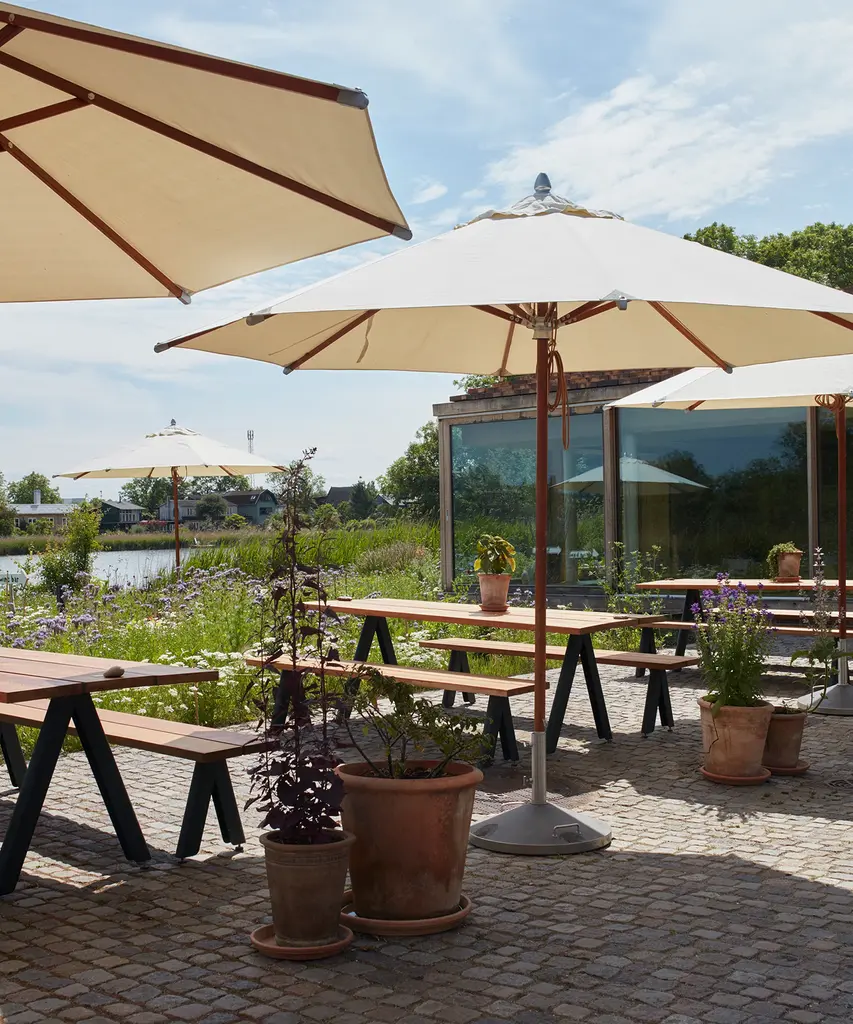 Take shelter from the sun and enjoy a nice outdoor lunch under the Atlantis umbrella. A double-pulley system makes is easy for everyone to fold up the umbrella. The round pole is a perfect match for most outdoor tables with an umbrella hole, or the umbrella can be purchased with a custom-designed foot, made from concrete and stainless steel The Teflon-treated fabric has been leather-reinforced to enhance its strength. The Teflon-treatment makes it water and dirt repellent; however, please note that the fabric is not 100% waterproof.From Skagerak, a family-owned Scandinavian company with over four decades of experience creating sustainable furniture and home goods.