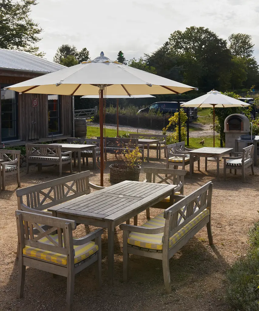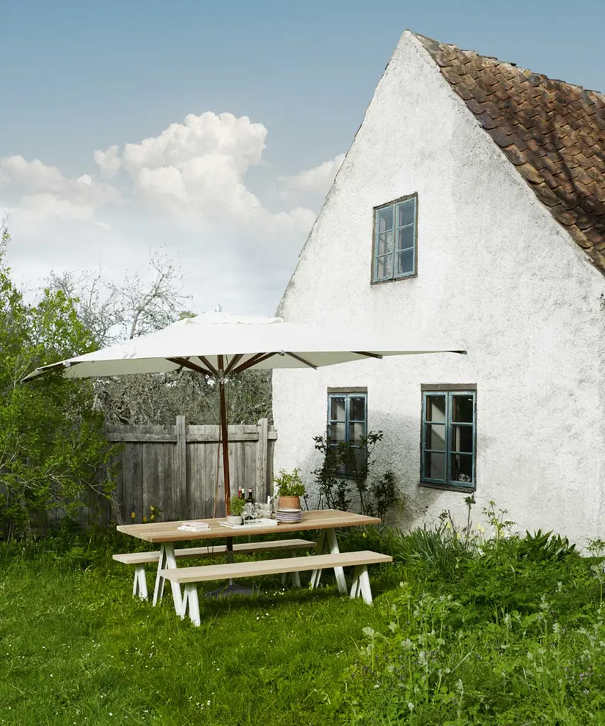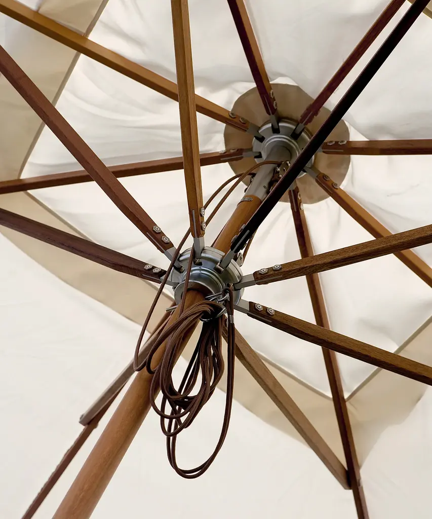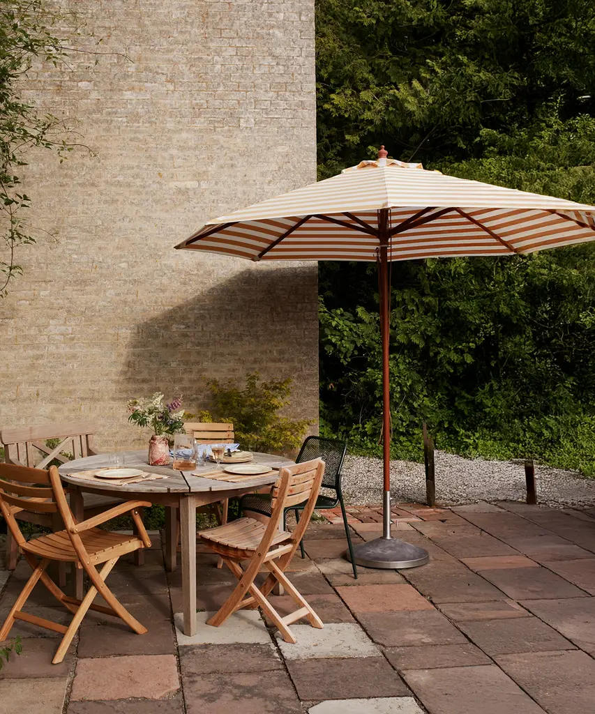 Take shelter from the sun and enjoy a nice outdoor lunch under the Atlantis umbrella. A double-pulley system makes is easy for everyone to fold up the umbrella. The round pole is a perfect match for most outdoor tables with an umbrella hole, or the umbrella can be purchased with a custom-designed foot, made from concrete and stainless steel The Teflon-treated fabric has been leather-reinforced to enhance its strength. The Teflon-treatment makes it water and dirt repellent; however, please note that the fabric is not 100% waterproof.From Skagerak, a family-owned Scandinavian company with over four decades of experience creating sustainable furniture and home goods.