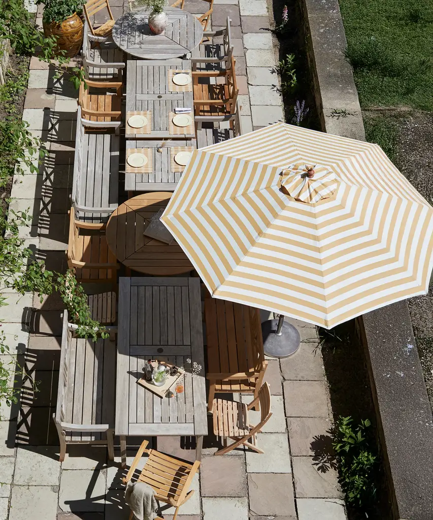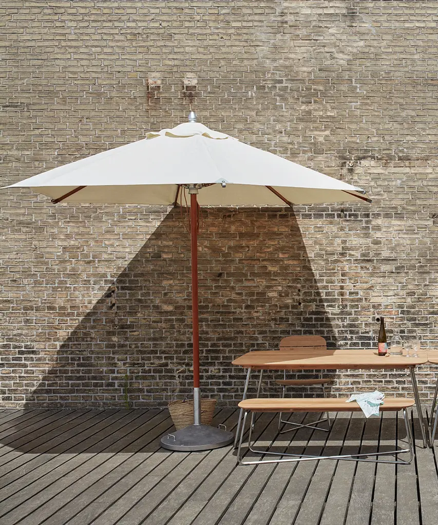 Take shelter from the sun and enjoy a nice outdoor lunch under the Atlantis umbrella. A double-pulley system makes is easy for everyone to fold up the umbrella. The round pole is a perfect match for most outdoor tables with an umbrella hole, or the umbrella can be purchased with a custom-designed foot, made from concrete and stainless steel The Teflon-treated fabric has been leather-reinforced to enhance its strength. The Teflon-treatment makes it water and dirt repellent; however, please note that the fabric is not 100% waterproof.From Skagerak, a family-owned Scandinavian company with over four decades of experience creating sustainable furniture and home goods.