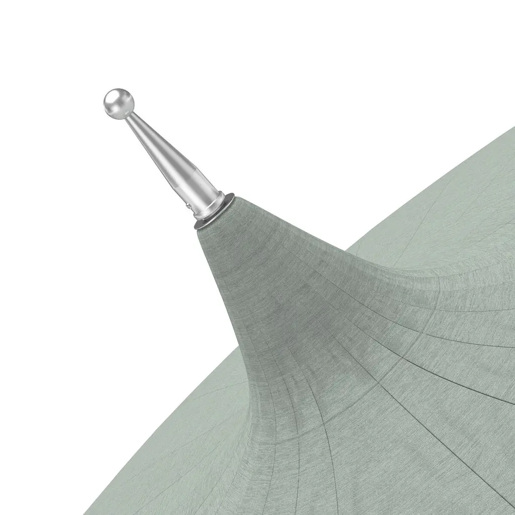 Designed by us and available only at One Kings Lane: Whether you're entertaining or just lounging outdoors, catch some shade in style with this pagoda-style patio umbrella. Its fringed canopy is crafted from durable Sunbrella acrylic to protect against the elements, while its frame is made using a combination of sturdy aluminum and zinc plated steel with a push-open pin stop. An umbrella base is not included but is required for use.