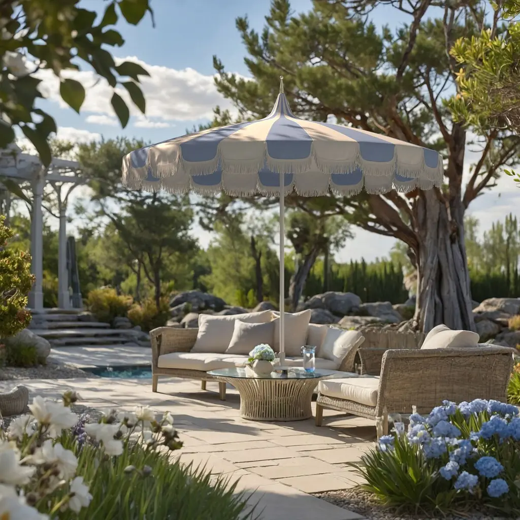 Aya Pagoda Fringe Two-tone Patio Umbrella, Sunbrella