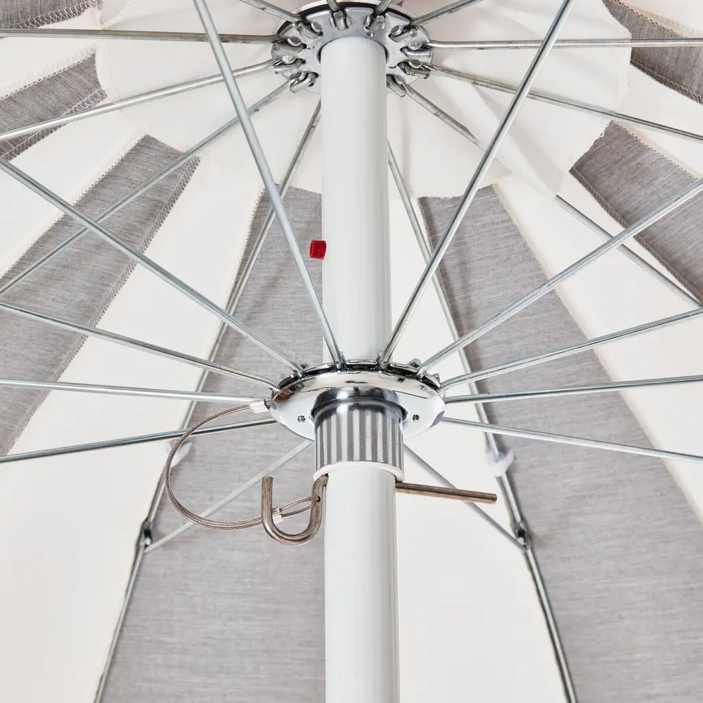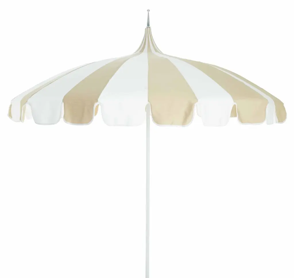 Designed by us and available only at One Kings Lane: Whether you're entertaining or just lounging outdoors, catch some shade in style with this pagoda-style patio umbrella. Its color-blocked canopy is crafted from durable Sunbrella acrylic to protect against the elements, while its frame is made using a combination of sturdy aluminum and zinc plated steel with a push-open pin stop. An umbrella base is not included but is required for use.