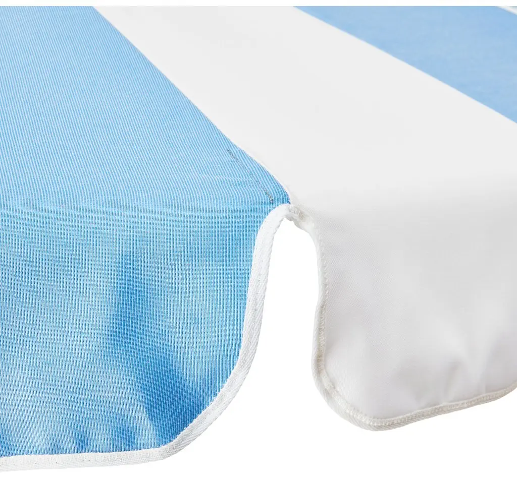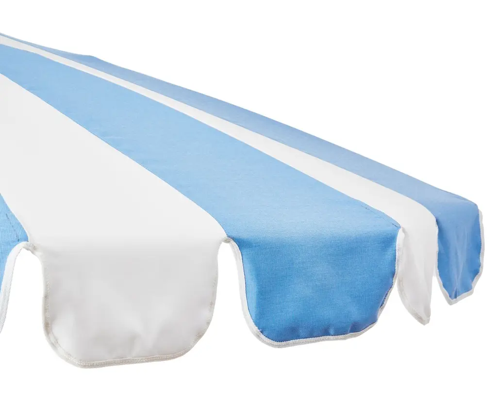 Designed by us and available only at One Kings Lane: Whether you're entertaining or just lounging outdoors, catch some shade in style with this pagoda-style patio umbrella. Its color-blocked canopy is crafted from durable Sunbrella acrylic to protect against the elements, while its frame is made using a combination of sturdy aluminum and zinc plated steel with a push-open pin stop. An umbrella base is not included but is required for use.