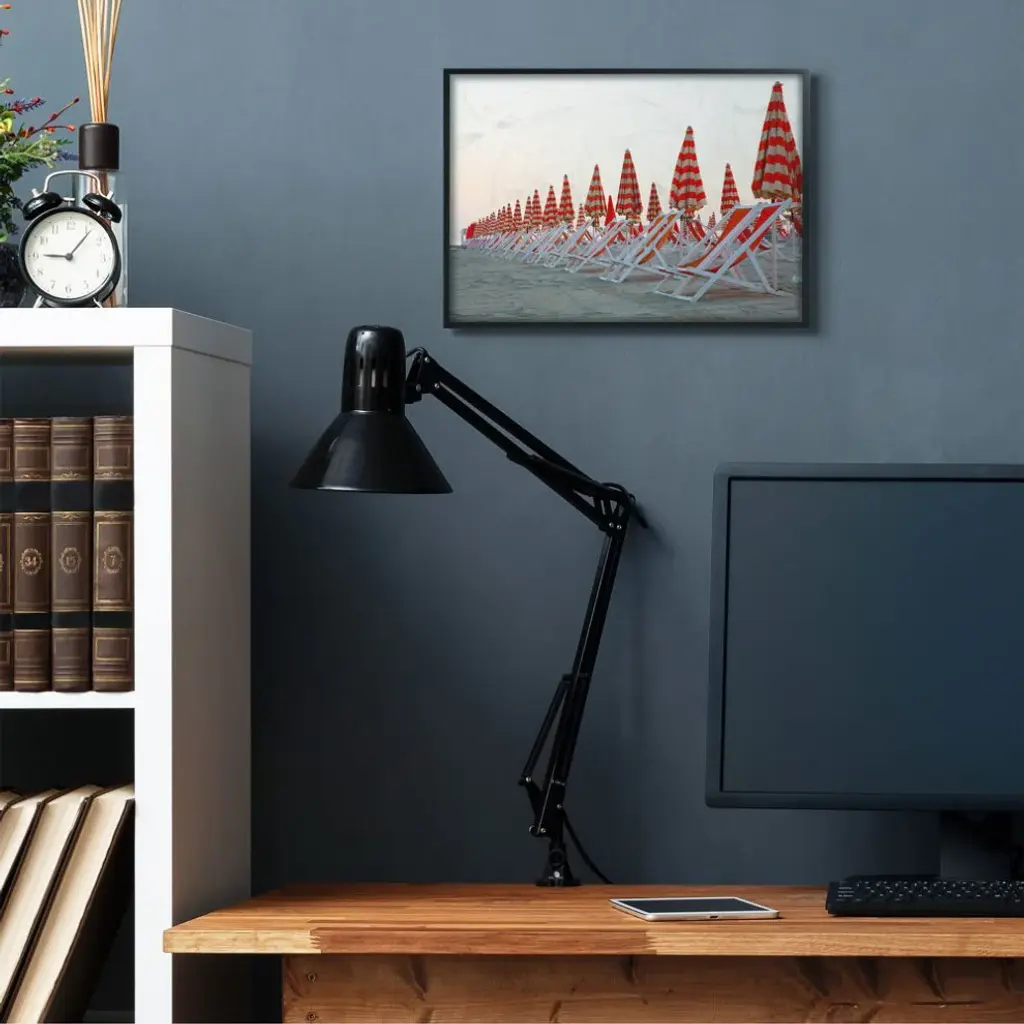 Beach Chair Row With Umbrellas Red Tan Photograph,1pc, Each 16 X 20