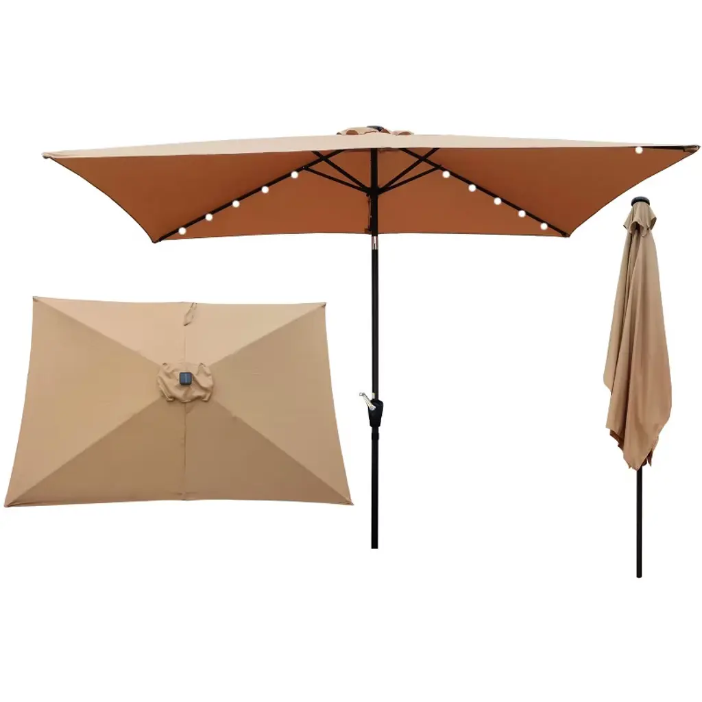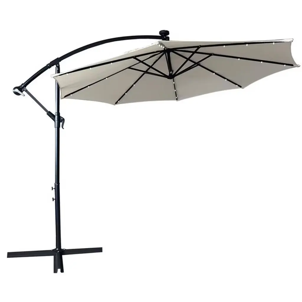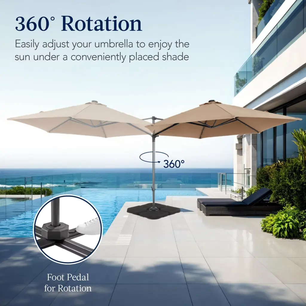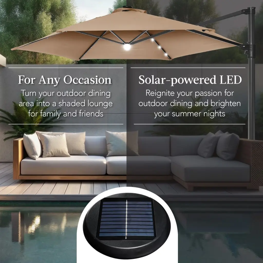 Enjoy maximum shade with our new 360 LED Cantilever Offset Umbrella. It's designed to conveniently rotate a full 360 desgress; simply step on the foot pedal and turn the pole with your hands! Solar-powered LED lights ensure the party is on well past sunset, providing up to 6-7 hours of ambient lighting. This umbrella includes a wind vent at the top of the umbrella to allow cool air flowing, and high-quality materials like powder-coated steel and resistant polyester fabric is sure to withstand the elements.