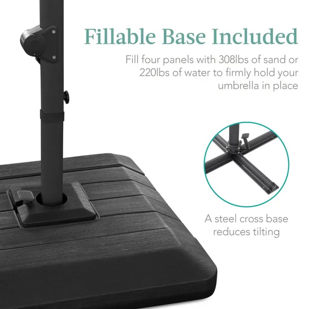 Go big this sunny season with an umbrella built for more! This 10 x10 Offset Cantaliever Umbrella comes complete with a series of features to help set it apart from any umbrella you've used. This umbrella comes with a 2-tier design, with a small gap in between to promote airflow and cool you while you enjoy the shade. It also comes with a free-motion track so you can adjust the angle of the canopy and create ideal shade throughout the day. When the sun goes down, you can still enjoy this umbrella, as 33 solar-powered LED lights illuminate your outdoor entertaining space. Best of all, this umbrella comes with a 4-piece umbrella base, fillable with your choice of sand or water. From every angle, this umbrella is the one for you if you love to enjoy the outdoors with quality and style!