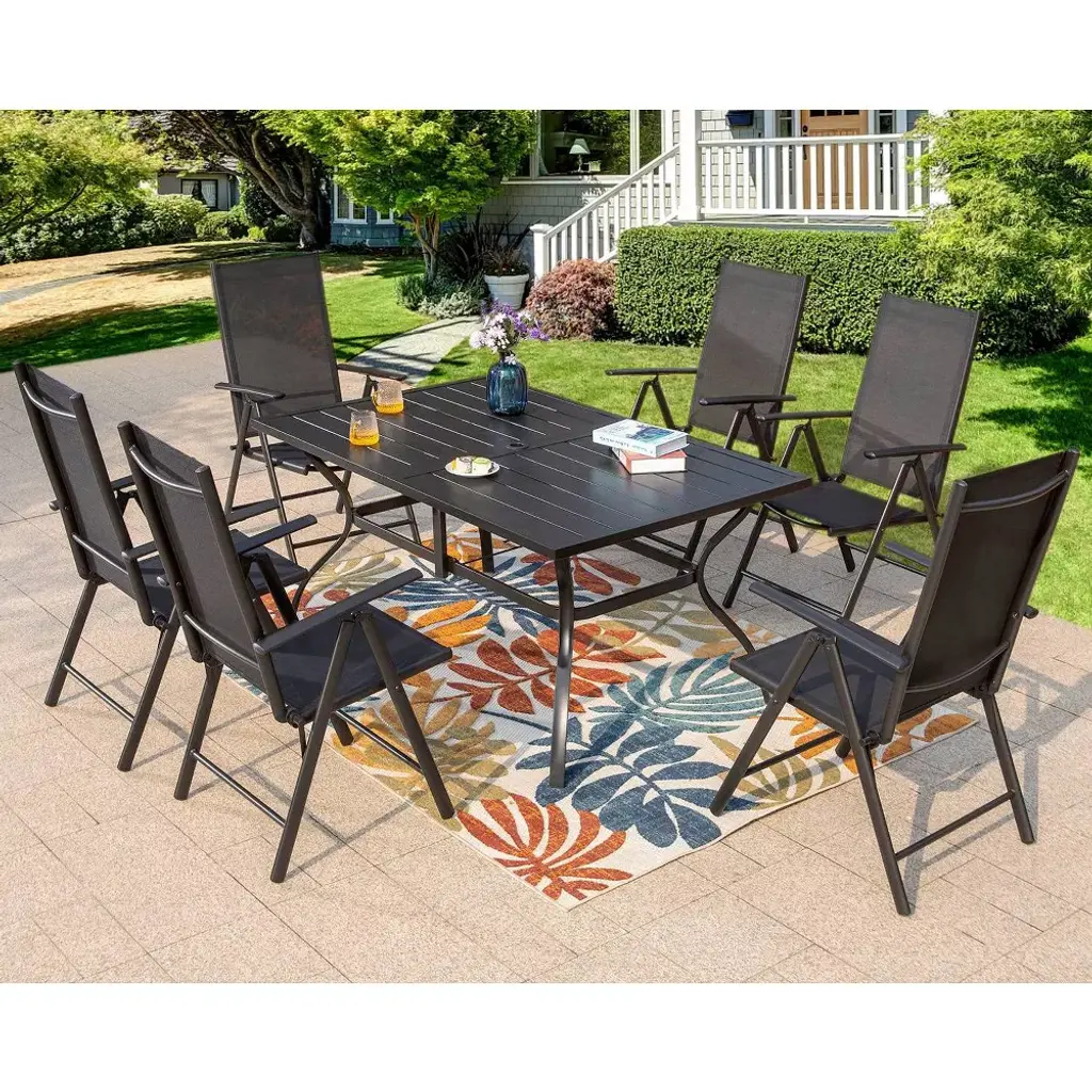 Introducing the perfect centerpiece for your outdoor gatherings, this spacious 75-inch dining table comfortably accommodates up to eight people, making it ideal for family dinners and friendly get-togethers. Crafted with an all-weather, high-density plastic tabletop set on a sturdy steel frame, it promises durability and style for years to come. The table's thoughtful design includes slip-resistant rubber feet, ensuring stability on various surfaces, while a built-in umbrella cutout allows you to enjoy shade on sunny days. Whether it's in your backyard, patio, or poolside area, this versatile piece of furniture not only enhances the aesthetics of your space but also creates an inviting atmosphere for memorable moments with loved ones. Ships and arrives in 2 separate boxes. Delivery times may vary per box.