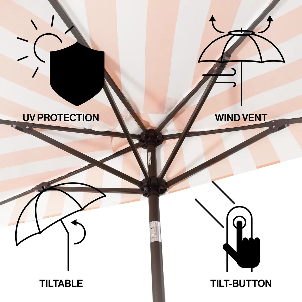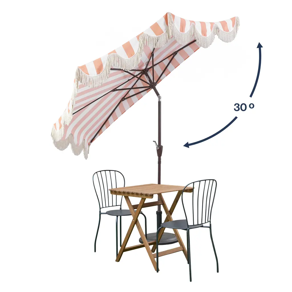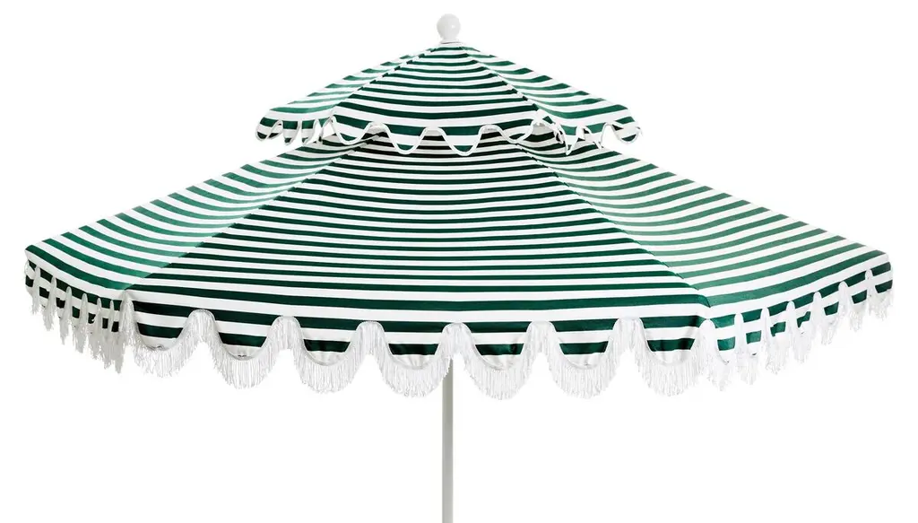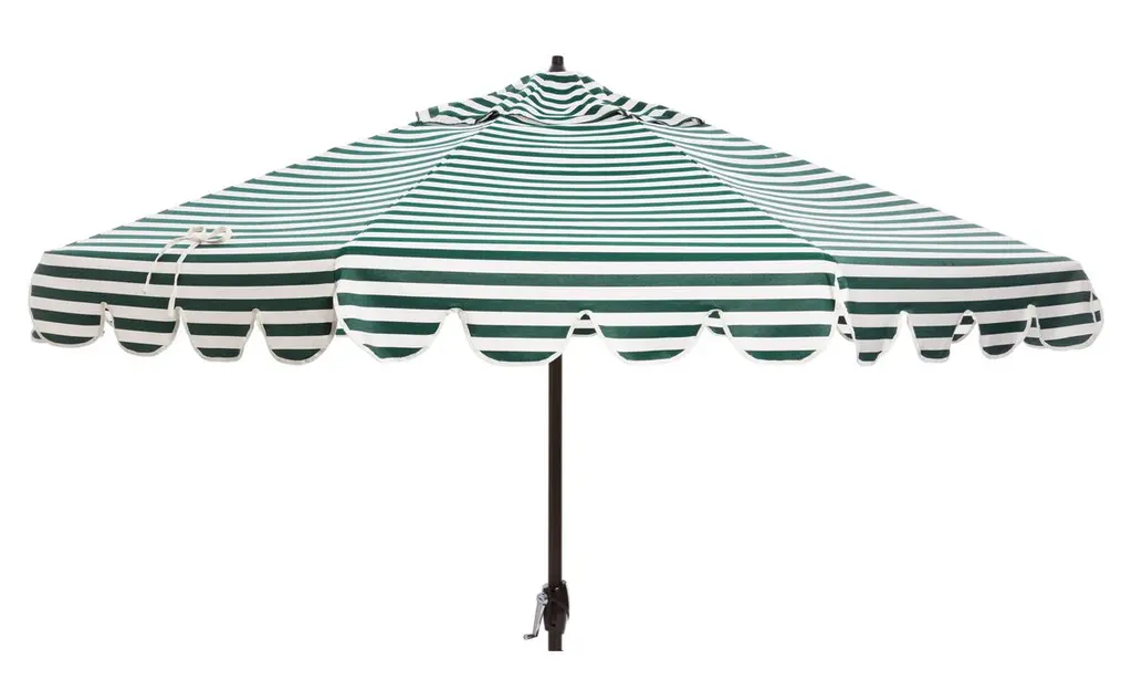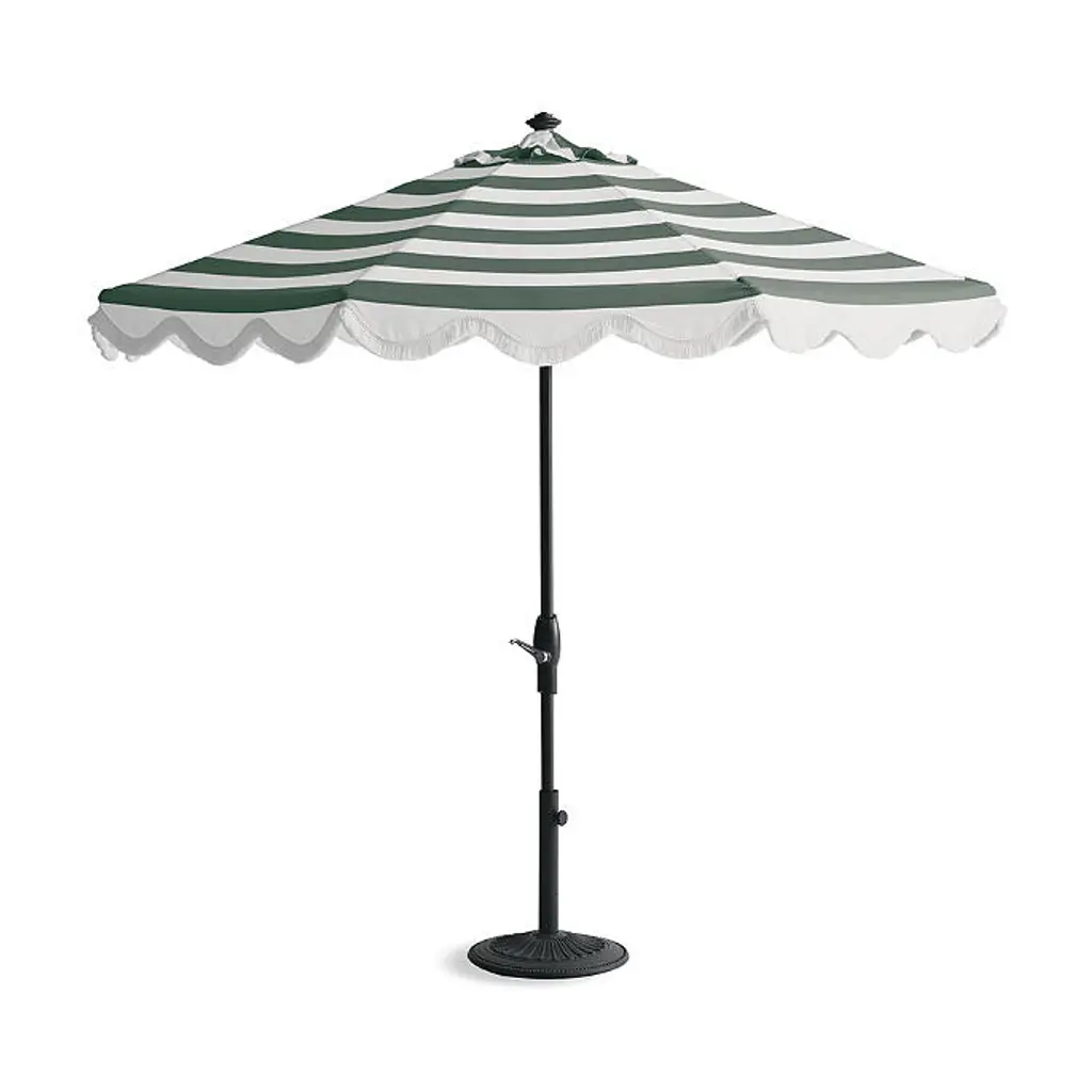 This classic umbrella is the life of the party with its scalloped edges and iconic stripes. The sturdy aluminum frame is covered in durable outdoor canvas and includes a manual tilt mechanism that can block the sun from the left or right. Trimmed in bullion fringe, this umbrella adds designer style to the patio, pool or dining area.