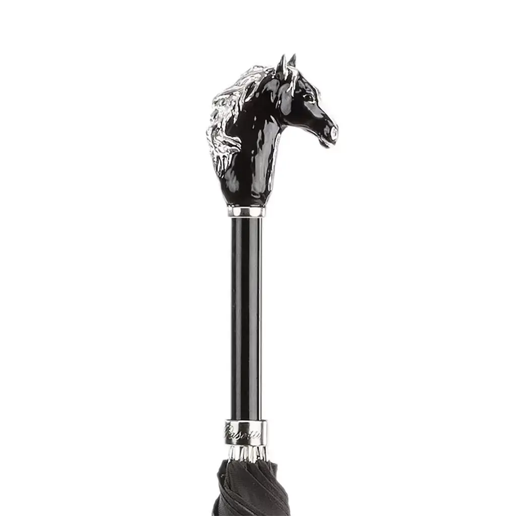 Impossibly chic, when putting your best foot forward is the only option. Handmade in Italy by Pasotti, experts in luxury umbrella design, this all-black umbrella is all sophistication. With a 102-centimeter canopy, the umbrella has a chrome-colored shaft and a painstakingly detailed horse head handle in brass and enamel. Automatic opening.
