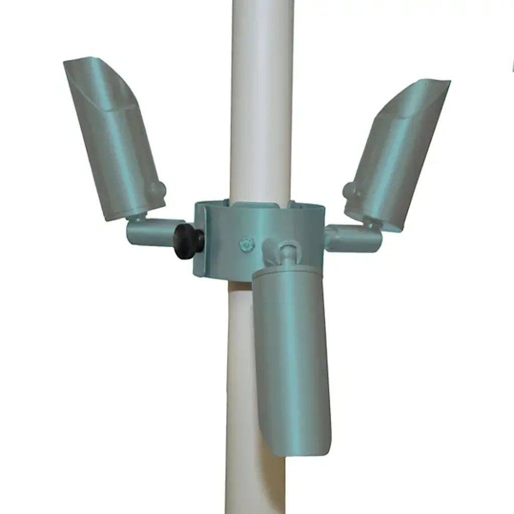 Just because you want a little shade doesn’t mean you have to sit in the dark! The Focus Industries Brass LED Umbrella Lights (one complete unit) fits snuggly on your umbrella pole with a heavy duty, adjustable brass bracket and has three independently adjustable heads that direct light where you need it most. Connects to a 12v landscaping electrical system via a 10 ft black wire that leads from the fixture. Transformer is necessary but not included.