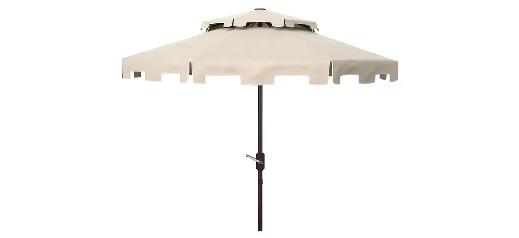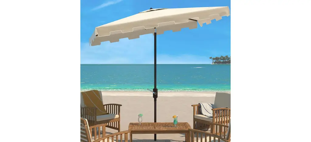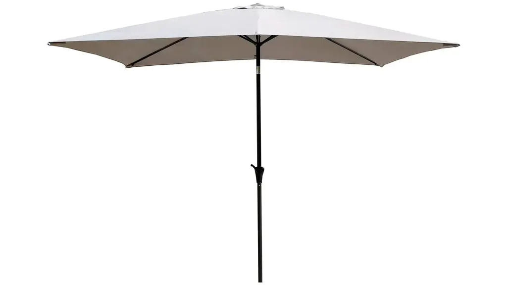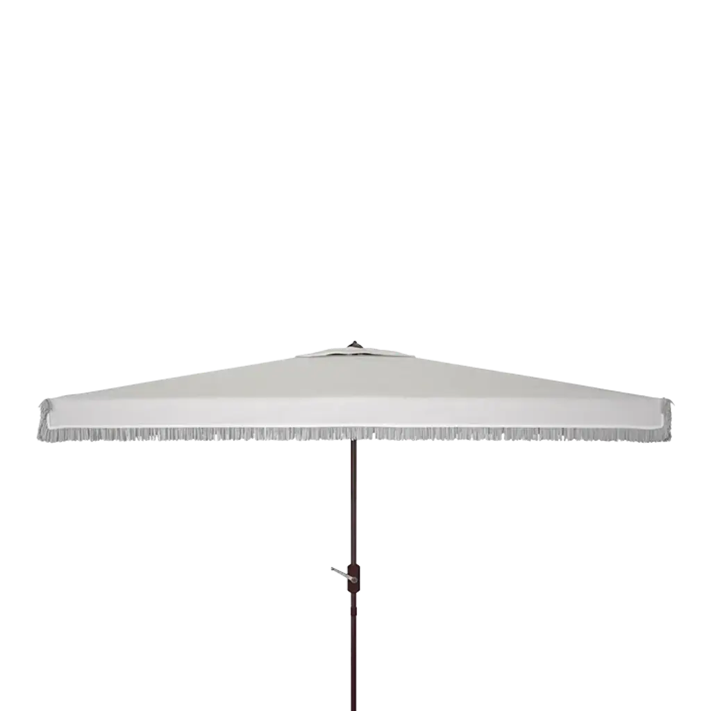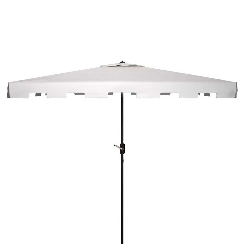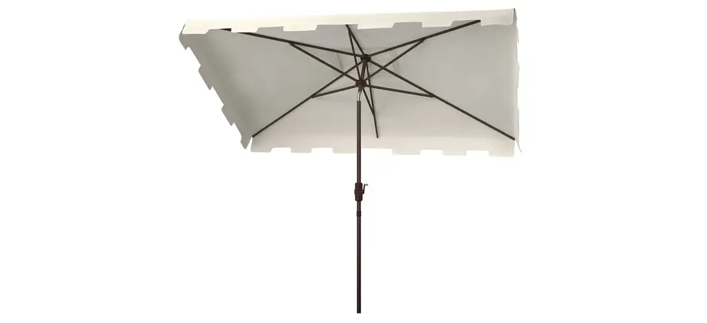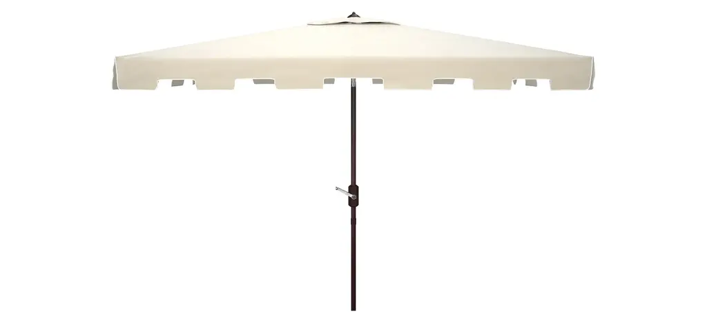 A classic market umbrella gets a stylish makeover in neutral beige and white for chic European flair. Its rectangular polyester canopy and brown aluminum post make it ideal for the veranda or pool deck. Includes easy crank and tilt mechanism.