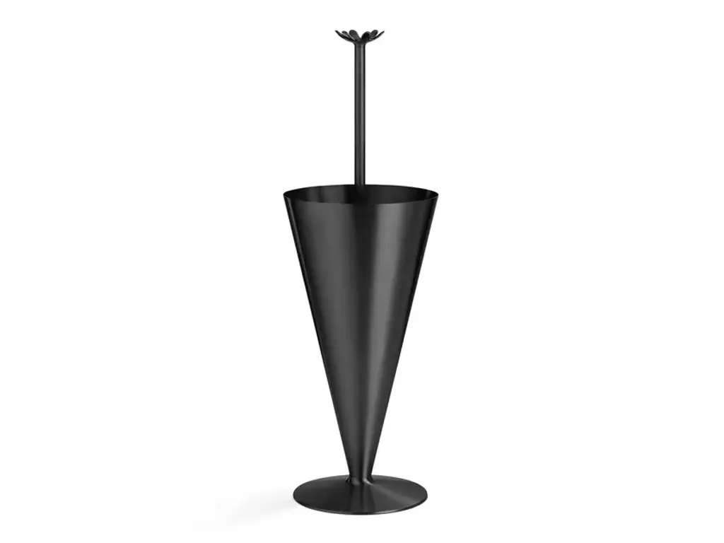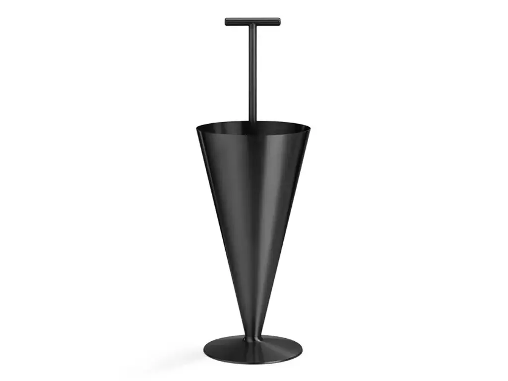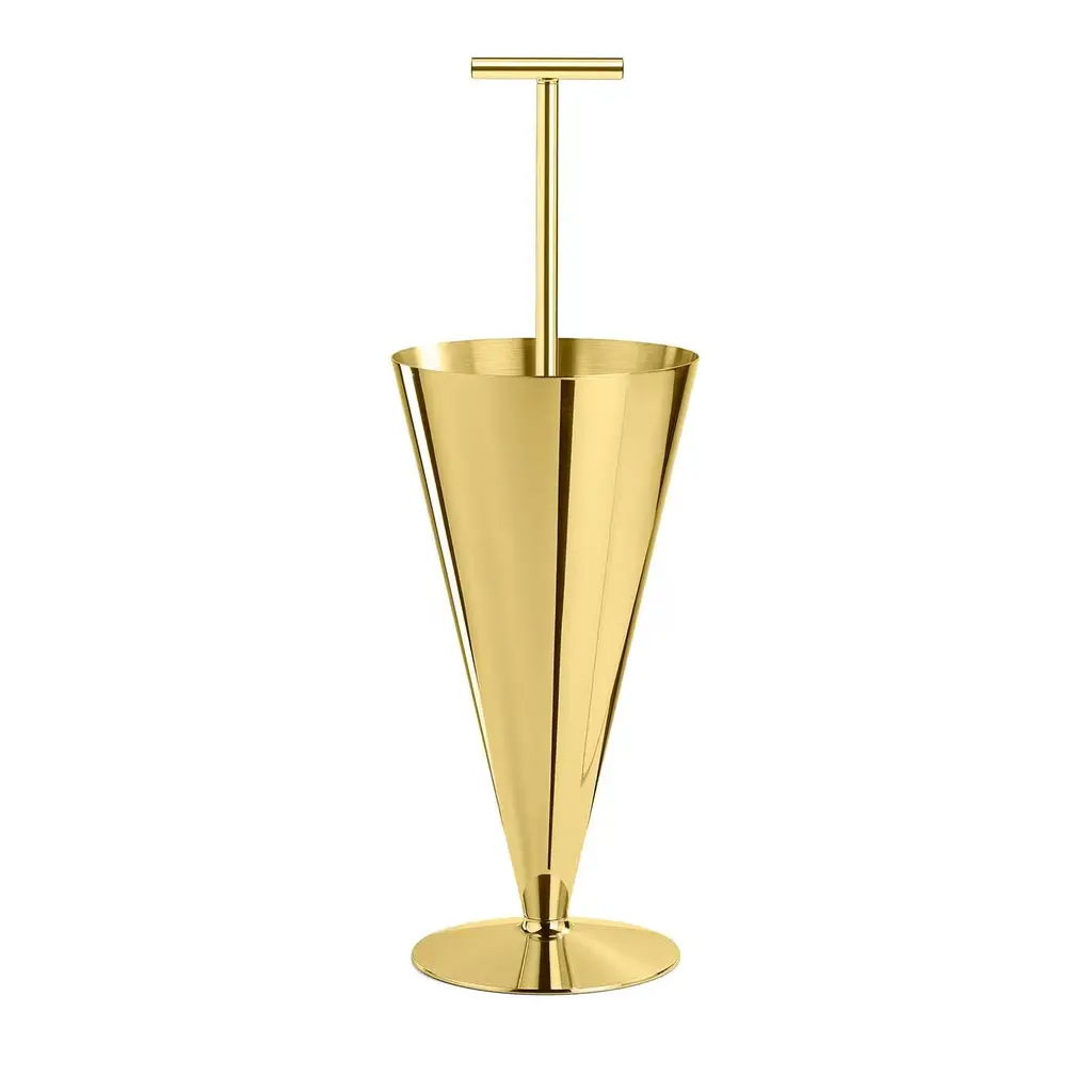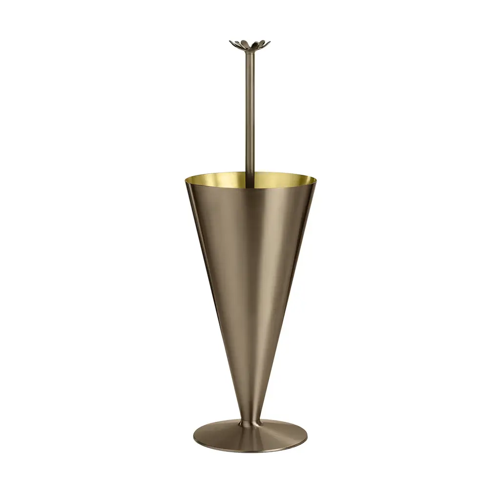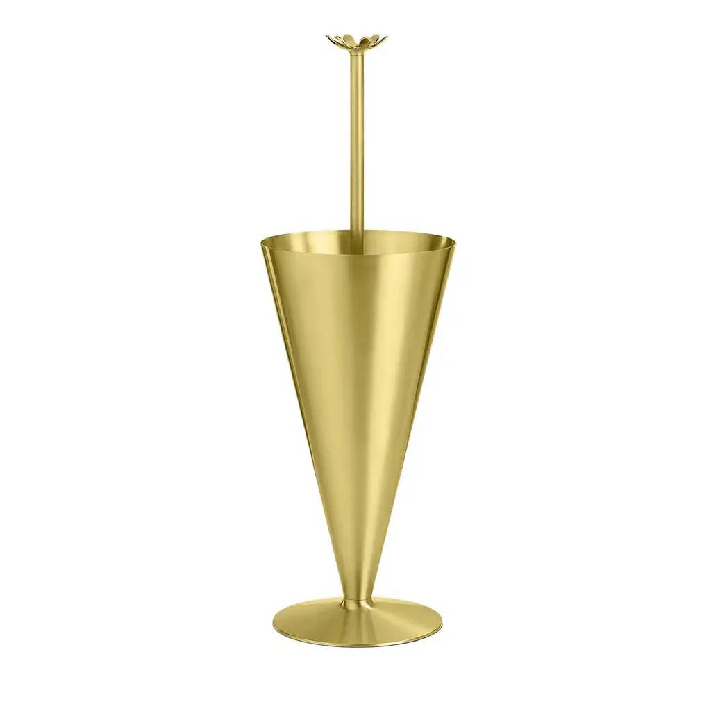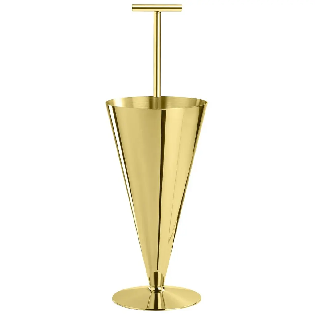 This elegant umbrella stand was crafted entirely in brass and comprises a round base with a vertical stand that supports the body of the piece, which is an upside-down cone made to evoke the stylized shape of an umbrella itself. A sophisticated combination of modern design and classic execution, this piece will give a luxurious touch to any entryway and can be paired with other brass objects by the same designer.
