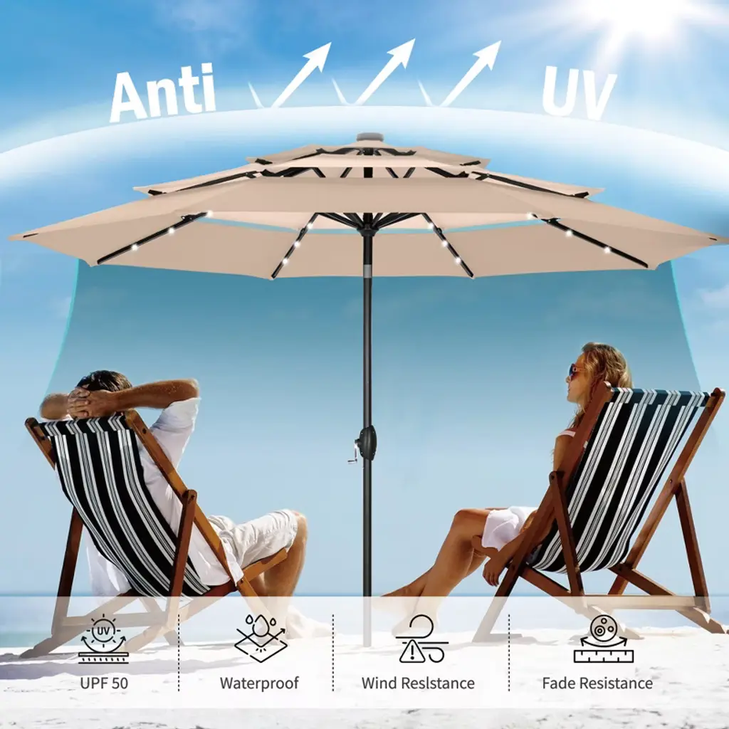 [CAPTIVA DESIGNS]Enhance your outdoor space with the Captiva Designs 10ft Patio Umbrella, featuring 24 solar-powered LED lights for a warm evening glow. Its innovative triple vented design promotes airflow and stability, while the spacious 10-foot diameter offers generous shade for comfort on sunny days. With a user-friendly crank and auto-tilt mechanism, adjusting the umbrella is a breeze. Made from durable, water-repellent polyester, this umbrella is designed to withstand the elements and ensure long-lasting use. Its sturdy powder-coated pole fits most market tables (base not included). Remember to close and secure the umbrella when it’s not in use to extend its lifespan. Enjoy stylish functionality for your outdoor gatherings!Packages Includes:Umbrella x 1Cover x 1Base: Not IncludedDimensions:Umbrella(in.): 120 [L] x 120 [W] x 98.4 [H]Pole Dimensions(in.): 1.5 Inches [Dia] Assembly Time: 5-10min