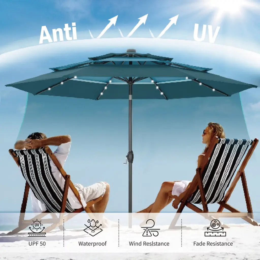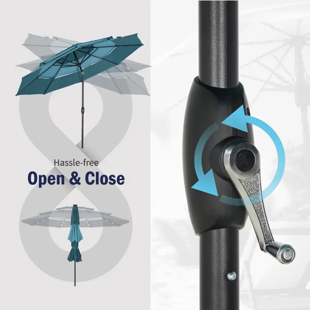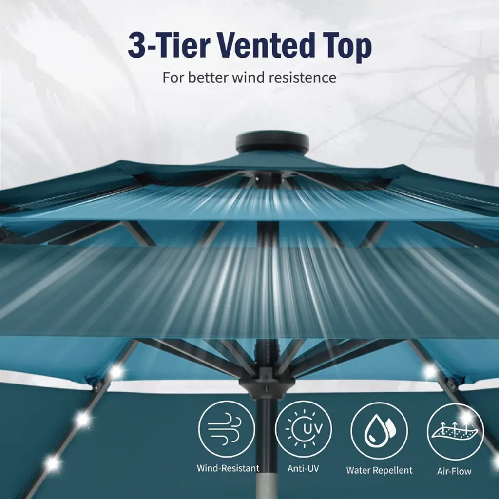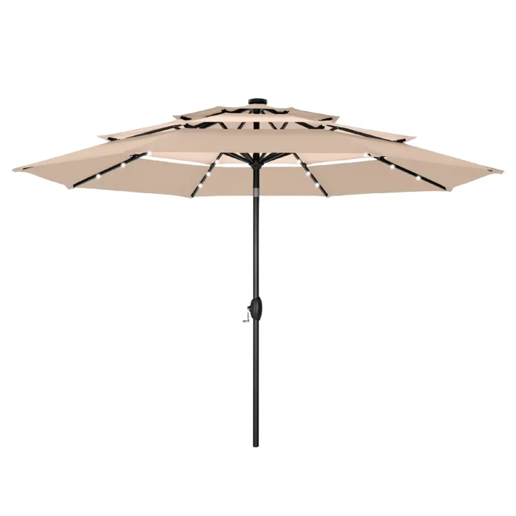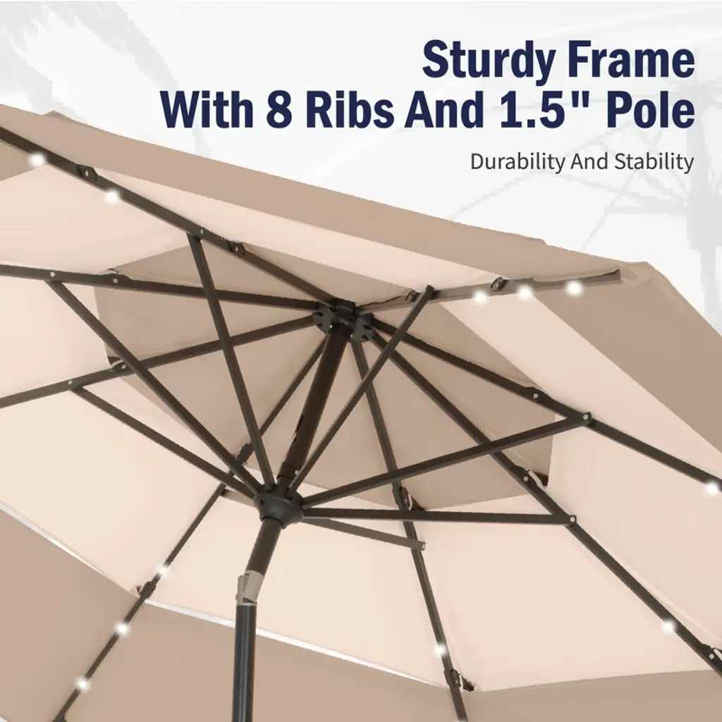 [CAPTIVA DESIGNS]Enhance your outdoor space with the Captiva Designs 10ft Patio Umbrella, featuring 24 solar-powered LED lights for a warm evening glow. Its innovative triple vented design promotes airflow and stability, while the spacious 10-foot diameter offers generous shade for comfort on sunny days. With a user-friendly crank and auto-tilt mechanism, adjusting the umbrella is a breeze. Made from durable, water-repellent polyester, this umbrella is designed to withstand the elements and ensure long-lasting use. Its sturdy powder-coated pole fits most market tables (base not included). Remember to close and secure the umbrella when it’s not in use to extend its lifespan. Enjoy stylish functionality for your outdoor gatherings!Packages Includes:Umbrella x 1Cover x 1Base: Not IncludedDimensions:Umbrella(in.): 120 [L] x 120 [W] x 98.4 [H]Pole Dimensions: 1.5 Inches [Dia] Assembly Time: 5-10min