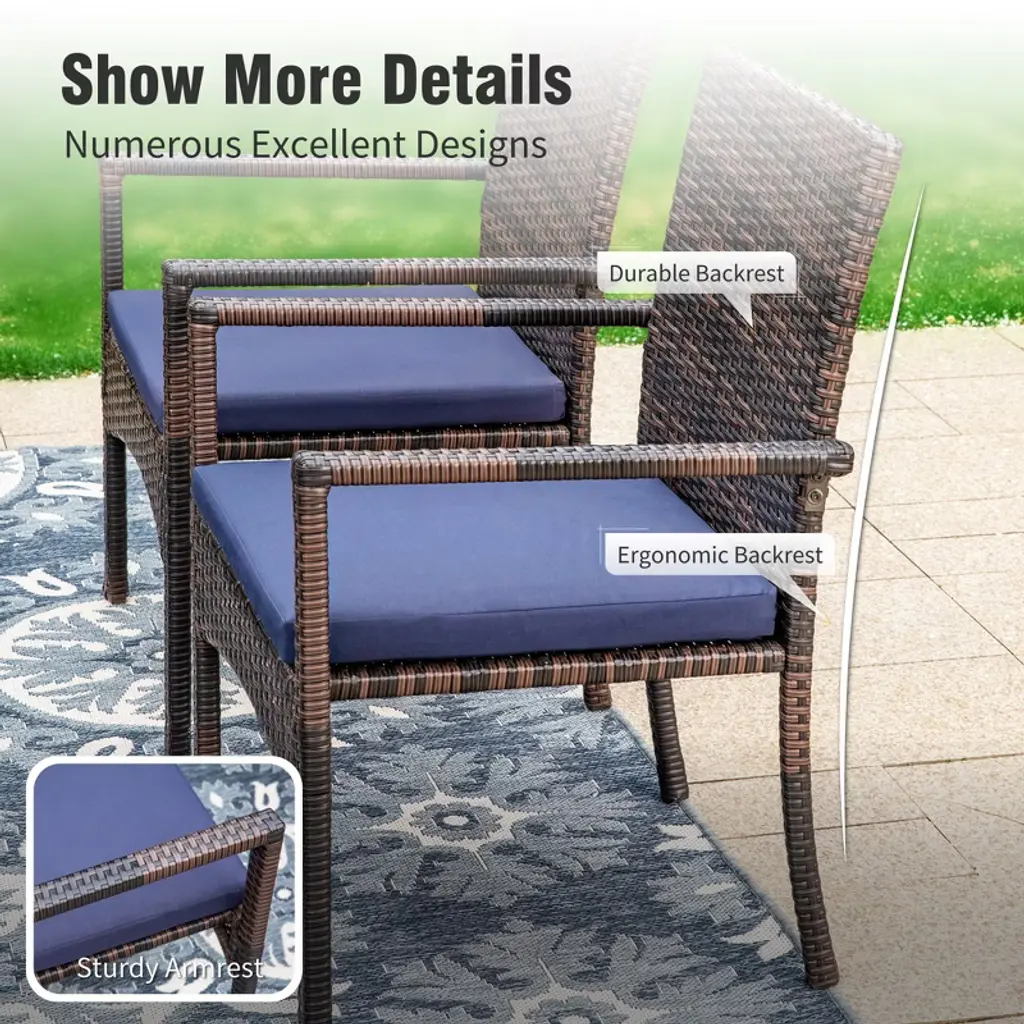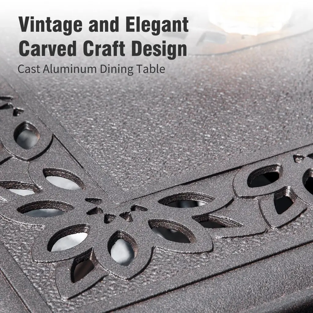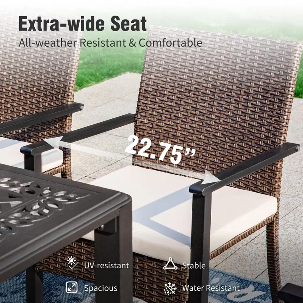 Elevate your outdoor dining experience with the Captiva Designs 7-piece set. Enjoy dining comfortably around the sturdy cast aluminum square metal table featuring a convenient umbrella hole for sun protection. Relax on cushioned wicker rattan chairs that combine comfort with weather-resistant durability. Create inviting spaces for gatherings, entertain effortlessly, and enhance your patio ambiance with this expertly crafted outdoor dining set. Designed to withstand the elements while providing lasting style and function.