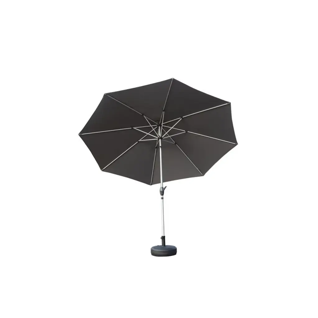 Create a stylish and comfortable outdoor retreat with this 11 foot by 11 foot double top patio umbrella with LED lights, designed for superior airflow, wide shade coverage, and durable all-weather performance; the vented dual canopy promotes ventilation to keep your space cool while the sturdy 1.9 inch aluminum pole and 8 steel ribs offer strong wind resistance; made with 281 gram solution dyed polyester and a PA coating, the fabric delivers UPF 50 plus UV protection and passes the AATCC22 waterproof test for reliable sun and rain coverage; enjoy effortless operation with the 360 degree foot pedal rotation and dual crank system, and set the mood at night with 12 removable LED light strips for soft ambient lighting on your patio, deck, balcony, or poolside.