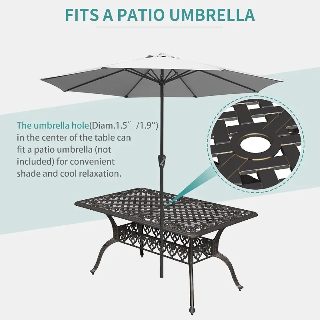 Cast Aluminum Outdoor Dining Table, 59'' Patio Dining Table With 2" Umbrella Hole And Adjustable Foot Pads For Garden, Backyard, Deck