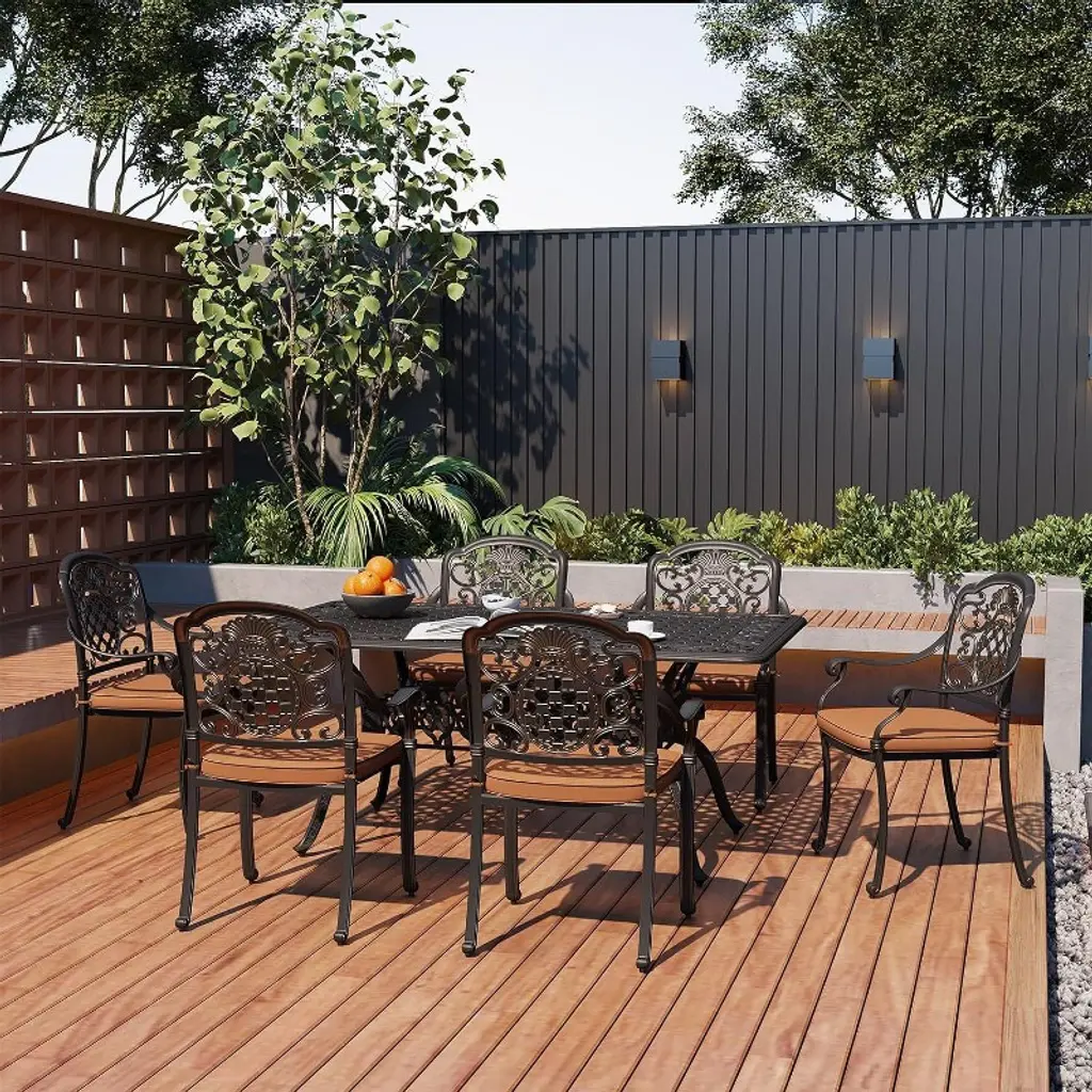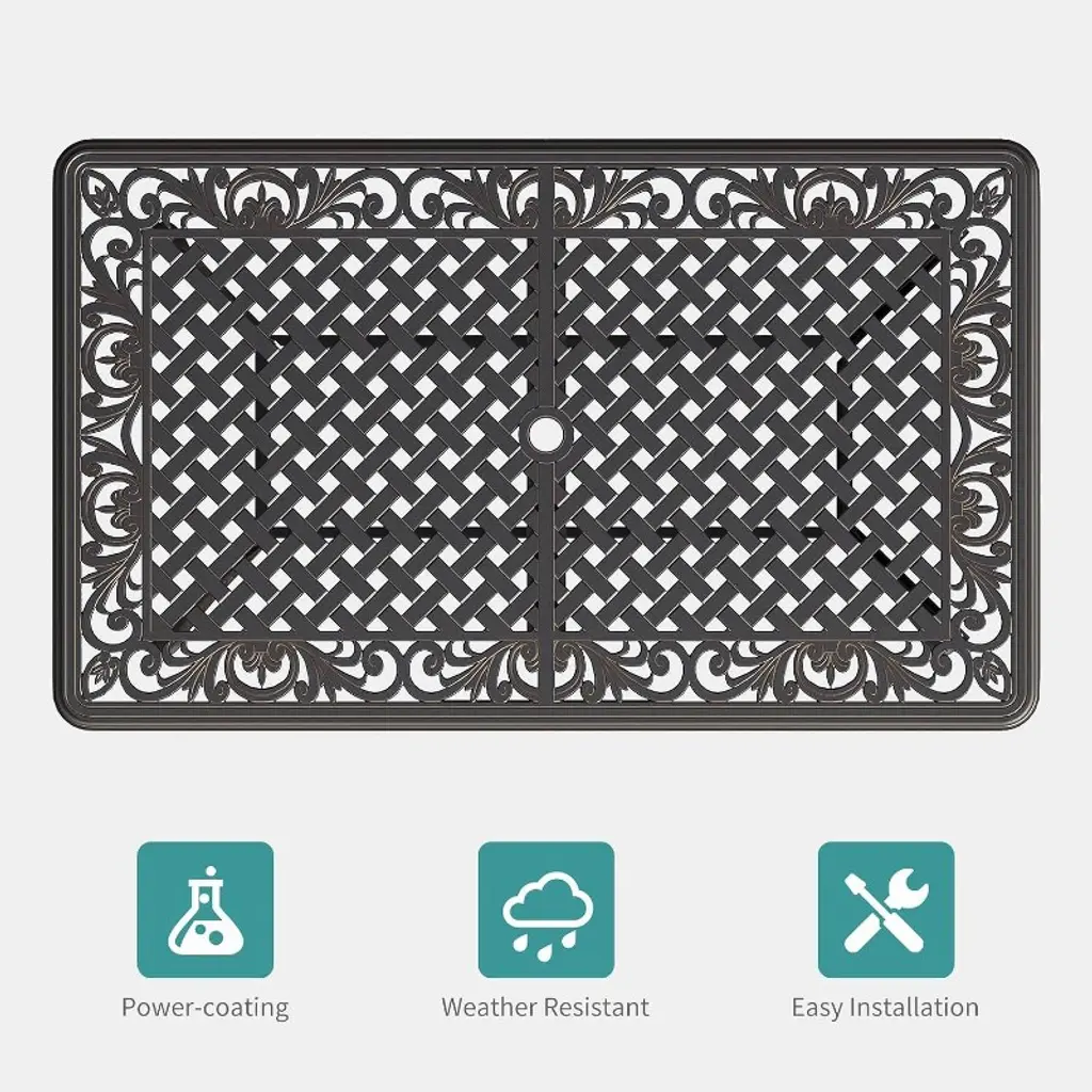 Measuring 59.06" x 35.24", this large rectangular patio dining table comfortably seats 6 to 8 guests—perfect for hosting outdoor dinners, weekend brunches, or holiday parties with family and friends. The wide tabletop provides ample space for food, drinks, and table décor. Crafted from high-quality cast aluminum and finished with a protective powder coating, this outdoor table is engineered to combat rust , corrosion, fading, and chipping. Its sturdy construction ensures reliable performance through all seasons without the need for covering or storage. Whether placed on your patio, in the backyard, next to the pool, or on a front porch, this classic rectangular dining table upgrades your space with both beauty and function. It’s an ideal centerpiece for casual get-togethers or formal outdoor meals.