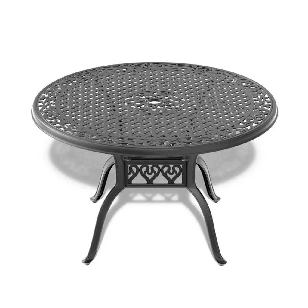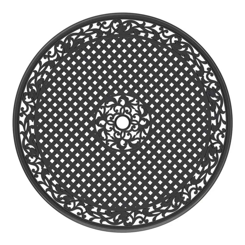 This elegant outdoor dining table features a traditional cast design with intricate patterns that add artistic charm to any space. Crafted from 100% aluminum with a weather-resistant powder-coated finish, it offers excellent durability against rust, UV rays, and the elements. A built-in 1.88-inch umbrella hole provides added convenience for shaded outdoor dining.