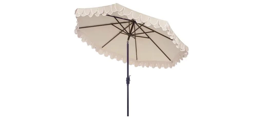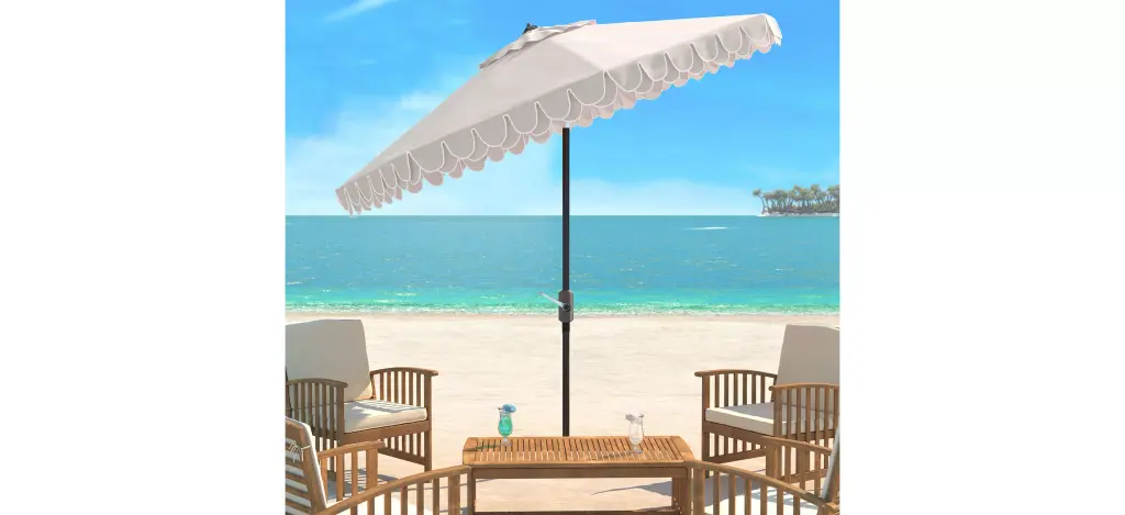 Offering a second home to jetsetters and cinema stars, a legendary beachside resort at Cannes inspired this elegant umbrella. Its petal valance finished in crisp beige and white, it recalls the inimitable red carpet glamour of the Cote d'Azure.