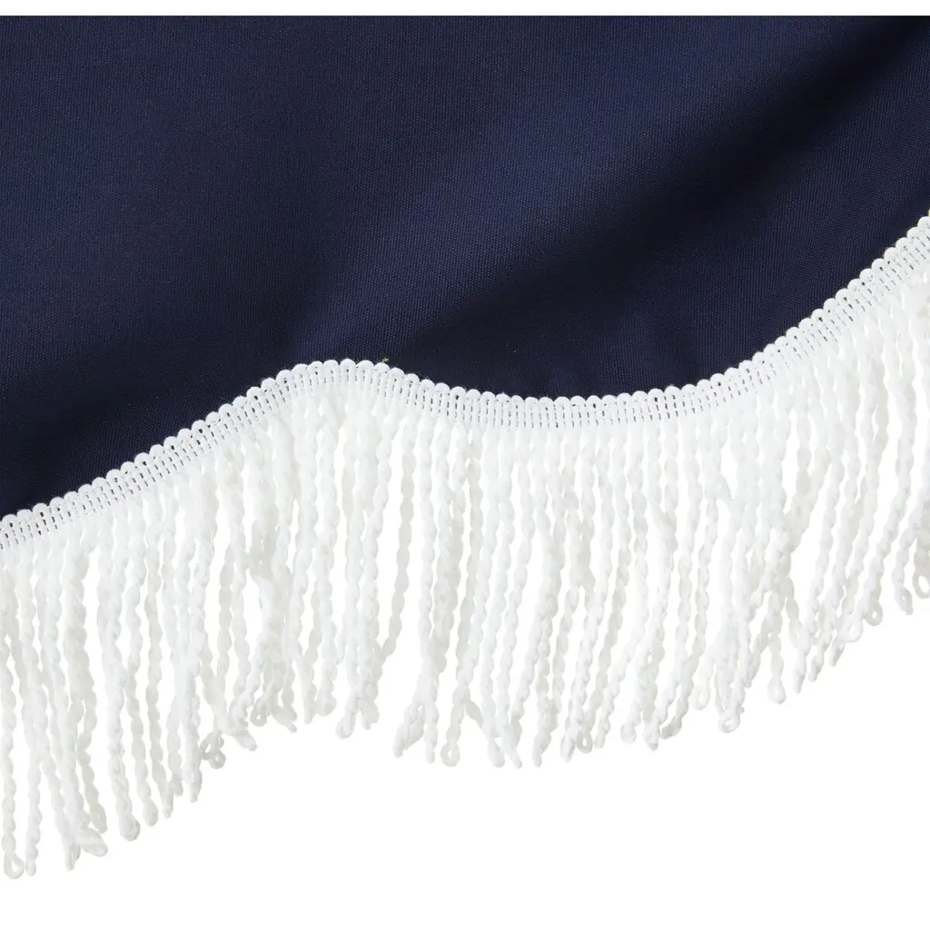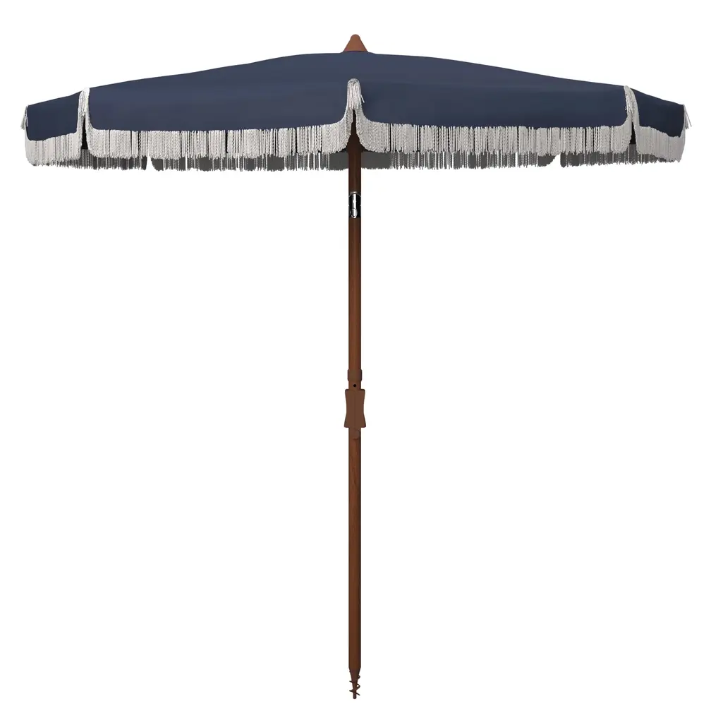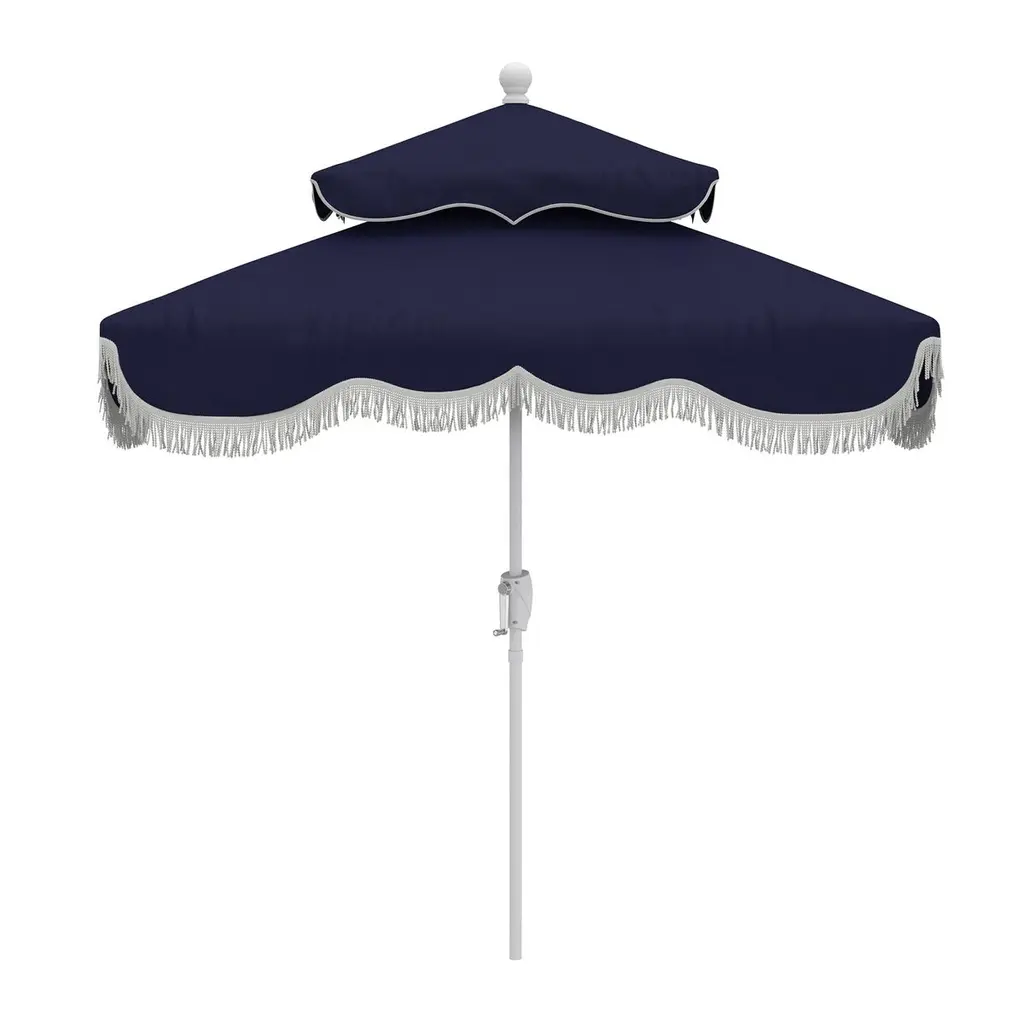 Designed by us and available only at One Kings Lane: Whether you're entertaining or just lounging outdoors, catch some shade in style with this patio umbrella. Its fringed canopy is crafted from durable Sunbrella acrylic to protect against the elements, while its frame is made using a combination of sturdy aluminum and zinc plated steel and features a tilt-and-crank function. An umbrella base is not included but is required for use.