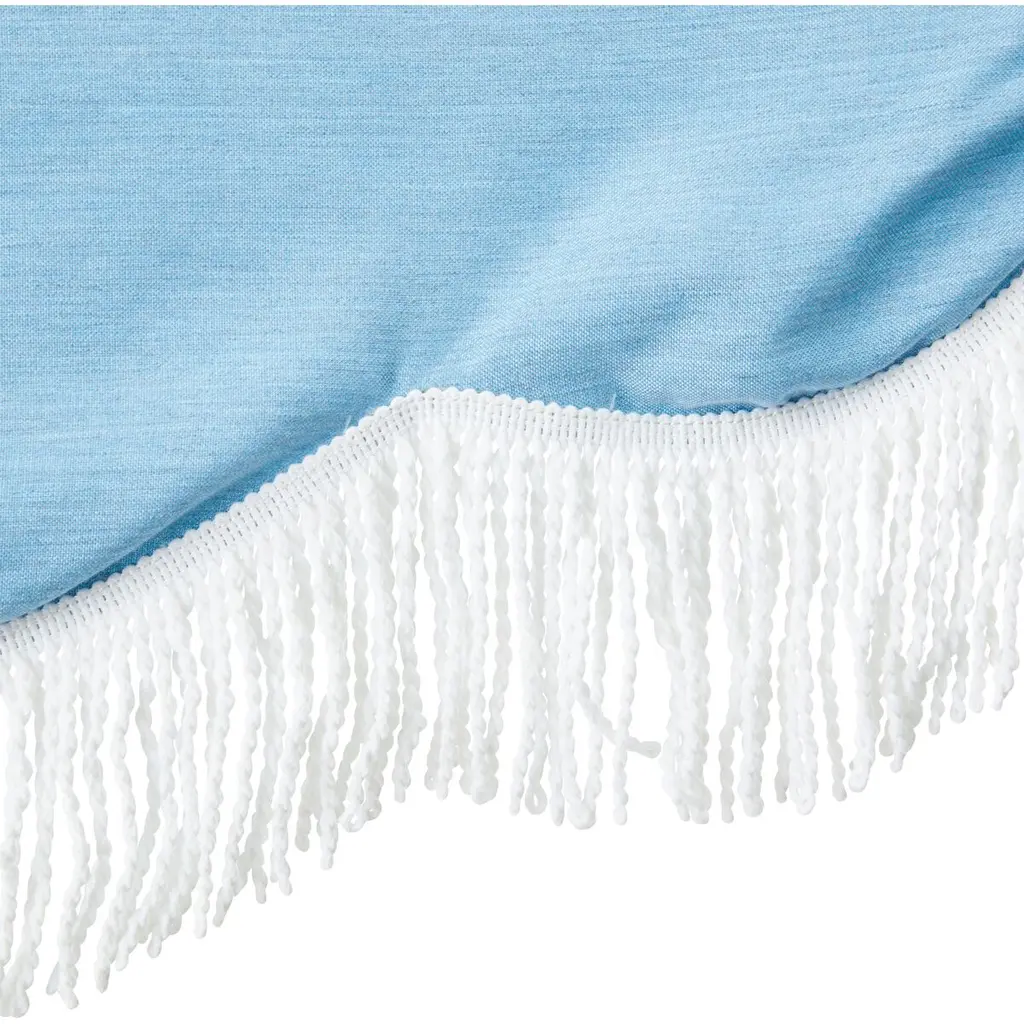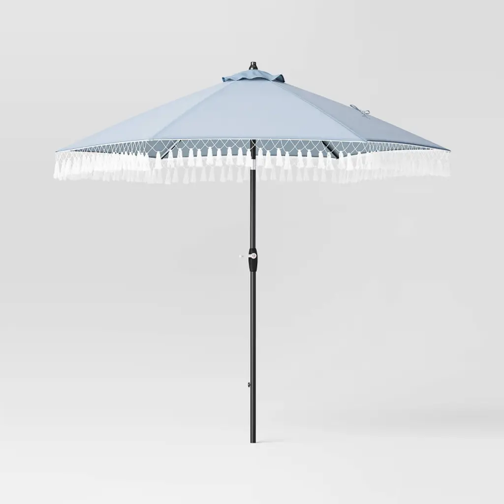 Designed by us and available only at One Kings Lane: Whether you're entertaining or just lounging outdoors, catch some shade in style with this patio umbrella. Its fringed canopy is crafted from durable Sunbrella acrylic to protect against the elements, while its frame is made using a combination of sturdy aluminum and zinc plated steel and features a tilt-and-crank function. An umbrella base is not included but is required for use.
