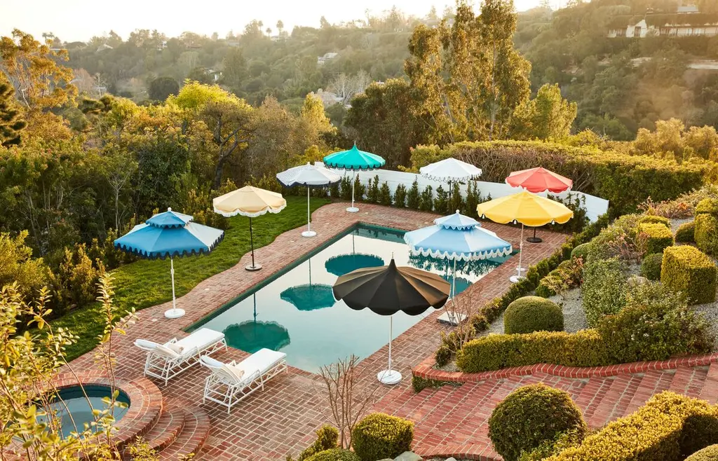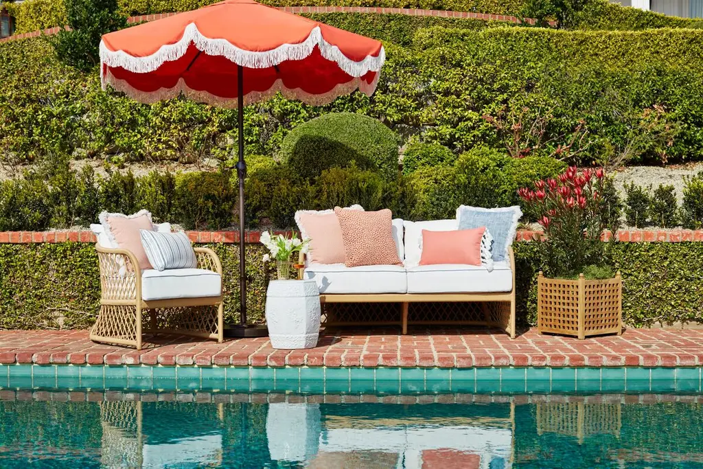 Designed by us and available only at One Kings Lane: Whether you're entertaining or just lounging outdoors, catch some shade in style with this patio umbrella. Its fringed canopy is crafted from durable Sunbrella acrylic to protect against the elements, while its frame is made using a combination of sturdy aluminum and zinc plated steel and features a tilt-and-crank function. An umbrella base is not included but is required for use.