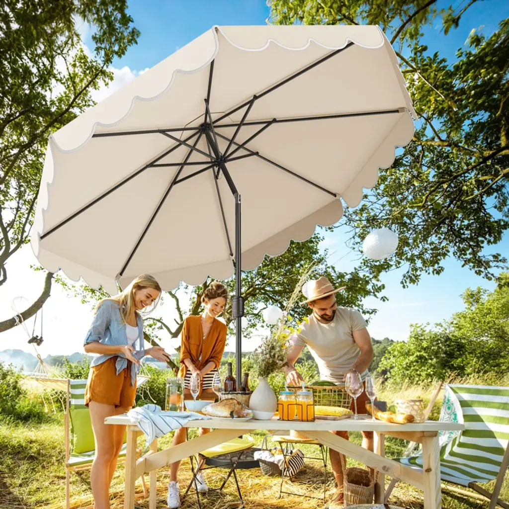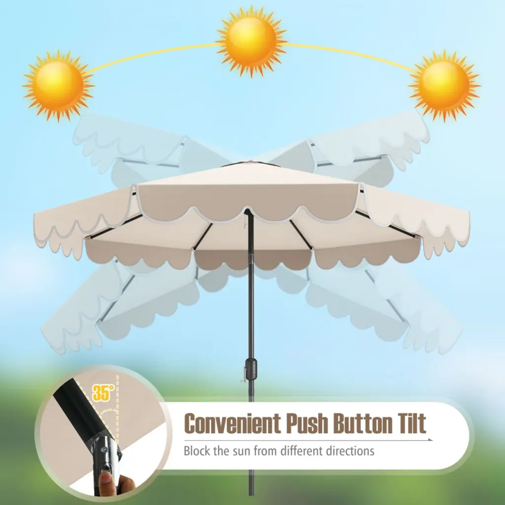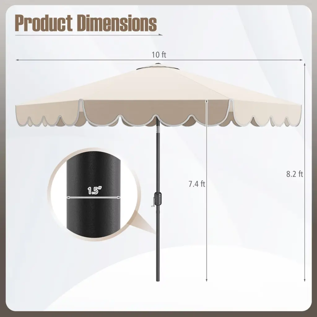 Elevate Outdoor Relaxation! This patio umbrella with ruffled edges measures 10 x 8.2 ft (Dia. x H), perfect for creating a comfy shaded area outdoors, whether relaxing with family on the patio, hosting BBQ parties in the garden, or creating a shaded retreat by the pool. Also, the canopy can be flexibly tilted in different directions, providing customizable shade coverage. Crafted from premium 180G polyester canopy, this umbrella offers exceptional protection against both sun and light rain. When not in use, you can easily close the umbrella with a smooth crank handle and detach it into 2 sections, saving storage space. A valuable addition for providing shade and ambiance to outdoor events or everyday relaxation.FeaturesCrafted from a reliable polyester canopy, ensure excellent weather resistance Equipped with ruffled edges for an elegant look and increased sunshade area Designed with a top air vent for air circulation and enhanced stability The push button tilt function helps block the sun from different directions Features a 2-section design and hassle-free crank handle, easy to install and detach Features a convenient loop strap to secure the umbrella into a compact size Equipped with protective rib pockets, prevent the canopy from tearing 8 heavy-duty metal ribs ensure unparalleled stability and wind resistance Equipped with a safety latch, prevent the umbrella from accidental closing Color: Beige/Brown/Gray/Blue/Red Material: Polyester Fabric, Metal Product Dimensions: 10 x 8.2 ft (Dia. x H) Umbrella Rim Height: 7.4 ft Umbrella Pole Diameter: 1.5" Net Weight: 14 lbs 1 x Patio Umbrella 1 x User's Manual
