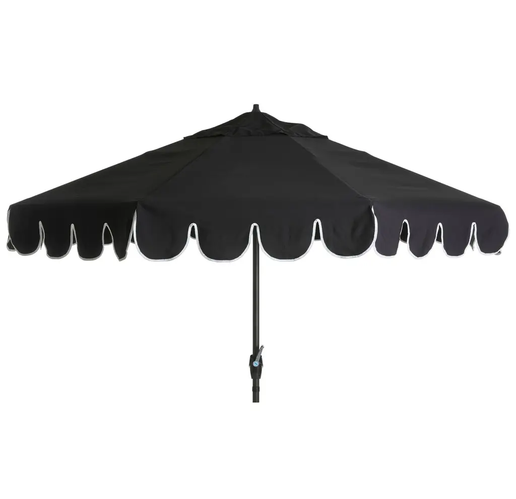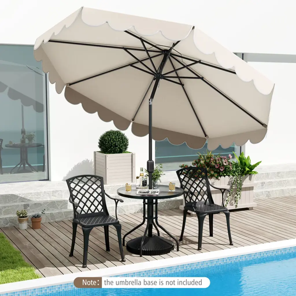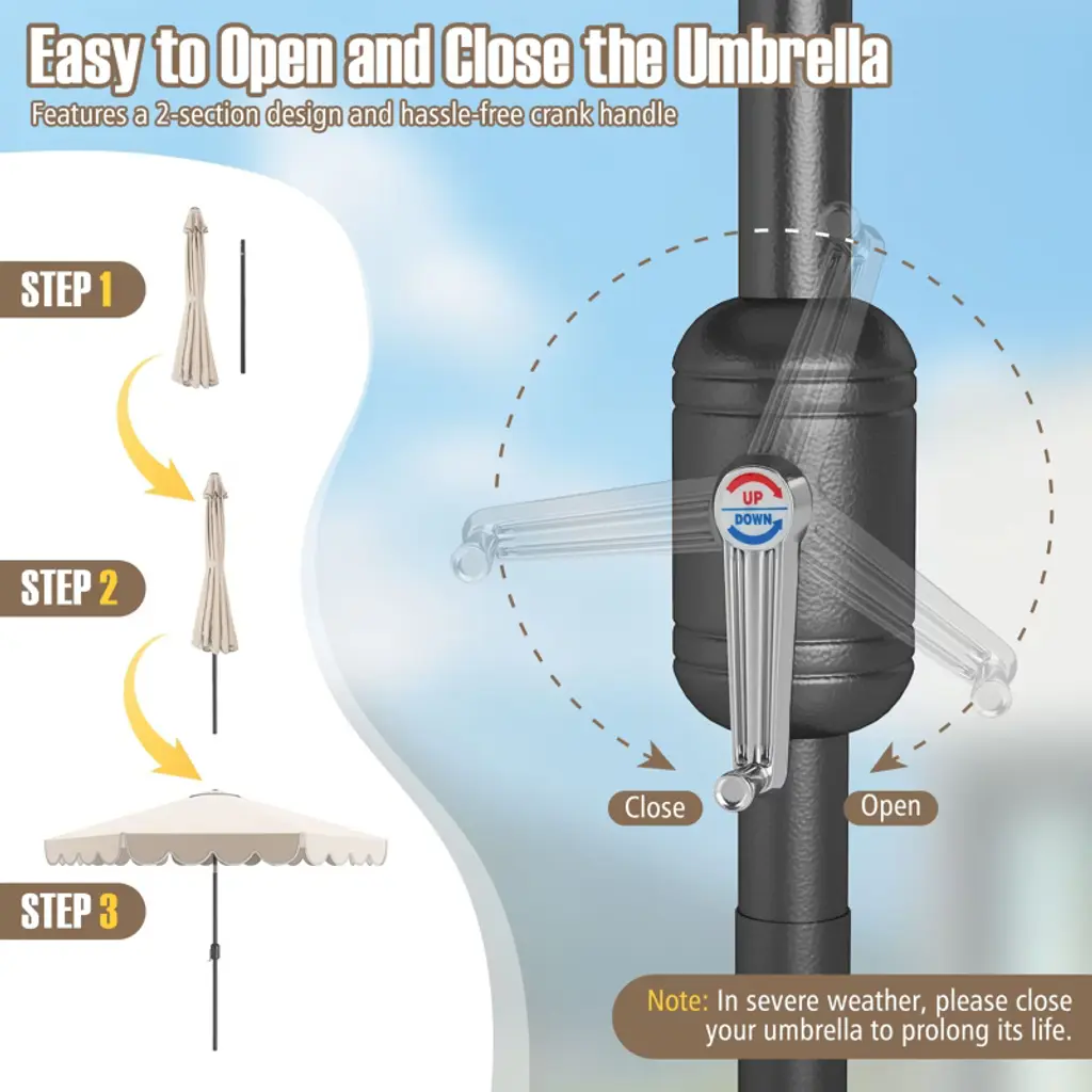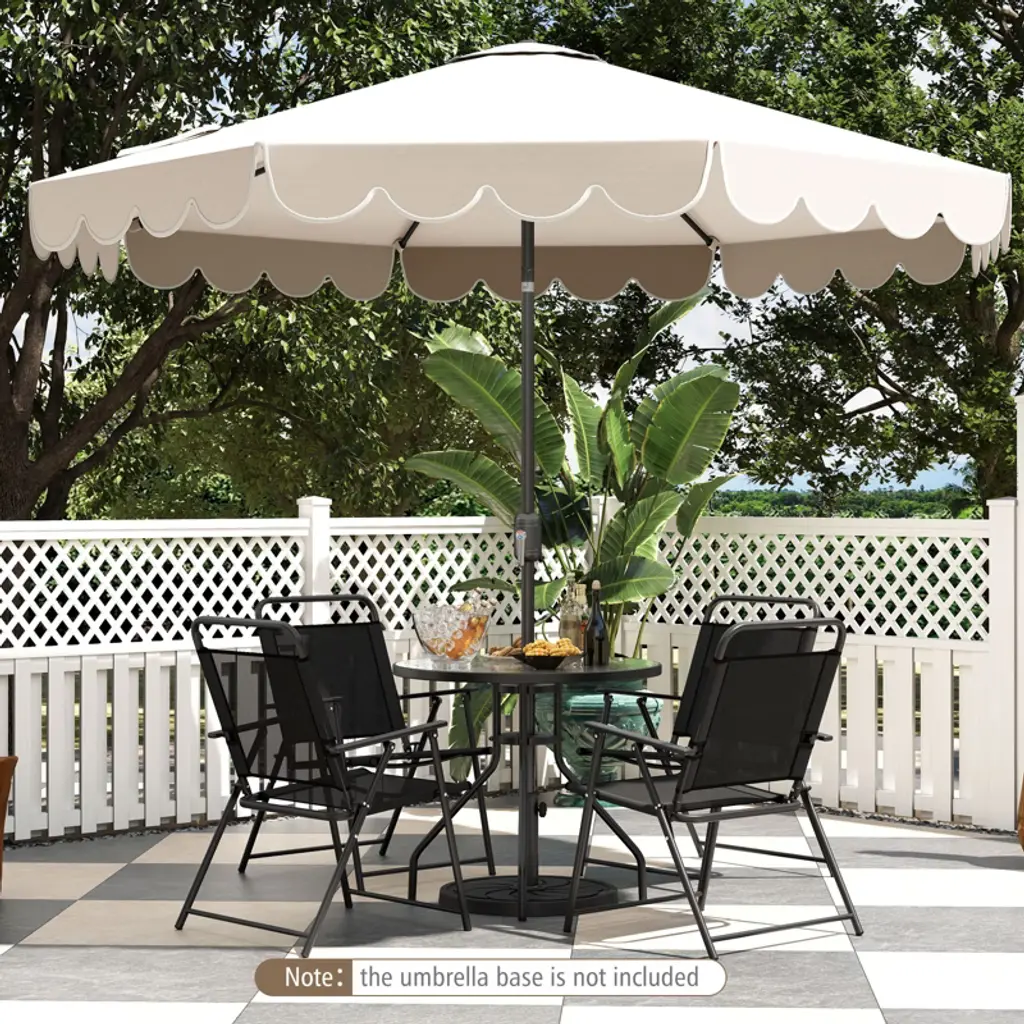 Elevate Outdoor Relaxation! This patio umbrella with ruffled edges measures 10 x 8.2 ft (Dia. x H), perfect for creating a comfy shaded area outdoors, whether relaxing with family on the patio, hosting BBQ parties in the garden, or creating a shaded retreat by the pool. Also, the canopy can be flexibly tilted in different directions, providing customizable shade coverage. Crafted from premium 180G polyester canopy, this umbrella offers exceptional protection against both sun and light rain. When not in use, you can easily close the umbrella with a smooth crank handle and detach it into 2 sections, saving storage space. A valuable addition for providing shade and ambiance to outdoor events or everyday relaxation.FeaturesCrafted from a reliable polyester canopy, ensure excellent weather resistance Equipped with ruffled edges for an elegant look and increased sunshade area Designed with a top air vent for air circulation and enhanced stability The push button tilt function helps block the sun from different directions Features a 2-section design and hassle-free crank handle, easy to install and detach Features a convenient loop strap to secure the umbrella into a compact size Equipped with protective rib pockets, prevent the canopy from tearing 8 heavy-duty metal ribs ensure unparalleled stability and wind resistance Equipped with a safety latch, prevent the umbrella from accidental closing Color: Beige/Brown/Gray/Blue/Red Material: Polyester Fabric, Metal Product Dimensions: 10 x 8.2 ft (Dia. x H) Umbrella Rim Height: 7.4 ft Umbrella Pole Diameter: 1.5" Net Weight: 14 lbs 1 x Patio Umbrella 1 x User's Manual