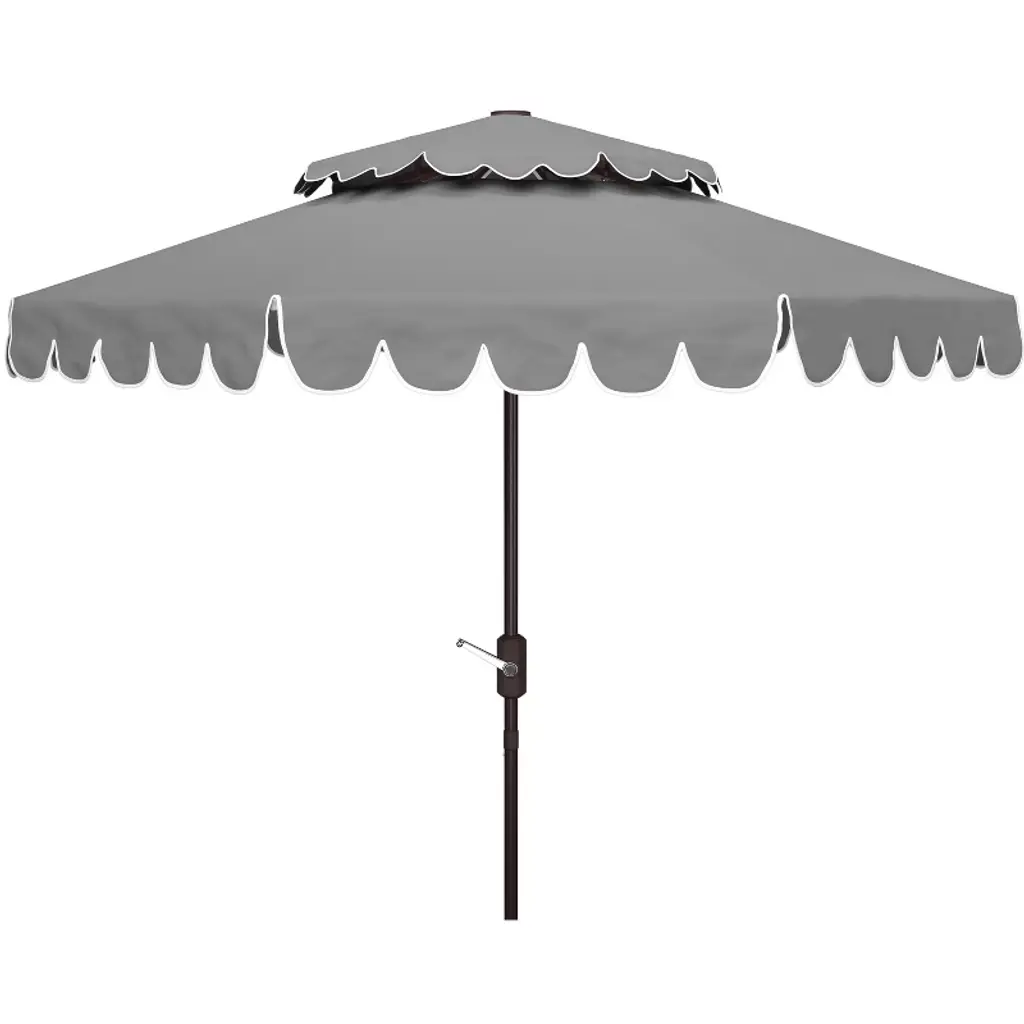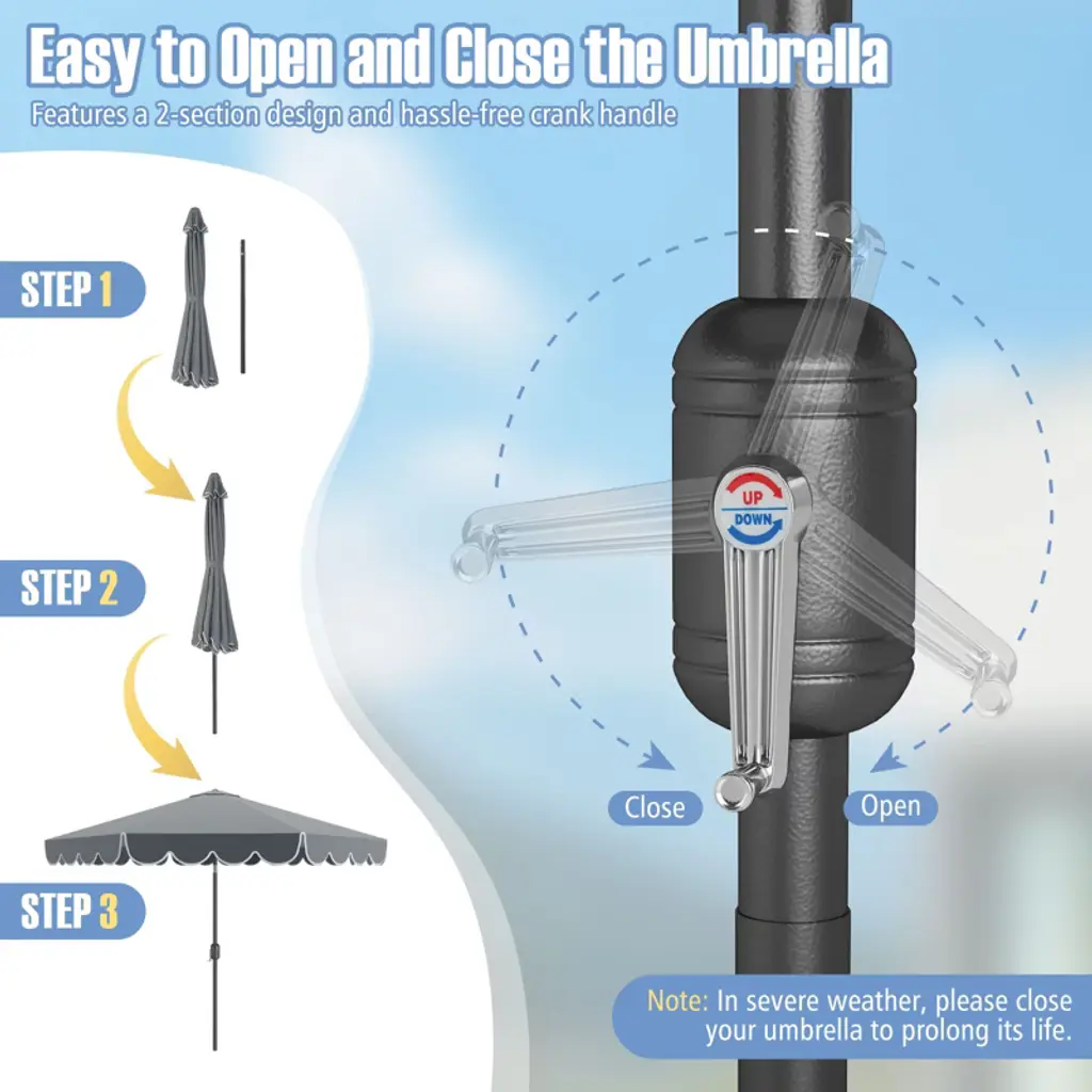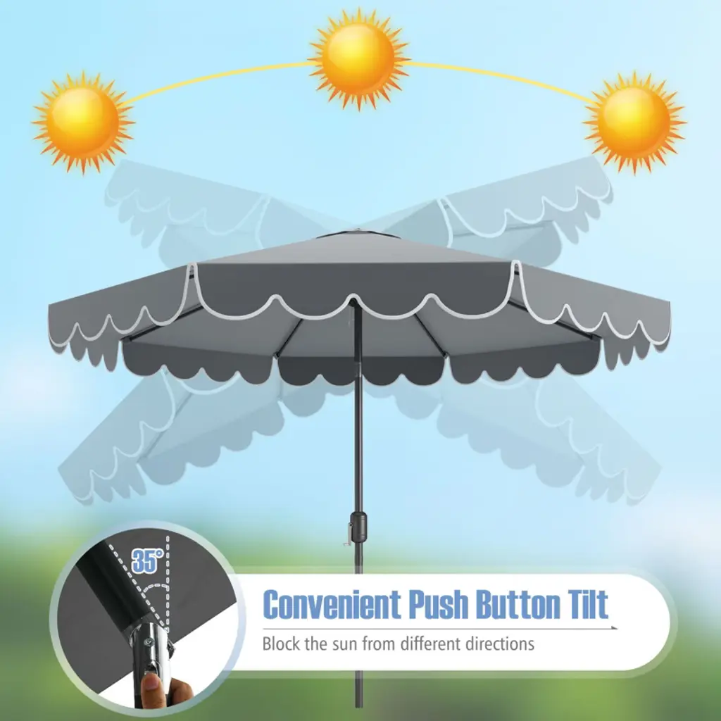 Elevate Outdoor Relaxation! This patio umbrella with ruffled edges measures 10 x 8.2 ft (Dia. x H), perfect for creating a comfy shaded area outdoors, whether relaxing with family on the patio, hosting BBQ parties in the garden, or creating a shaded retreat by the pool. Also, the canopy can be flexibly tilted in different directions, providing customizable shade coverage. Crafted from premium 180G polyester canopy, this umbrella offers exceptional protection against both sun and light rain. When not in use, you can easily close the umbrella with a smooth crank handle and detach it into 2 sections, saving storage space. A valuable addition for providing shade and ambiance to outdoor events or everyday relaxation.FeaturesCrafted from a reliable polyester canopy, ensure excellent weather resistance Equipped with ruffled edges for an elegant look and increased sunshade area Designed with a top air vent for air circulation and enhanced stability The push button tilt function helps block the sun from different directions Features a 2-section design and hassle-free crank handle, easy to install and detach Features a convenient loop strap to secure the umbrella into a compact size Equipped with protective rib pockets, prevent the canopy from tearing 8 heavy-duty metal ribs ensure unparalleled stability and wind resistance Equipped with a safety latch, prevent the umbrella from accidental closing Color: Beige/Brown/Gray/Blue/Red Material: Polyester Fabric, Metal Product Dimensions: 10 x 8.2 ft (Dia. x H) Umbrella Rim Height: 7.4 ft Umbrella Pole Diameter: 1.5" Net Weight: 14 lbs 1 x Patio Umbrella 1 x User's Manual