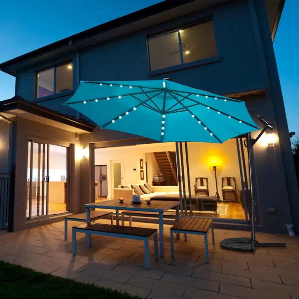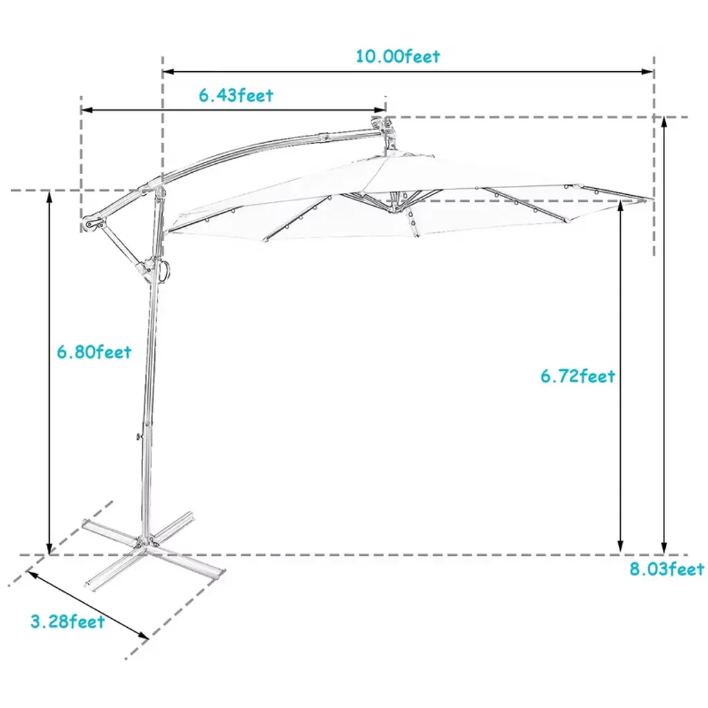 The luxurious outdoor patio umbrella is a good companion outdoors. Our patio offset umbrella is up to 10ft in diameter and provide a large shaded area to protect you and your family from the sun. Meanwhile, the vent at the top of the umbrella allows cool air to flow through, thus creating a comfortable environment for you. And the gliding handle and simple tilting system allow you to adjust the umbrella at any angle. You can also freely rotate the umbrella to the position you like. Moreover, the patio umbrella is made of high quality powder coated aluminum rod and polyester fiber, which is sturdy enough to be used for a long time. The most important thing is that the offset umbrella has 32 LED lights powered by solar panels, which can provide perfect illumination at night. Please don't miss it.Features32 LED lights for perfect lighting at the night Powered by solar panels to save energy Powder-coated aluminum rod prevents rust and scratches Weather-resistant polyester fabric ensures long-term use The umbrella can freely rotate 360°to reach the ideal position The 10ft canopy provides a large shadow area Simple tilting system allows quick adjustment at any angle Vent design keeps air flowingColor: Beige/Blue/Turquoise/Navy/Orange/Burgundy/Gray Material: Steel, Aluminum, Polyester fabric Overall Dimensions: 10’X7.5’(LXH) Net Weight: 30 lbs Number of Ribs: 8 Number of Lights: 32 Package includes: 1 X 10ft Solar Powered Offset Umbrella With Cross Base