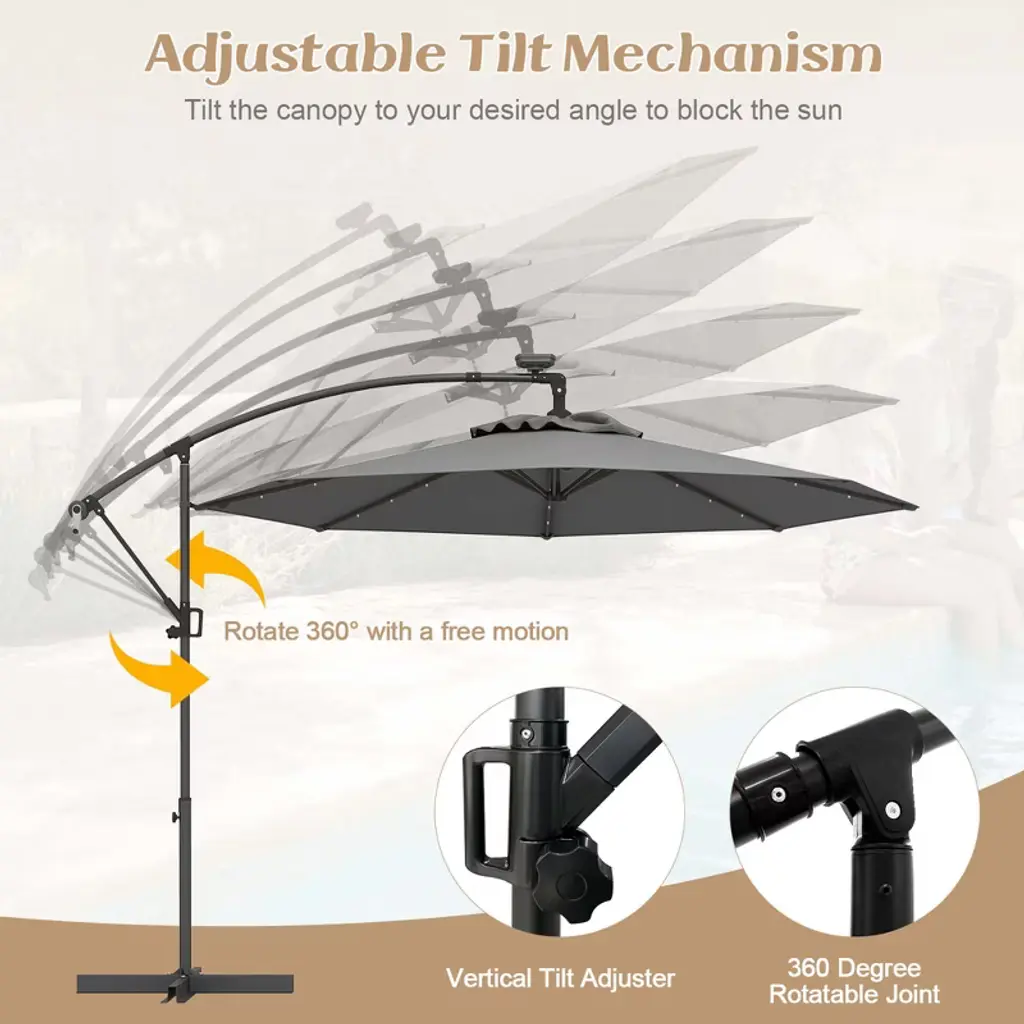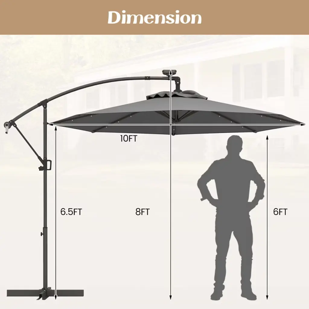 The luxurious outdoor patio umbrella is a good companion outdoors. Our patio offset umbrella is up to 10ft in diameter and provide a large shaded area to protect you and your family from the sun. Meanwhile, the vent at the top of the umbrella allows cool air to flow through, thus creating a comfortable environment for you. And the gliding handle and simple tilting system allow you to adjust the umbrella at any angle. You can also freely rotate the umbrella to the position you like. Moreover, the patio umbrella is made of high quality powder coated aluminum rod and polyester fiber, which is sturdy enough to be used for a long time. The most important thing is that the offset umbrella has 32 LED lights powered by solar panels, which can provide perfect illumination at night. Please don't miss it.Features32 LED lights for perfect lighting at the night Powered by solar panels to save energy Powder-coated aluminum rod prevents rust and scratches Weather-resistant polyester fabric ensures long-term use The umbrella can freely rotate 360°to reach the ideal position The 10ft canopy provides a large shadow area Simple tilting system allows quick adjustment at any angle Vent design keeps air flowingColor: Beige/Blue/Turquoise/Navy/Orange/Burgundy/Gray Material: Steel, Aluminum, Polyester fabric Overall Dimensions: 10’X7.5’(LXH) Net Weight: 30 lbs Number of Ribs: 8 Number of Lights: 32 Package includes: 1 X 10ft Solar Powered Offset Umbrella With Cross Base