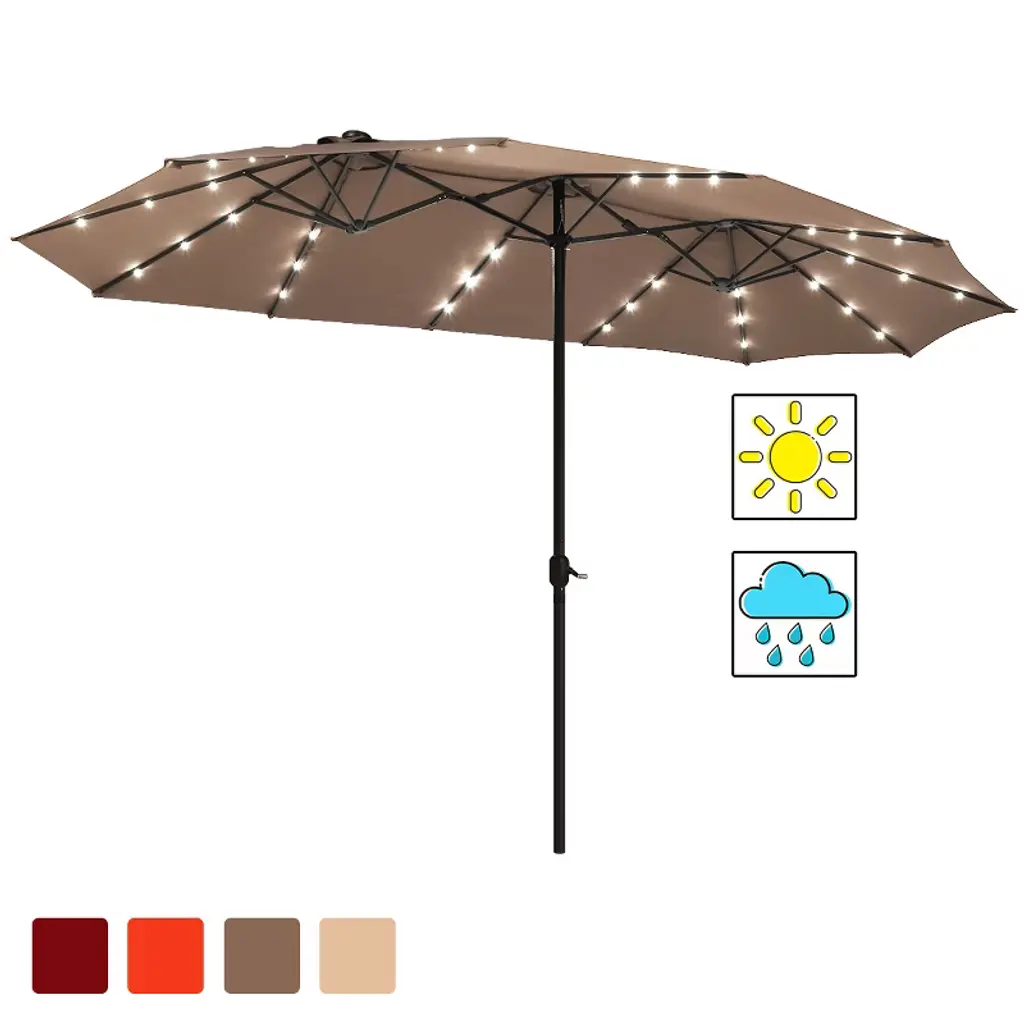 This 15ft solar patio double-sided umbrella provides an ample shade to keep you cool and protect from the hot sun. Made of strong thick steel pole and 12 sturdy ribs, the solar LED patio twin umbrella is stable and sturdy for outdoor use. Plus, premium fabric canopy is fade-resistant and water-proof while offer well sun protection. Even better, this solar double-sided umbrella comes with 36 built-in LED lights and premium solar panels, which allows you to enjoy outdoor leisure day and night. When you are not using it, the umbrella cloth has a rope that holds the umbrella cloth well. Vents give you more coolness and safety because it allows airflow and reduce wind pressure. By the way, assembly is easy and can be done without the aid of tools. FeaturesSolar powered LED lights, energy saving and environmental friendly 36 LED lights allows you to enjoy night outdoor entertainment Power switch in the middle of the pole for easy using Thick steel pole with powder coated is antirust 12 steel ribs provide extra support Air vent allows enough air flow and ensures the umbrella stability Double- sided design provides extra-large shade area Fade resistant polyester fabric canopy do well in outdoor Easily open and close with crank handle Security bolt fixed canopy is more stable Secured with rope for easy storage after closingColor: BeigeTanOrangeBurgundy Material: Steel, Polyester Umbrella Dimension: 15 Ft x 8 Ft (WxH) Net Weight: 27 lbs Rib Number: 12 Air vent: Yes Light Type: Solar-powered, pre-installed LED Number of Lights: 36 LED, 3 on each of the 12 ribs Package Include: 1 x patio double-sided umbrella 1xinstruction