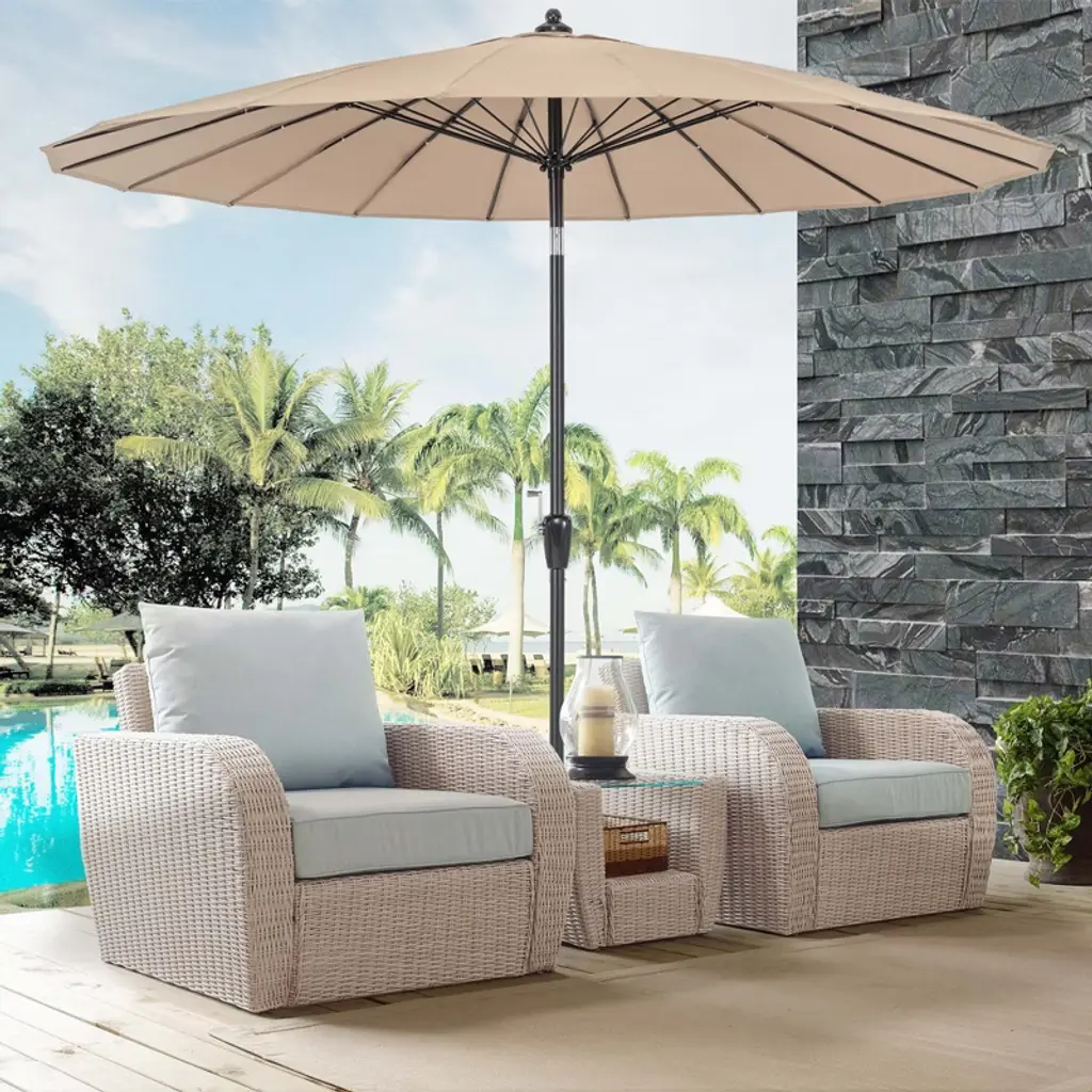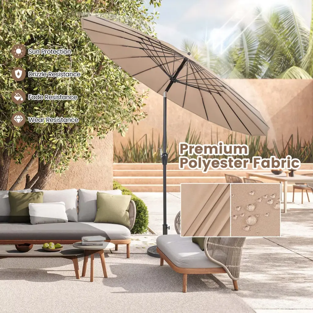 Provide a Large Shading Area for Your Outdoor Enjoyment! This 9 ft outdoor patio umbrella offers spacious coverage for a set of furniture, so you can enjoy leisure time with friends or family in the beautiful garden, patio, or terrace, and it is also great to use beside the swimming pool or beach. And the tilting angle can be easily adjusted through the push button, therefore the umbrella could block the sun from different directions, providing a cool shade area all the time. More than that, it boasts 18 sturdy fiberglass ribs and a heavy-duty powder-coated aluminum pole, which are built to withstand the elements and provide long-lasting durability. Besides, the canopy is made of premium polyester fabric, which is drizzle-resistant, sun-protection, and heat-insulation, providing better protection outdoors. Thanks to the convenient crank handle, it is easy to open and close the umbrella by rotating the handle. And with its 2-section structure, you can detach the umbrella for space-saving storage when not in use. Whether for residential or commercial use, our large double-sided market table umbrella can be a perfect choice!Features18 heavy-duty fiberglass ribs provide exceptional sturdiness and stability The aluminum pole is rustproof and can withstand outdoor bad elements Adopts push-button tilt design, easy to tilt from 0°- 30°, enjoying more shade Designed with a convenient crank handle for easy opening and closing The umbrella is divided into 2 parts, easy to connect through a combination button Made of high-quality polyester fabric, fade-resistant, wear and tear-resistant, sturdy Designed with a vented top for air circulation and stability even on windy days Designed with umbrella caps on the top, making the umbrella more charming Features reinforced rib pockets, help resist tearing or rib damageColor: Tan/Navy/Wine/Turquoise Material: 180G Polyester Fabric, Fiberglass, Aluminum Overall Dimensions: 9 ft x 8.2 ft (Dia. x H) Height of the Umbrella Edge: 6.6 ft Size of the Pole: 1.5" Net Weight: 12 lbs Package Includes: 1 x Patio Umbrella 1 x User's Manual