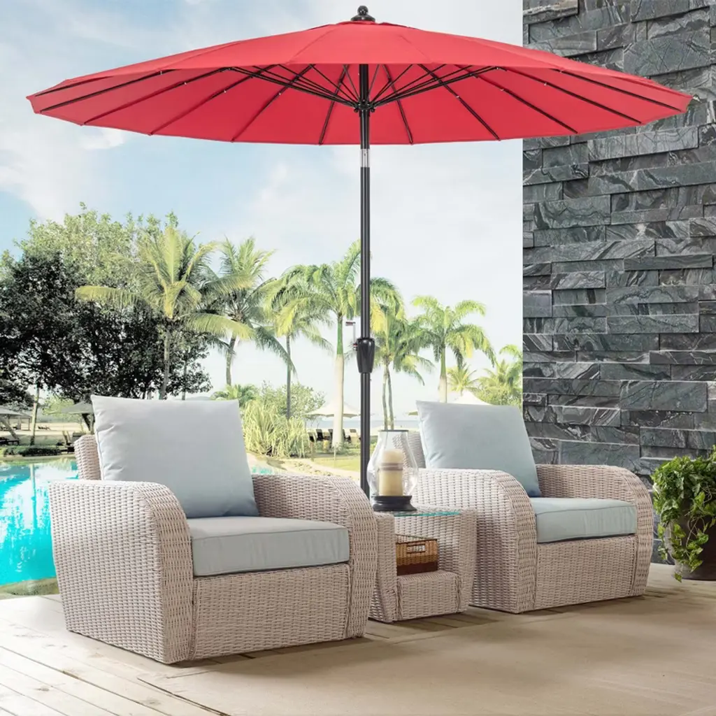 Provide a Large Shading Area for Your Outdoor Enjoyment! This 9 ft outdoor patio umbrella offers spacious coverage for a set of furniture, so you can enjoy leisure time with friends or family in the beautiful garden, patio, or terrace, and it is also great to use beside the swimming pool or beach. And the tilting angle can be easily adjusted through the push button, therefore the umbrella could block the sun from different directions, providing a cool shade area all the time. More than that, it boasts 18 sturdy fiberglass ribs and a heavy-duty powder-coated aluminum pole, which are built to withstand the elements and provide long-lasting durability. Besides, the canopy is made of premium polyester fabric, which is drizzle-resistant, sun-protection, and heat-insulation, providing better protection outdoors. Thanks to the convenient crank handle, it is easy to open and close the umbrella by rotating the handle. And with its 2-section structure, you can detach the umbrella for space-saving storage when not in use. Whether for residential or commercial use, our large double-sided market table umbrella can be a perfect choice!Features18 heavy-duty fiberglass ribs provide exceptional sturdiness and stability The aluminum pole is rustproof and can withstand outdoor bad elements Adopts push-button tilt design, easy to tilt from 0°- 30°, enjoying more shade Designed with a convenient crank handle for easy opening and closing The umbrella is divided into 2 parts, easy to connect through a combination button Made of high-quality polyester fabric, fade-resistant, wear and tear-resistant, sturdy Designed with a vented top for air circulation and stability even on windy days Designed with umbrella caps on the top, making the umbrella more charming Features reinforced rib pockets, help resist tearing or rib damageColor: Tan/Navy/Wine/Turquoise Material: 180G Polyester Fabric, Fiberglass, Aluminum Overall Dimensions: 9 ft x 8.2 ft (Dia. x H) Height of the Umbrella Edge: 6.6 ft Size of the Pole: 1.5" Net Weight: 12 lbs Package Includes: 1 x Patio Umbrella 1 x User's Manual