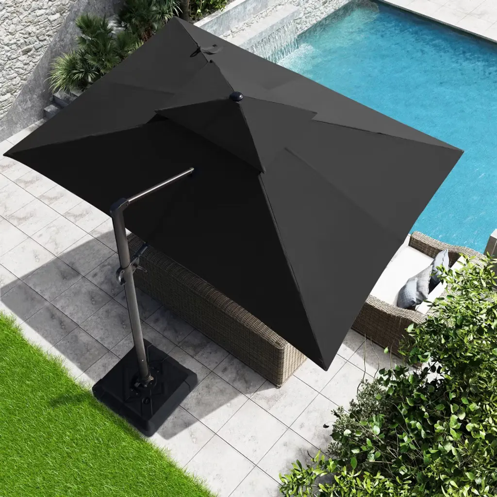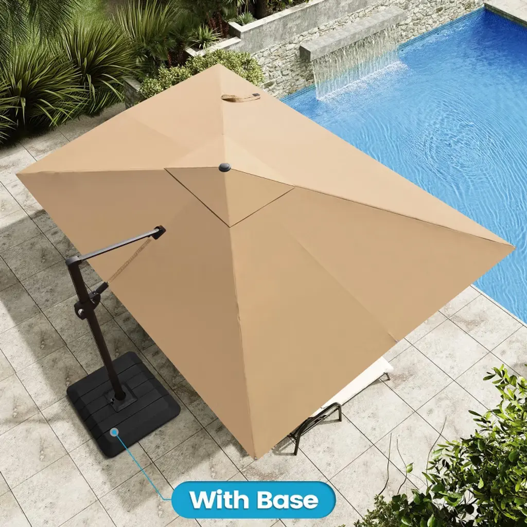 Our beautiful patio cantilever umbrella enables you to enjoy an outdoor relaxing time in the hot summer with great shade. Made of solid and durable metal parts, this outdoor offset umbrella can adapt to the harsh outdoor climate. The canopy which is made of durable polyester fabrics is waterproof and UV resistant. What's more, this offset umbrella opens and closes quickly and features 5 tilt positions to provide optimal shade any time of day. It's perfect for gardens, balconies, decks, swimming pools, or cafes.