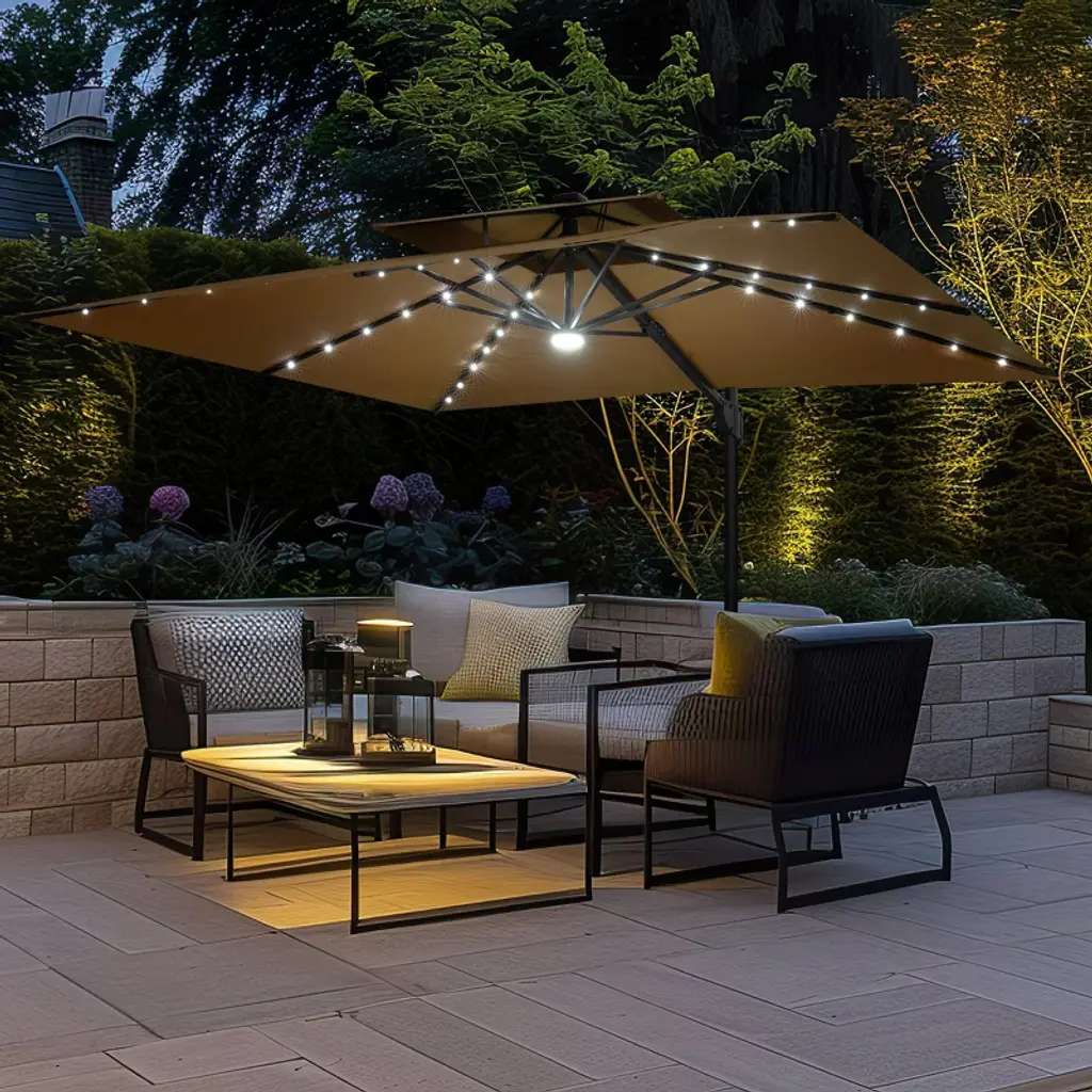 Our beautiful patio cantilever umbrella enables you to enjoy an outdoor relaxing time in the hot summer with great shade. Made of solid and durable metal parts, this outdoor offset umbrella can adapt to the harsh outdoor climate. The canopy which is made of durable polyester fabrics is waterproof and UV resistant. What's more, this offset umbrella opens and closes quickly and features 5 tilt positions to provide optimal shade any time of day. The new upgrade adds light beads inside the umbrella ribs. The battery capacity is 1600mah and can last for 5 hours. There are two charging methods: solar charging and type-c charging, which makes charging more convenient and lasts longer. It's perfect for gardens, balconies, decks, swimming pools, or cafes.