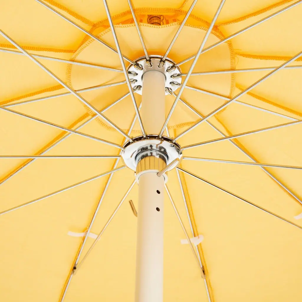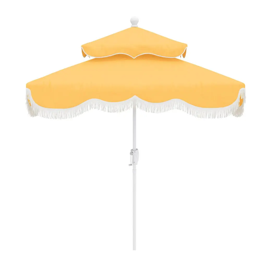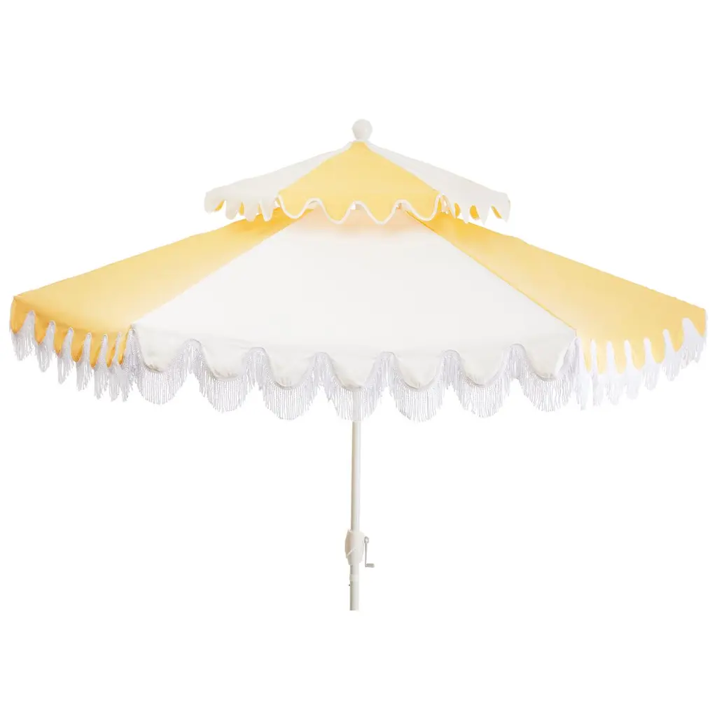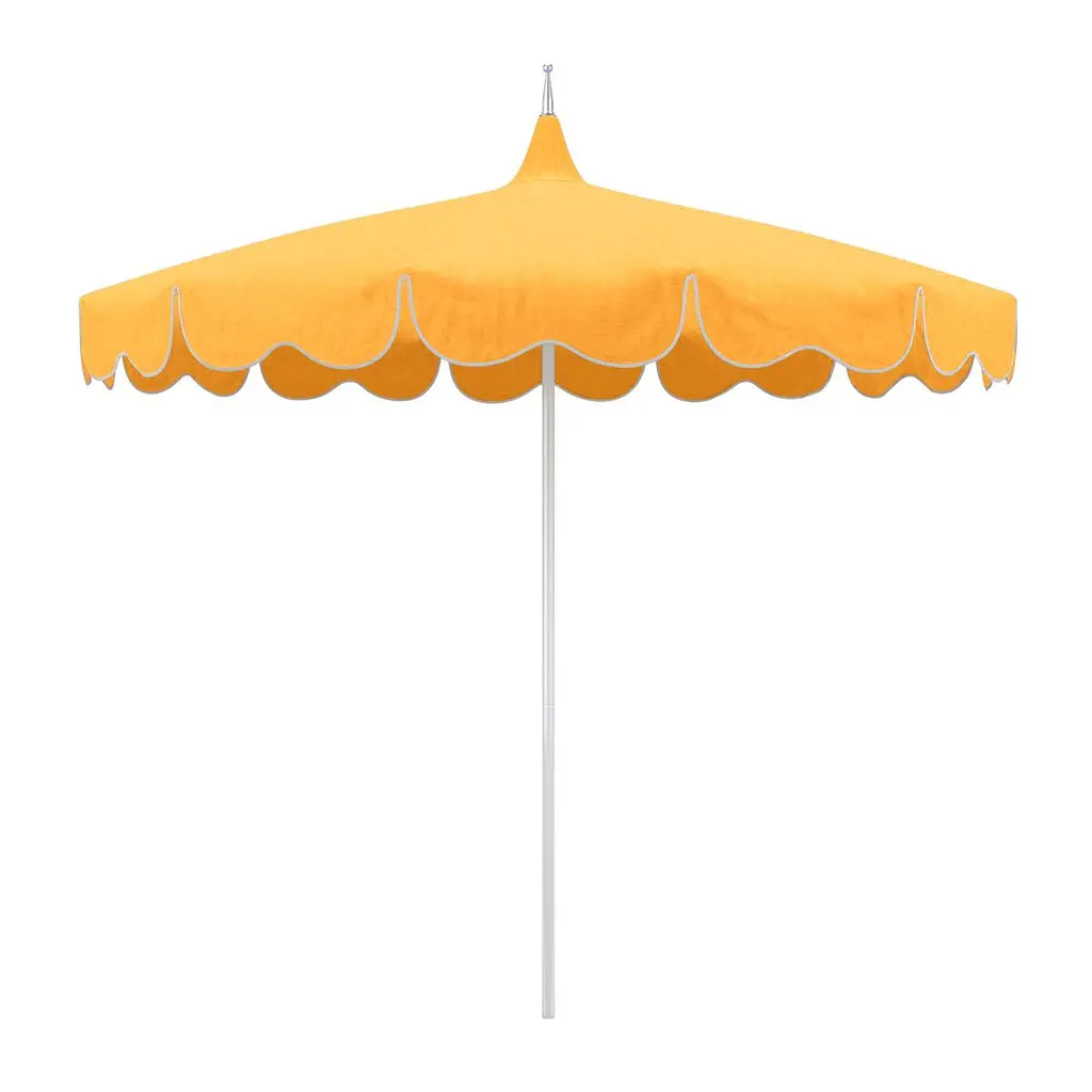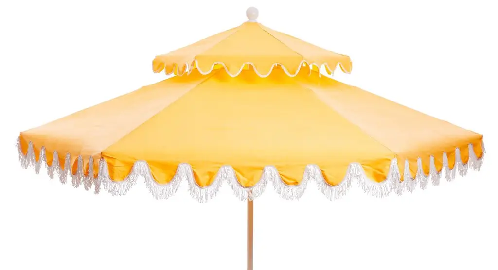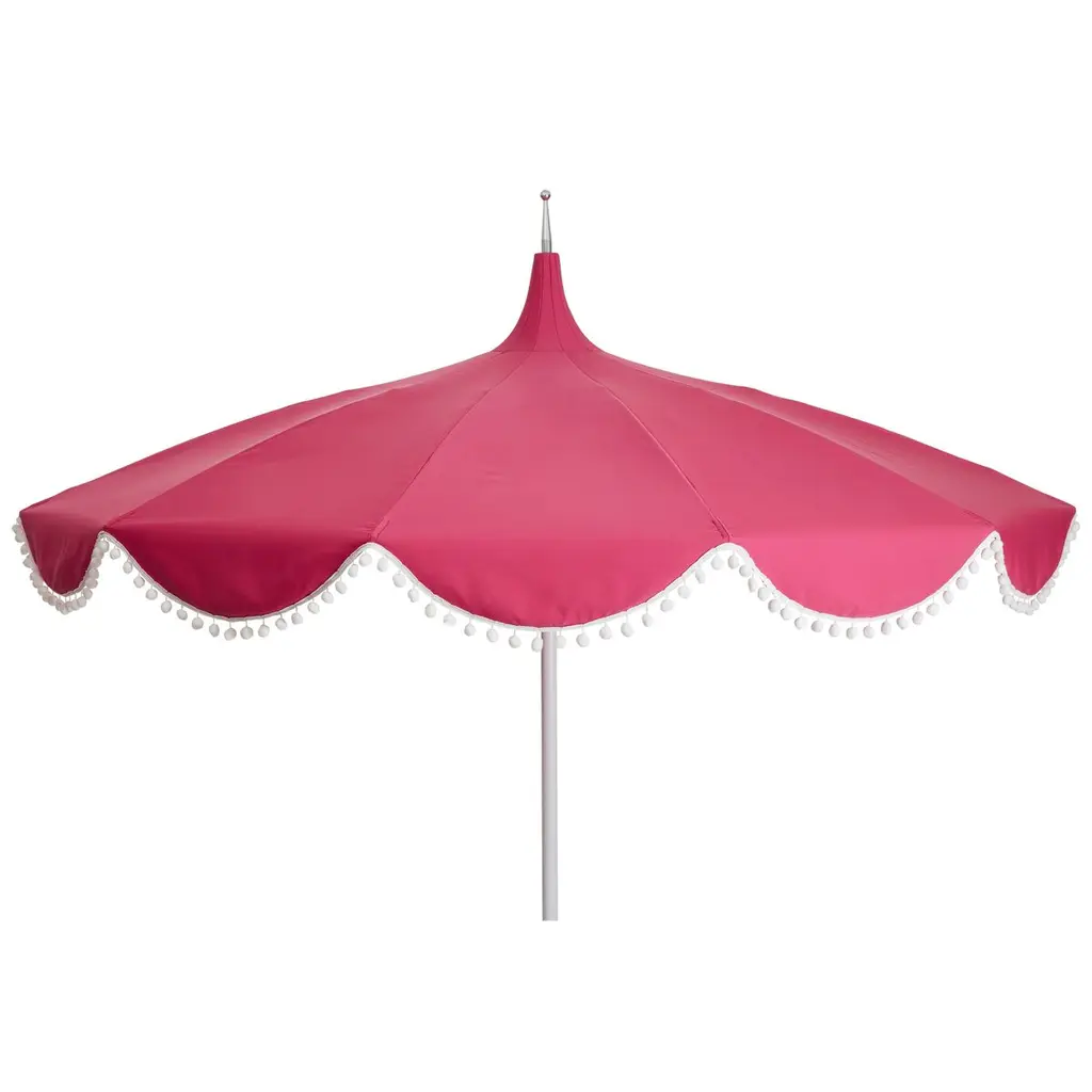Designed by us and available only at One Kings Lane: Whether you're entertaining or just lounging outdoors, catch some shade in style with this pagoda-style patio umbrella. Its canopy is crafted from durable Sunbrella acrylic to protect against the elements and accented with playful white pom-poms, while its frame is made using a combination of sturdy aluminum and zinc plated steel with a push-open pin stop. An umbrella base is not included but is required for use.
