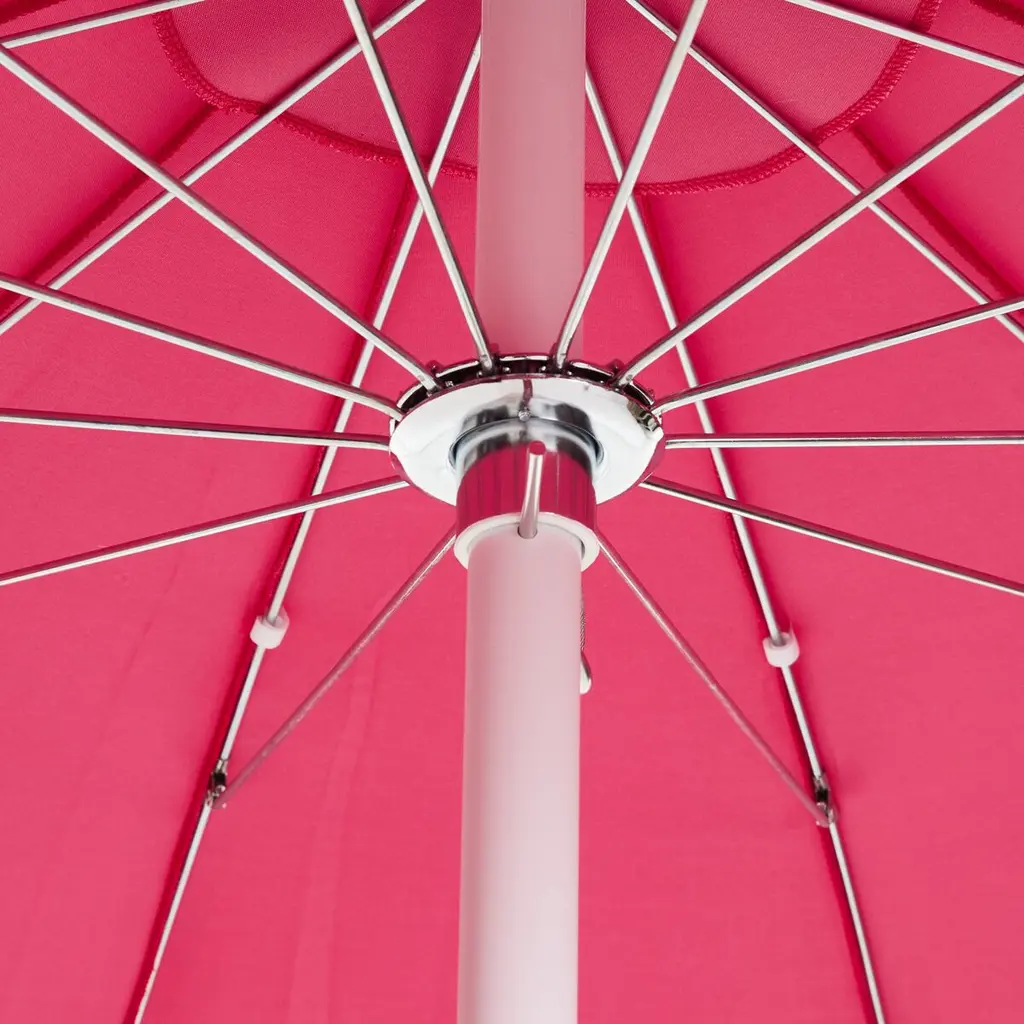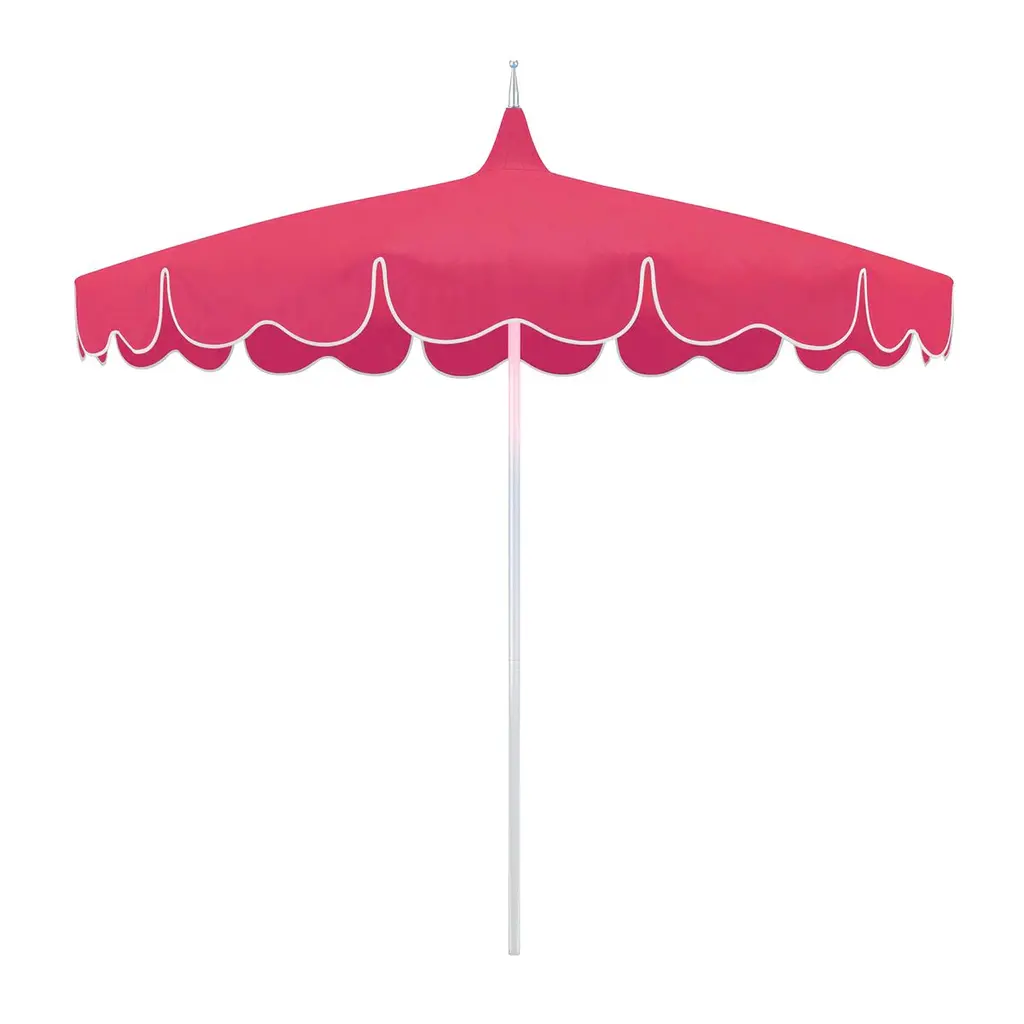 Designed by us and available only at One Kings Lane: Whether you're entertaining or just lounging outdoors, catch some shade in style with this pagoda-style patio umbrella. Its canopy is crafted from durable Sunbrella acrylic to protect against the elements and accented with playful white pom-poms, while its frame is made using a combination of sturdy aluminum and zinc plated steel with a push-open pin stop. An umbrella base is not included but is required for use.