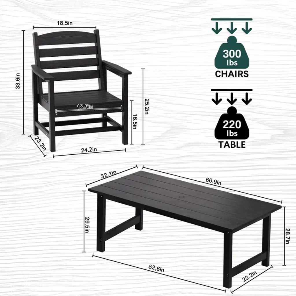 "Imagine: easy entertaining in your own backyard paradise! This premium 5-piece dining table set combines luxury and durability for unforgettable moments in the sun or under the stars. Constructed of high-density polyethylene (HDPE), this sturdy dining table can hold up to 220 pounds. Summer barbecues, Sunday brunches or romantic al fresco dinners are a breeze with this versatile set! Plus, it assembles in just minutes, so you can start making memories right away.