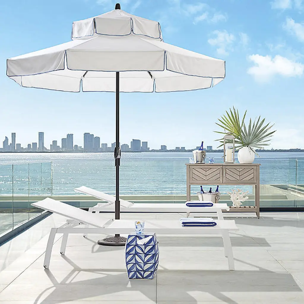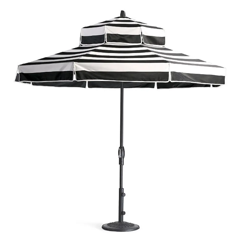 Accent your patio or poolside with an eye-catching design and superior UV protection. Our 9 ft. Double-Tier Designer Umbrella is made in the USA from Sunbrella fabric. The solution-dyed acrylic construction blocks 98% of the sun’s harmful rays and resists fading, staining, mold, dirt and mildew. The aluminum frame and pole feature a bronze finish and crank operation. Canopy: 100% Sunbrella® solution-dyed acrylic fabric Awarded the Seal of Recommendation by the Skin Cancer Foundation for providing up to 98% UV protection Resists fading, stains, mold, dirt and mildew Vented canopy allows hot air to circulate Spot clean with mild soap and water Allow wet canopy to dry in an open position before closing Always close umbrella when not in use and in inclement weather Frame and Pole: Aluminum frame is scratch- and rust-resistant Aluminum frame is fitted with a classic crank operation Bronze finish Stainless steel hardware 1-1/2-inch-diameter pole Treat areas subject to turning and sliding with a non-staining, silicone-based lubricant spray Can be used freestanding in a 50 lb. base or placed in a table Base is not included Assembly required Compatible with Frontgate umbrella tables and bases Made in USA A Frontgate exclusive. At Frontgate, our primary focus is quality. We guarantee that every product we sell will stand up to the supreme test – our customers' satisfaction. To learn more about our policies, visit our Shipping & Processing, Returns & Exchanges and Warranty & Price Guarantee pages. Accent your patio or poolside with an eye-catching design and superior UV protection. Our 9 ft. Double-Tier Designer Umbrella is made in the USA from Sunbrella fabric. The solution-dyed acrylic construction blocks 98% of the sun’s harmful rays and resists fading, staining, mold, dirt and mildew. The aluminum frame and pole feature a bronze finish and crank operation. Canopy: 100% Sunbrella® solution-dyed acrylic fabric Awarded the Seal of Recommendation by the Skin Cancer Foundation for providing up to 98% UV protection Resists fading, stains, mold, dirt and mildew Vented canopy allows hot air to circulate Spot clean with mild soap and water Allow wet canopy to dry in an open position before closing Always close umbrella when not in use and in inclement weather Frame and Pole: Aluminum frame is scratch- and rust-resistant Aluminum frame is fitted with a classic crank operation Bronze finish Stainless steel hardware 1-1/2-inch-diameter pole Treat areas subject to turning and sliding with a non-staining, silicone-based lubricant spray Can be used freestanding in a 50 lb. base or placed in a table Base is not included Assembly required Compatible with Frontgate umbrella tables and bases Made in USA A Frontgate exclusive. At Frontgate, our primary focus is quality. We guarantee that every product we sell will stand up to the supreme test – our customers' satisfaction. To learn more about our policies, visit our Shipping & Processing, Returns & Exchanges and Warranty & Price Guarantee pages.