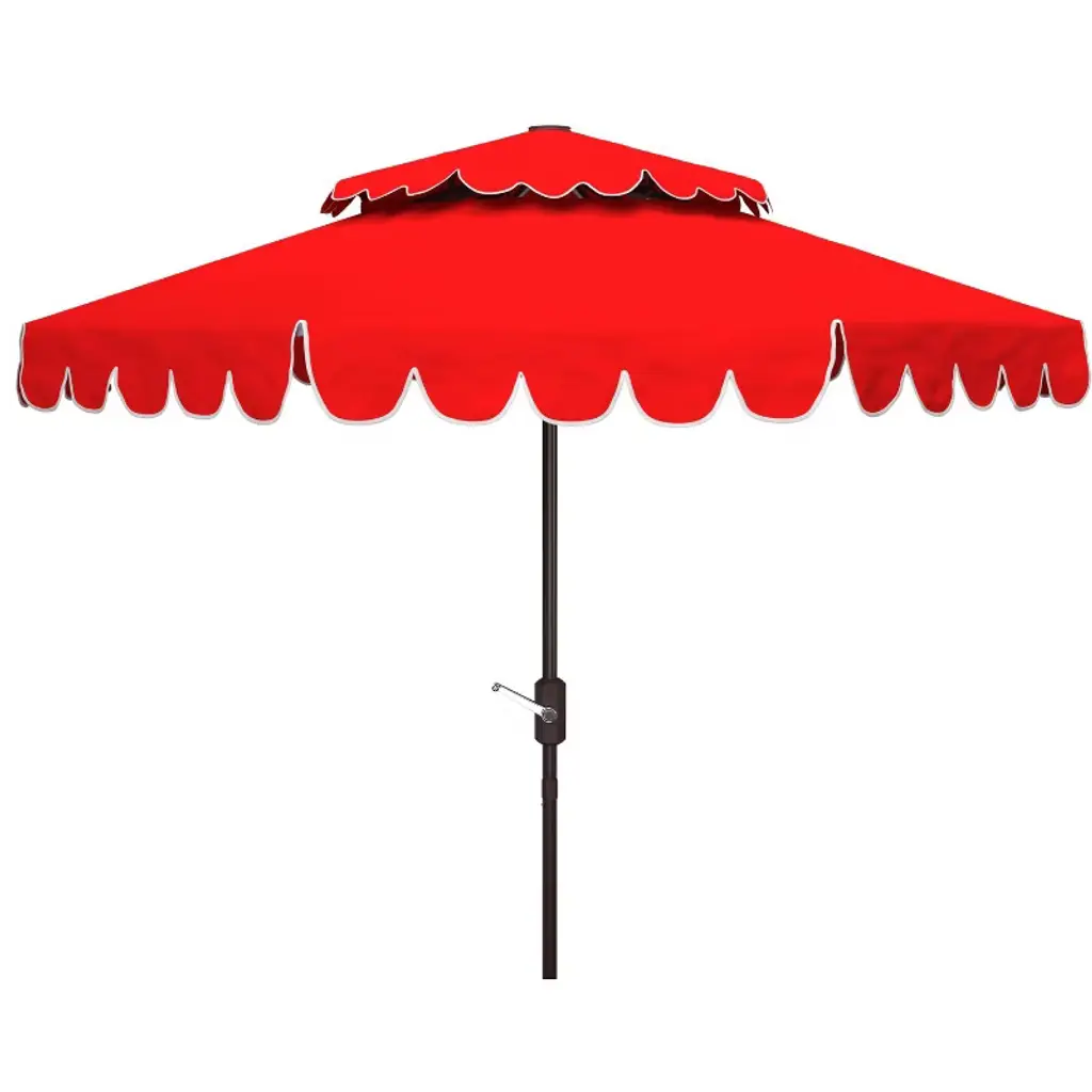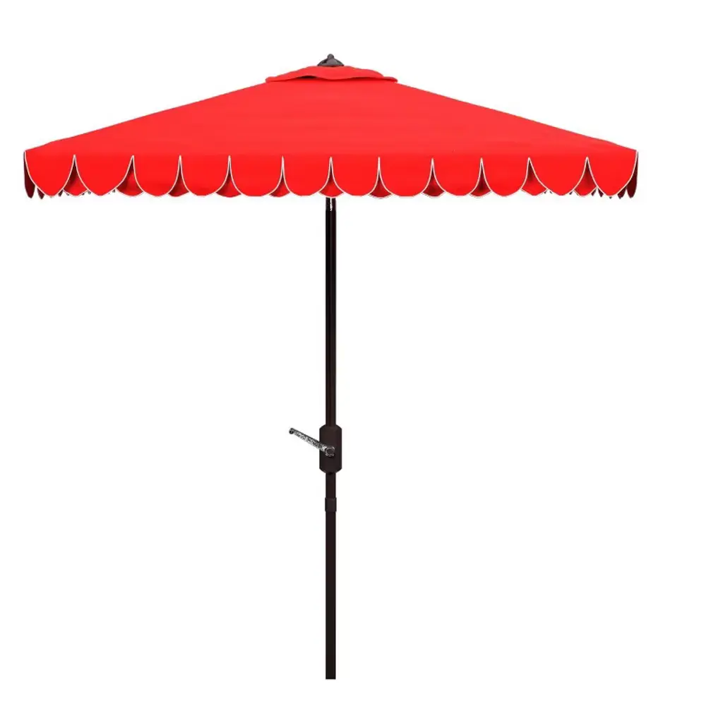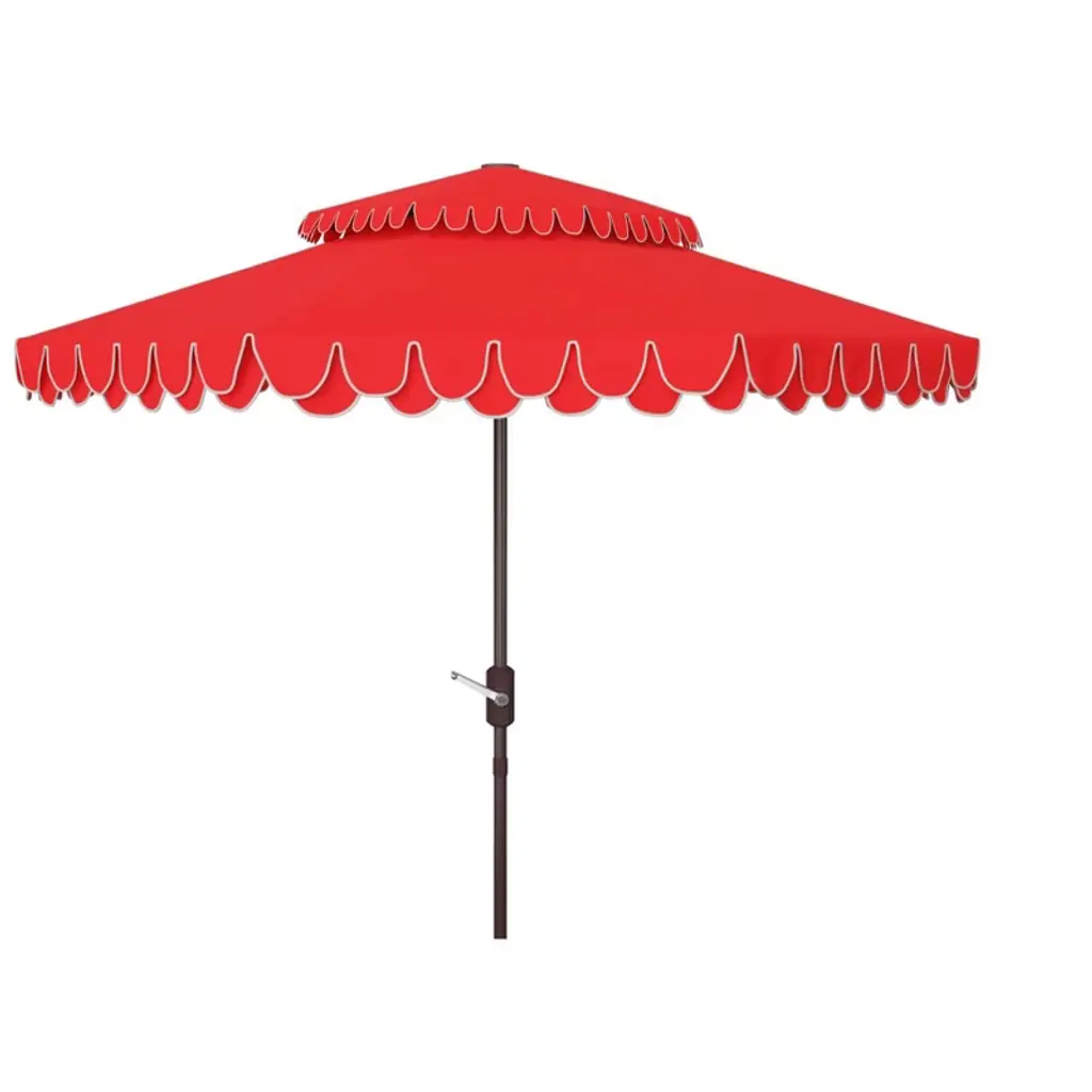 Offering a second home to jetsetters and cinema stars, a legendary beachside resort at Cannes inspired this elegant rectangleangular umbrella. With a double top and petal valance finished in cool red it recalls the inimitable red carpet glamour of the Cote d’Azure. Open Dimensions: 118.11" x 78.74" x 106.3" Closed Dimensions: 6.1" x 106.3" Care Instructions: Store outdoor furniture indoors or cover well when not in use. Remove wooden furniture from standing water. Dust regularly with small brush or vacuum. Spills should be taken care of immediately before they harden or stain with a slightly dampened sponge. Do not use bleach solutions.