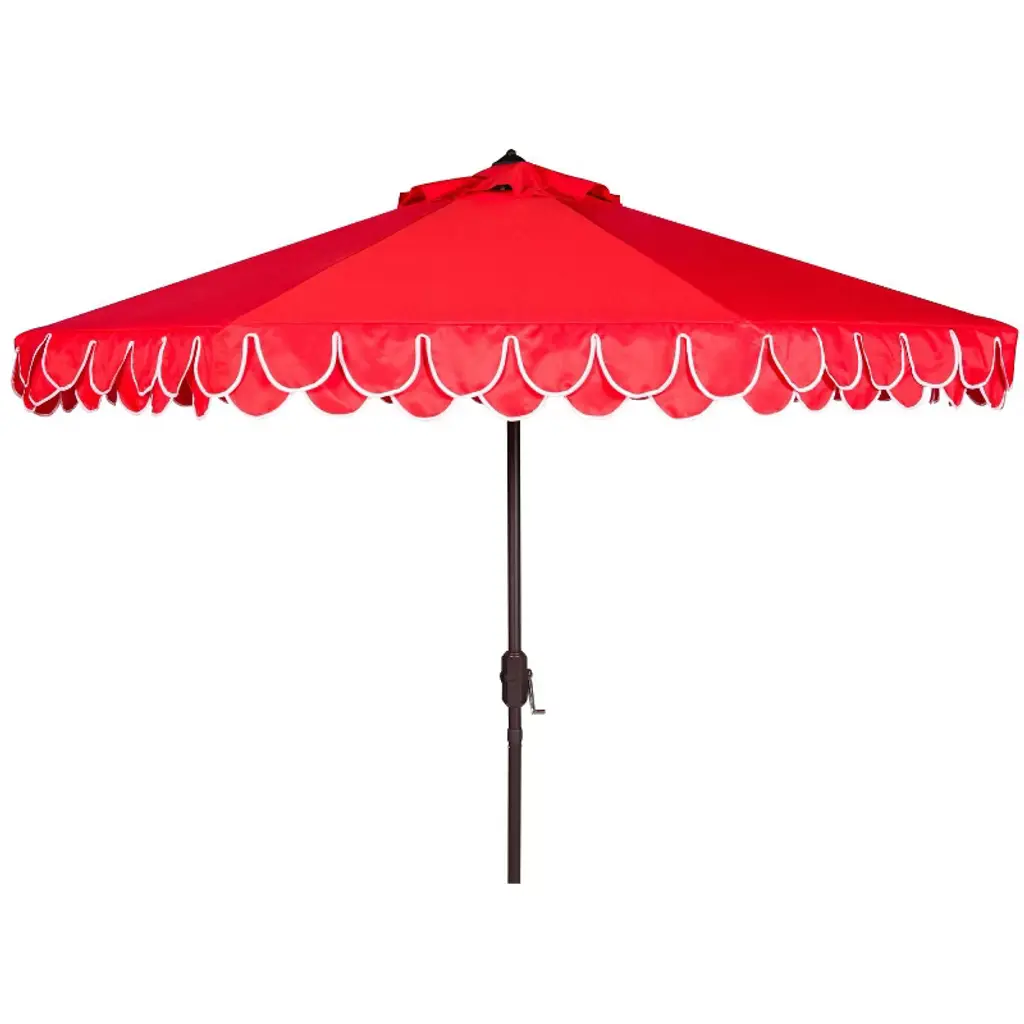 Offering a second home to jetsetters and cinema stars, a legendary beachside resort at Cannes inspired this elegant round eleven foot umbrella. With a petal valance finished in smart red, it recalls the inimitable red carpet glamour of the Cote d’Azure. Open Dimensions: 130" x 105.51" Closed Dimensions: 6.1" x 105.51" Care Instructions: Store outdoor furniture indoors or cover well when not in use. Remove wooden furniture from standing water. Dust regularly with small brush or vacuum. Spills should be taken care of immediately before they harden or stain with a slightly dampened sponge. Do not use bleach solutions.
