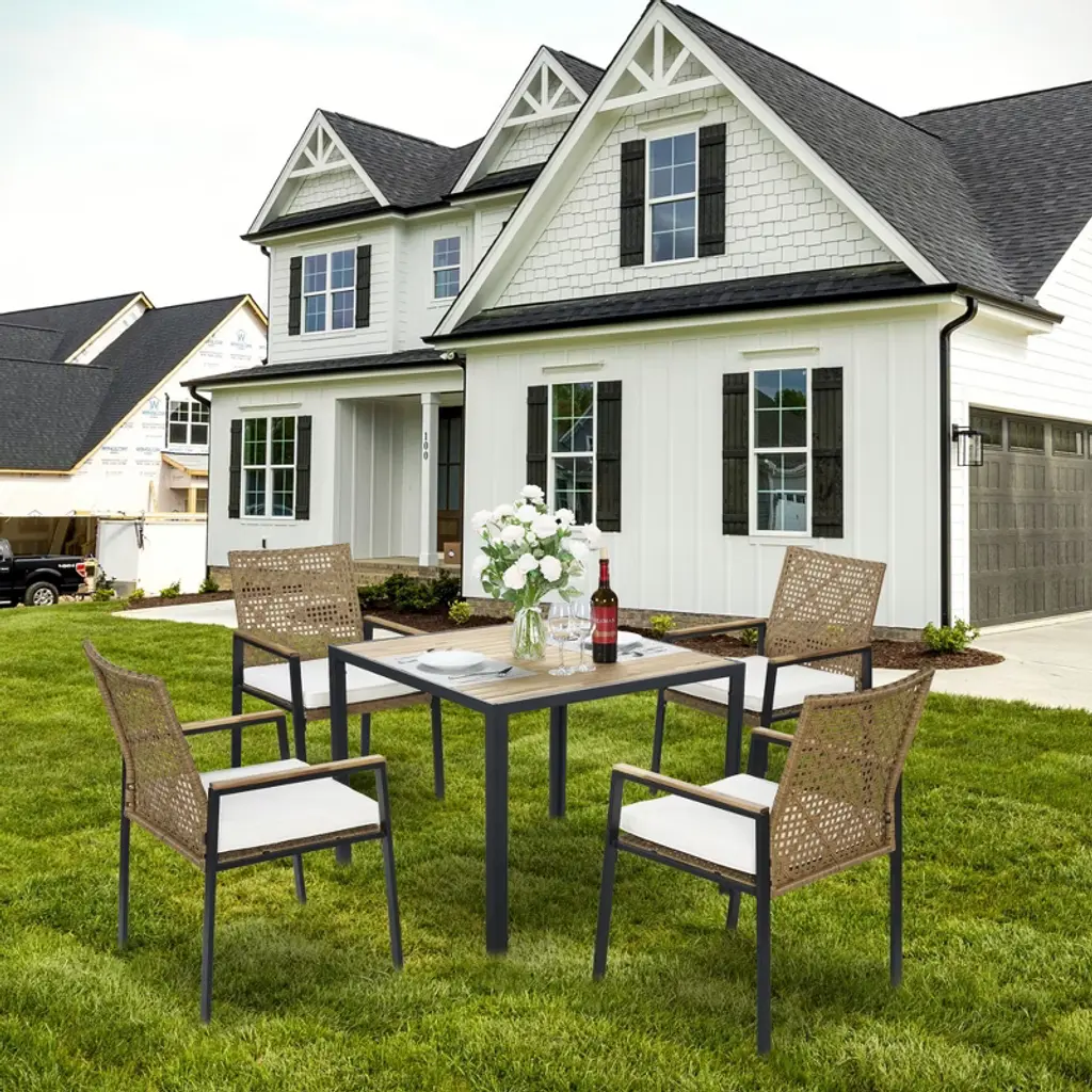 Eljget 5-piece Patio Dining Table Sets, All Weather Patio Conversation Set With Acacia Wood Table Top And Umbrella Hole, Rattan Outdoor, Yellow