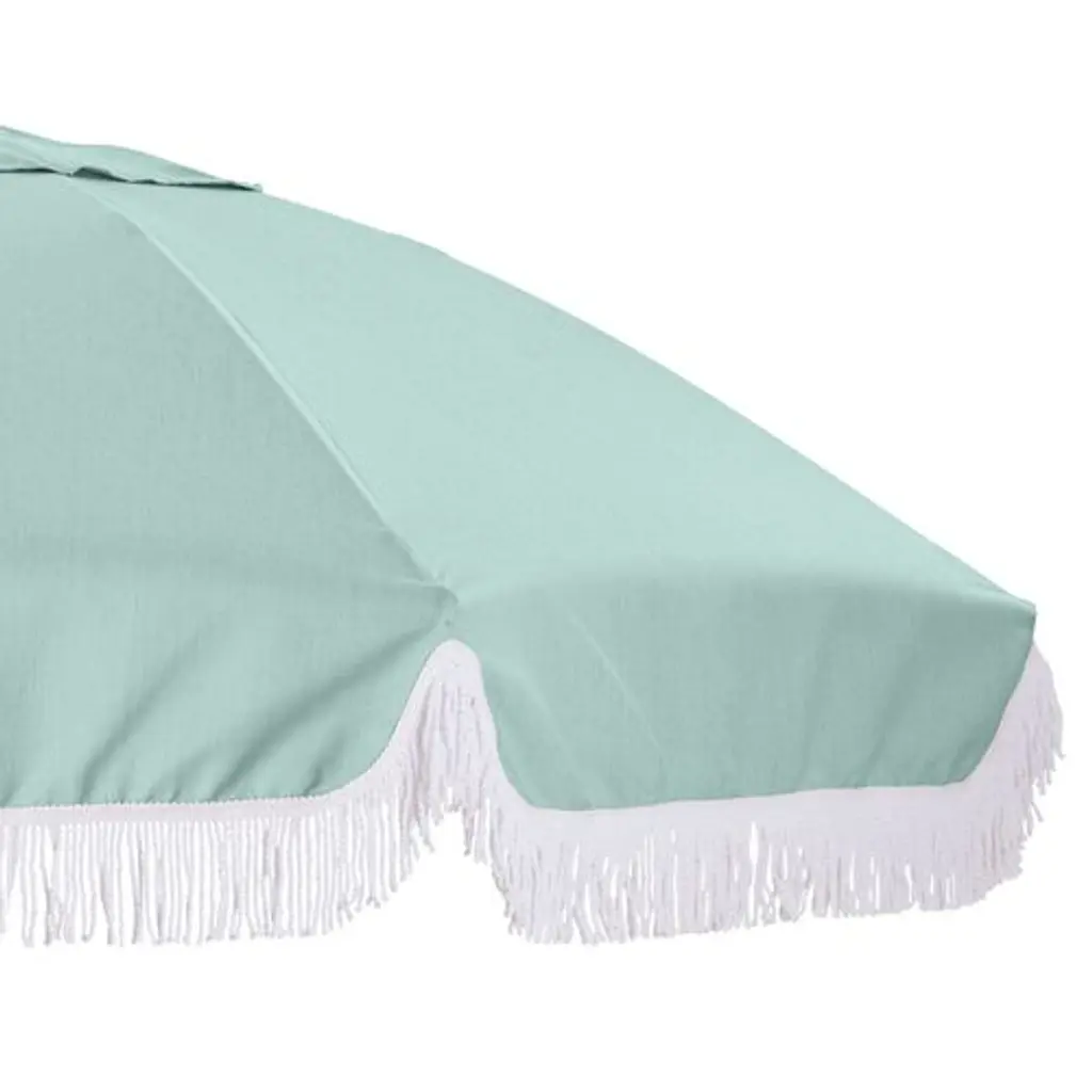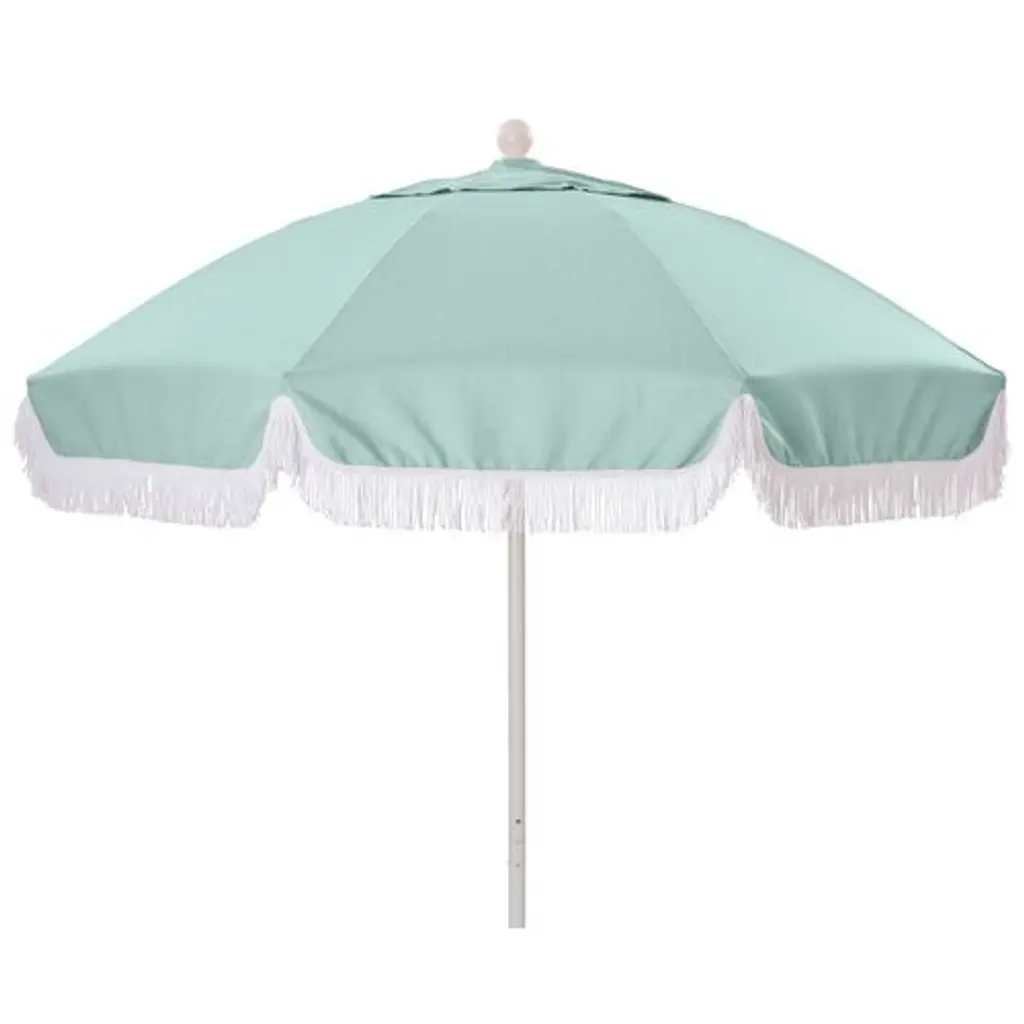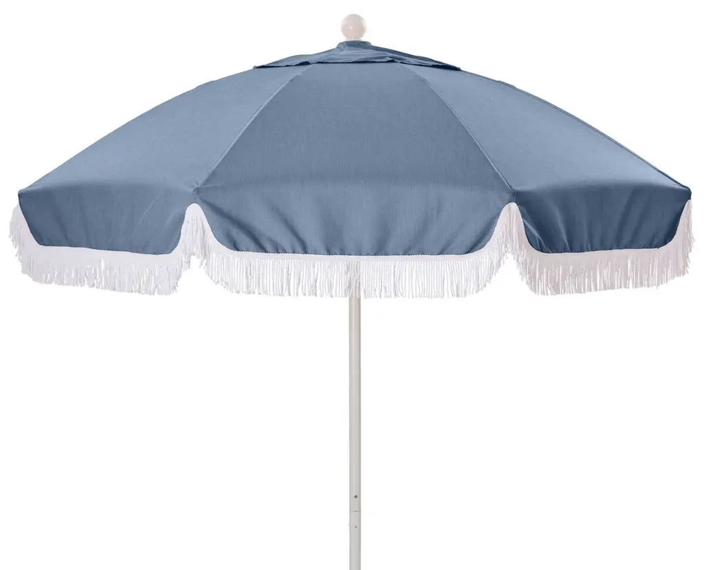 Exclusive to One Kings Lane: Whether you're entertaining or just lounging outdoors, catch some shade in style with this patio umbrella. Its fringed canopy is crafted from durable Sunbrella acrylic to protect against the elements, while its frame is crafted from a combination of sturdy aluminum and stainless steel with a push-open pin stop. An umbrella base is not included but is required for use.
